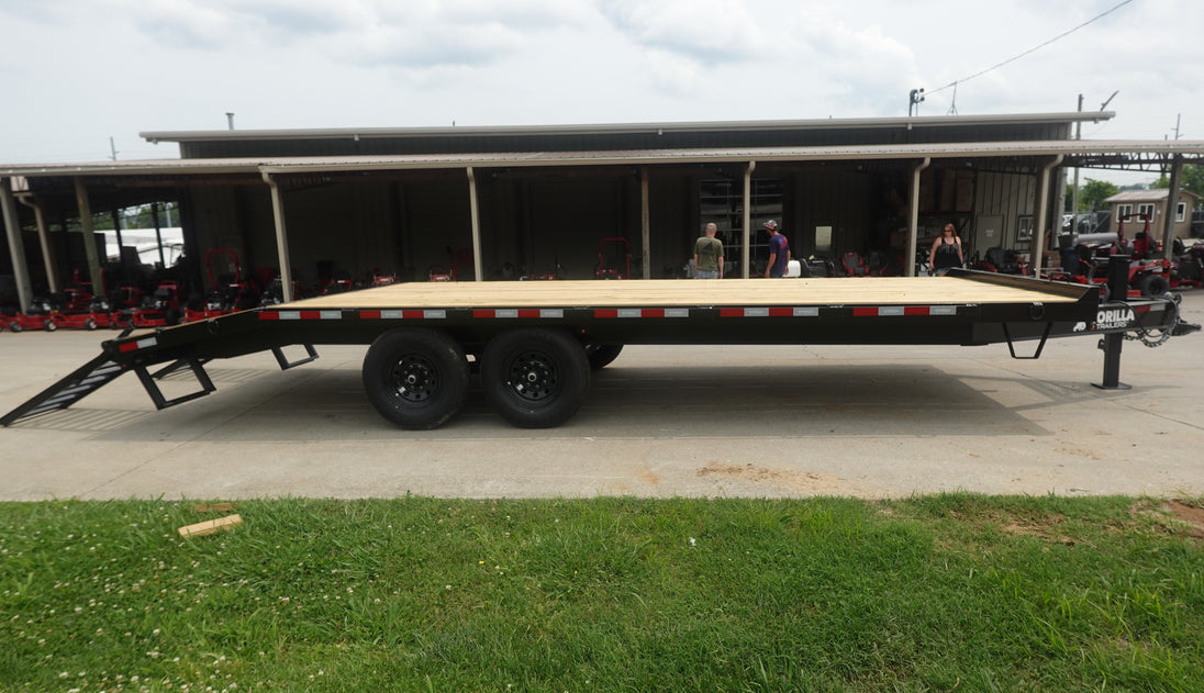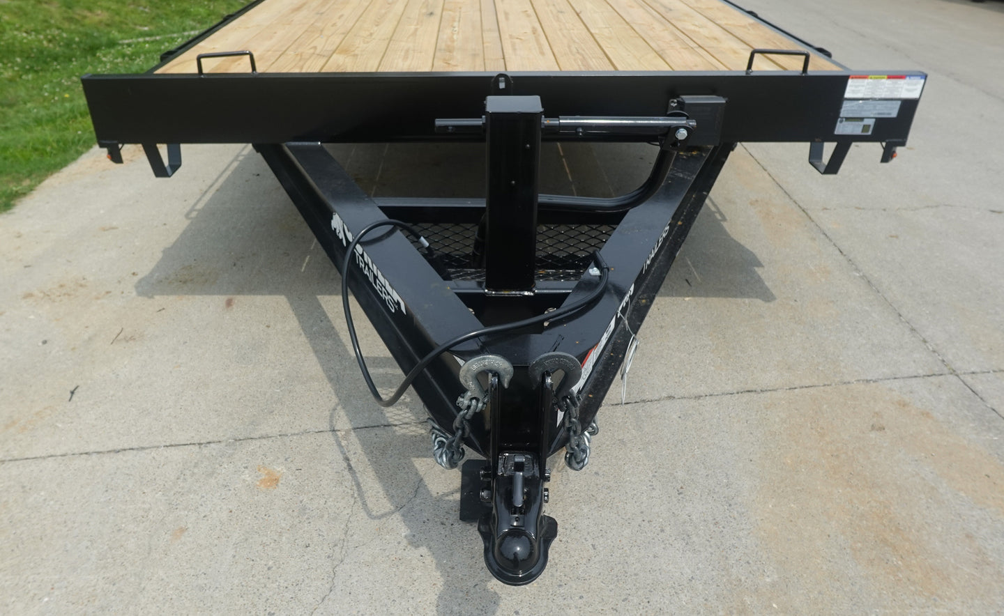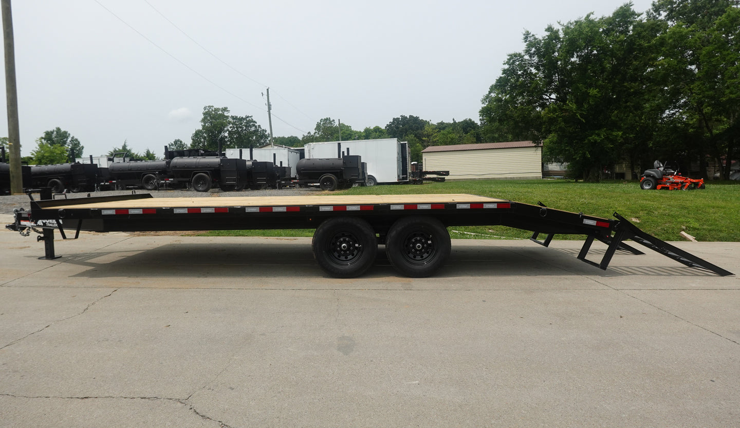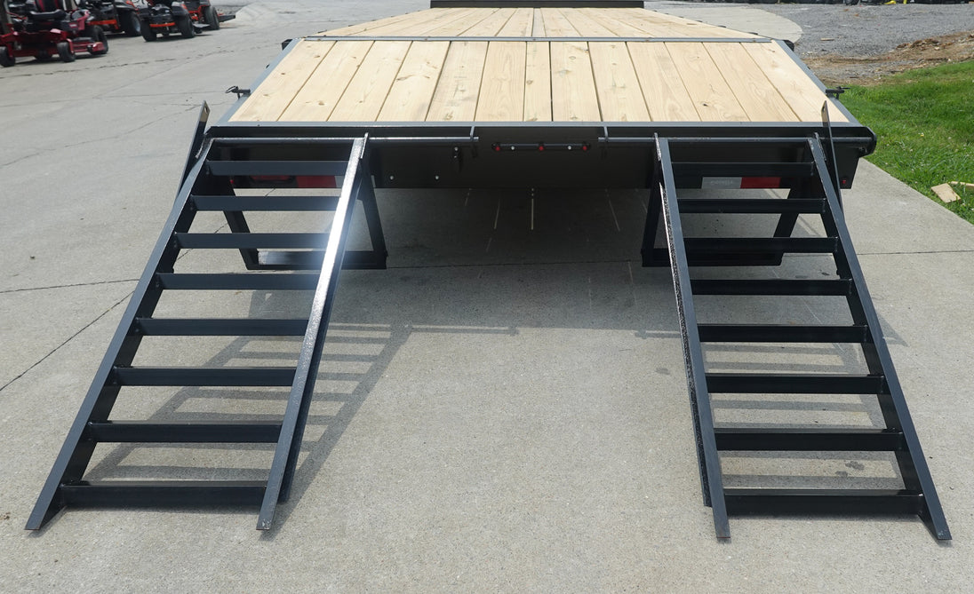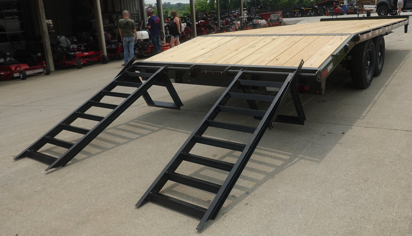 This heavy-duty equipment trailer is built with dual 7,000 lb. Dexter axles, an 8" I-Beam frame, 16" Kenda tires, stand-up ramps, Optronics LED lighting, and Sherwin-Williams powder coating.