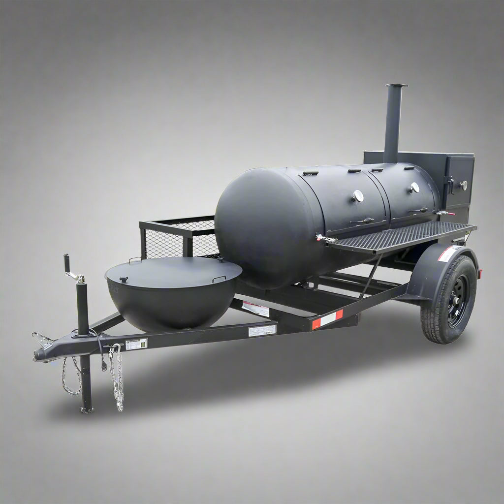 The 250-Gallon Pull Behind BBQ Smoker is designed for pitmasters, caterers, and BBQ professionals who need reliable performance and versatile cooking power. With a built-in round charcoal grill, large-capacity smoker chamber, and premium trailer components, this unit delivers consistent heat control, rugged durability, and the flexibility to smoke or grill with ease.