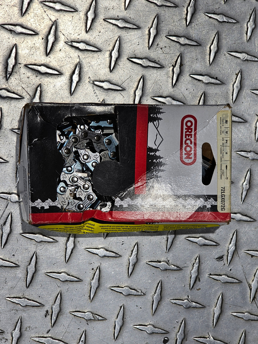 The Oregon 72LGX072G Powercut Saw Chain offers high-performance cutting, enhanced by patented steel for durability, blued cutters for corrosion resistance, and improved grind geometry for faster performance.