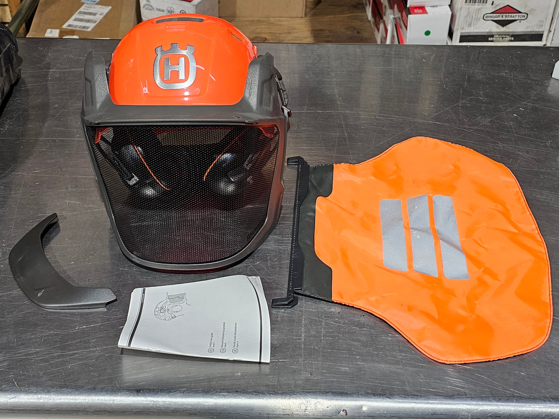 The Husqvarna 588646001 Technical Forest Helmet provides full professional protection with an adjustable fit, mesh visor, hearing guards, and high-visibility design.