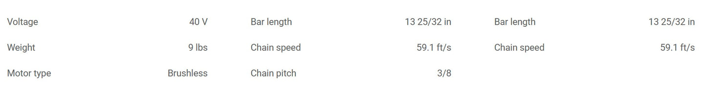 The 13-25/32" bar and 3/8" pitch chain offer clean, smooth cuts across branches, limbs, and small trees—ideal for landscape pros and property owners.