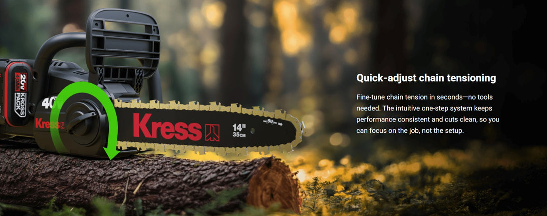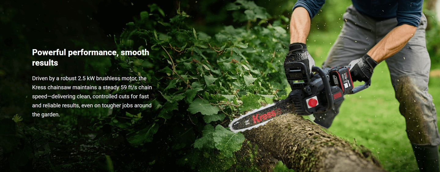 The Kress KG346.9 40V chainsaw delivers gas-like performance with a 2.5 kW brushless motor and 59 ft/s chain speed. It features tool-free chain tensioning, automatic lubrication, and a padded D-handle for comfort. Built-in chain brake ensures safety. Compatible with all KrossPack 40V batteries.