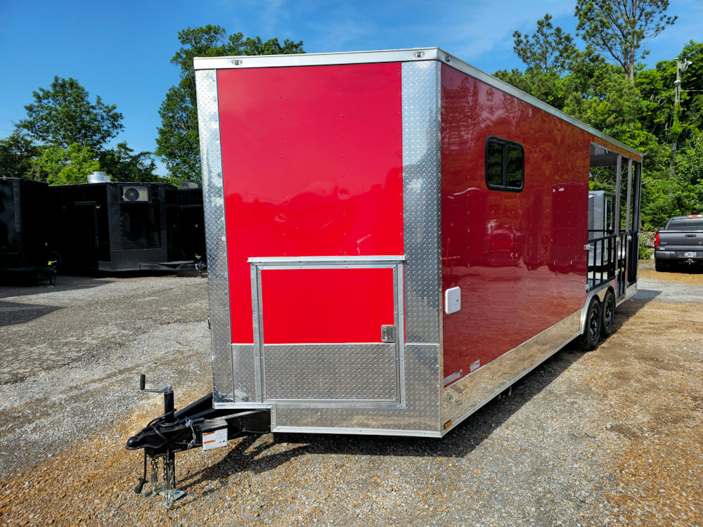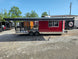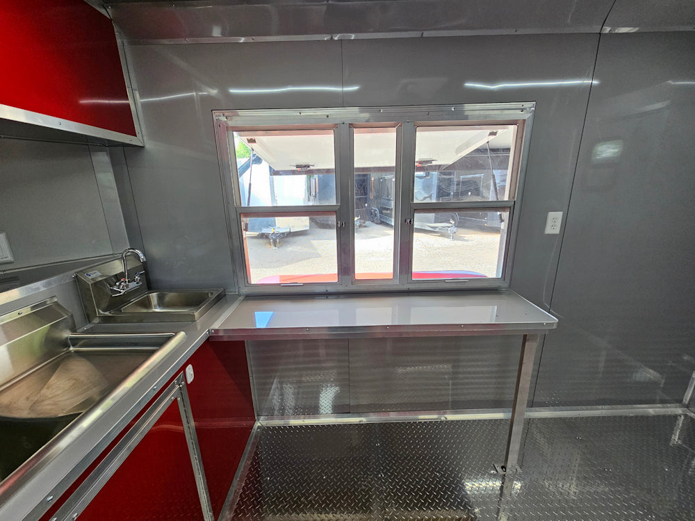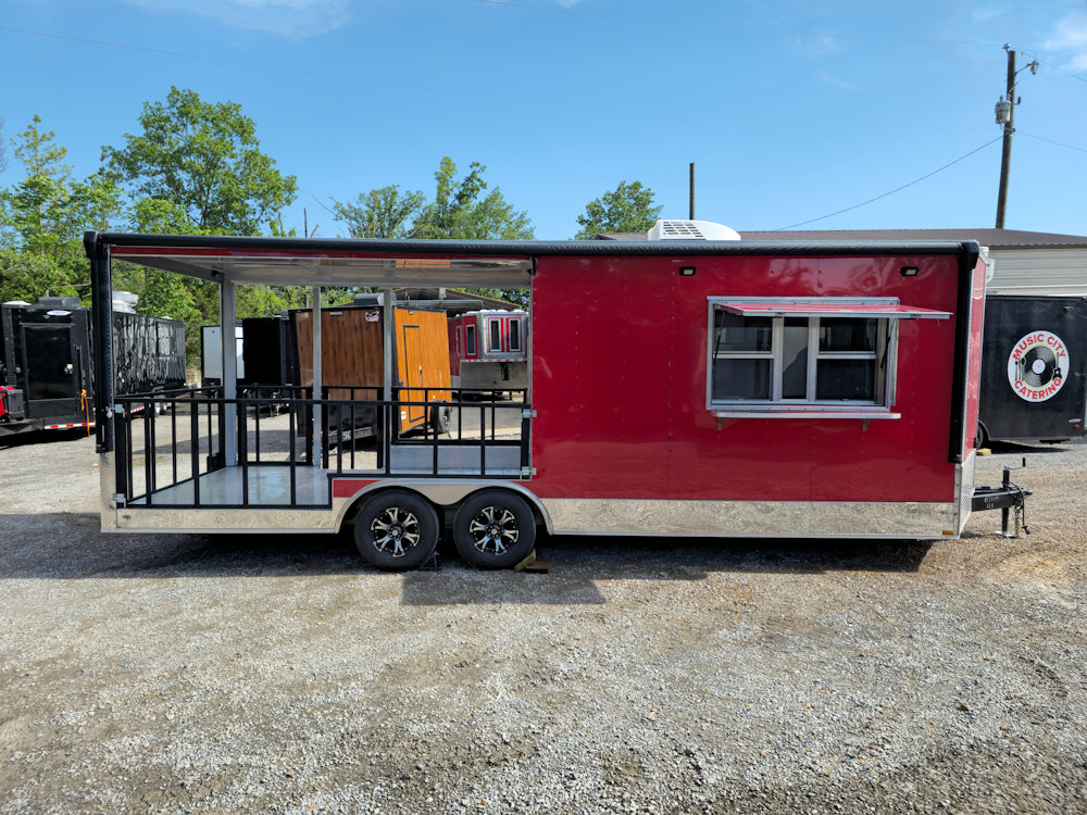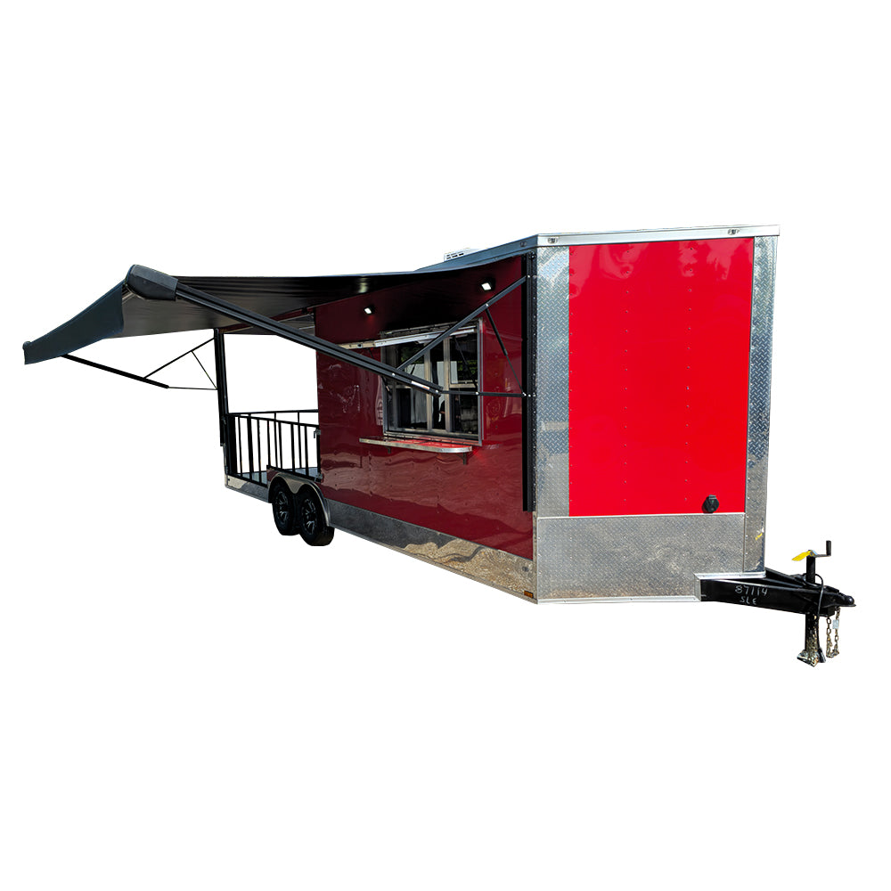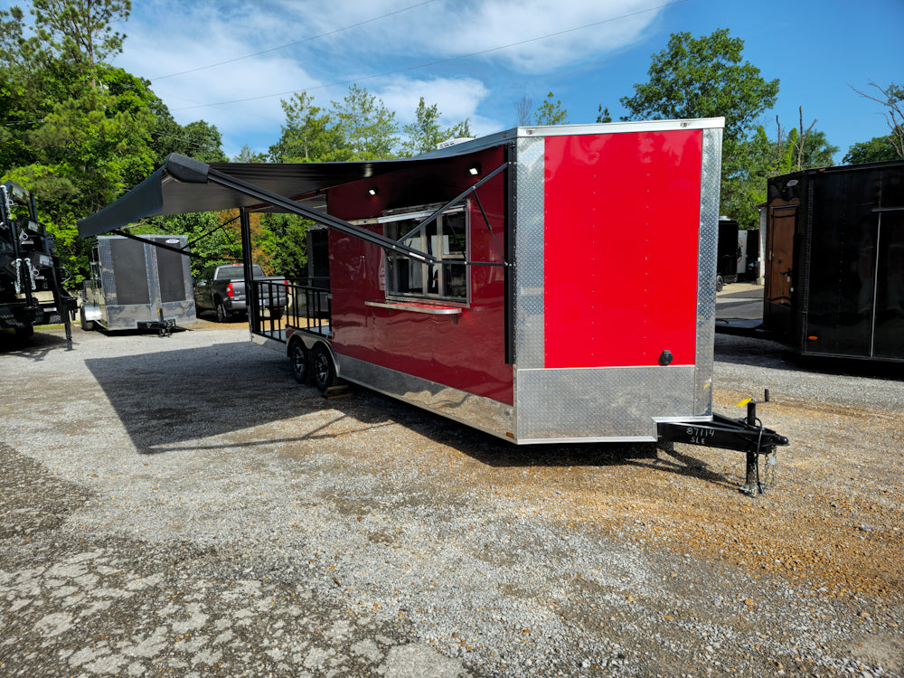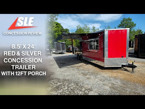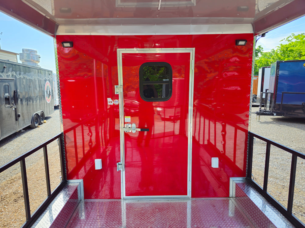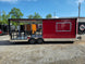 This 8.5' x 24' red concession trailer with a 12' porch is designed for high-impact food service at events, festivals, and catering gigs. It features a spacious interior with 7.6' height, a 5' serving window, full sink package, A/C and heat, and a powerful 100 Amp electric system. The bold red exterior, rear porch with removable rails, and electric awning make it both functional and eye-catching.