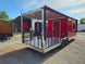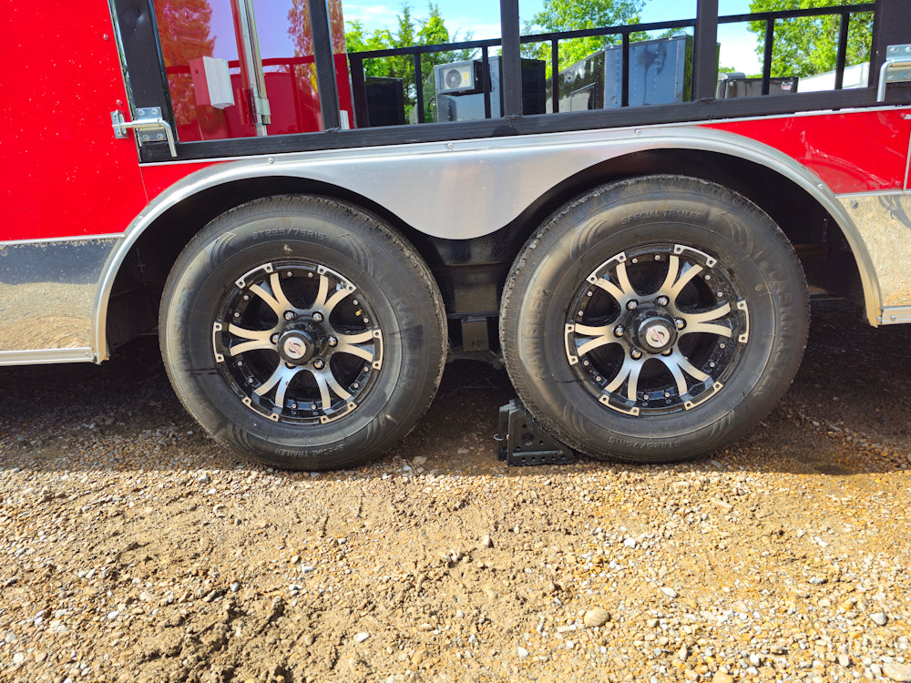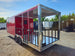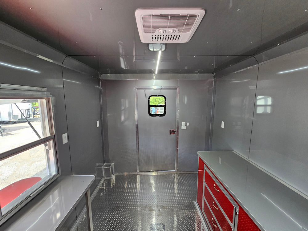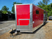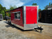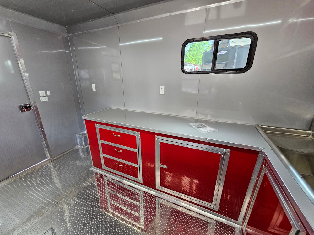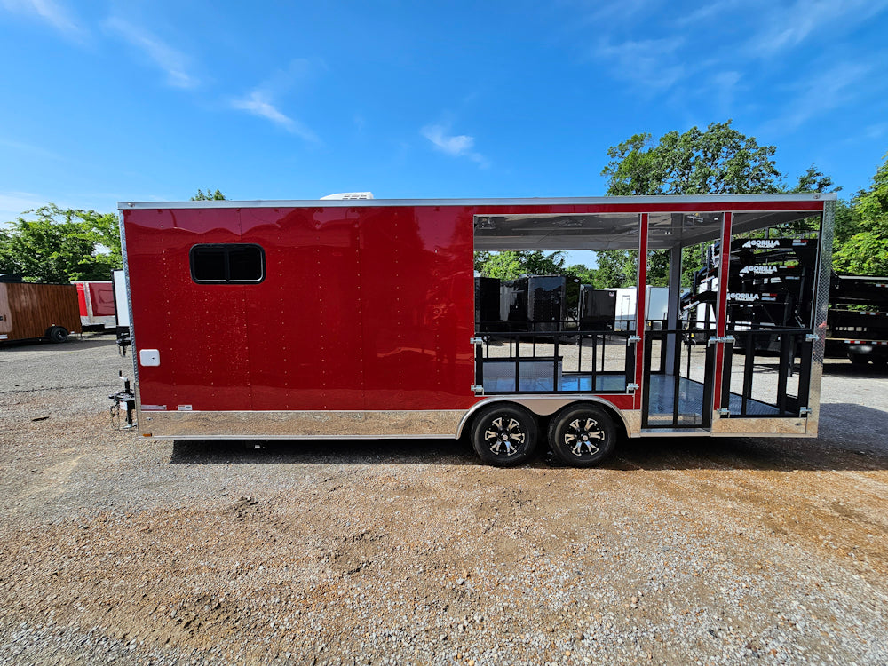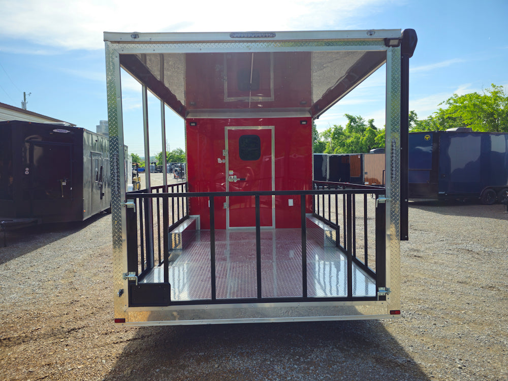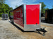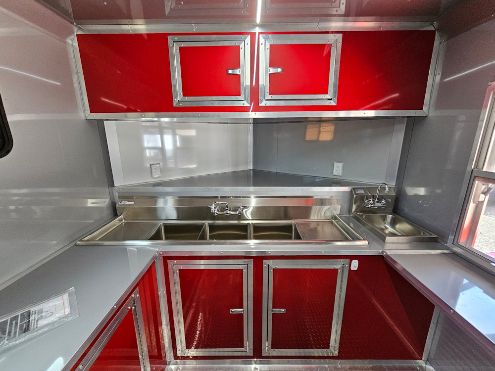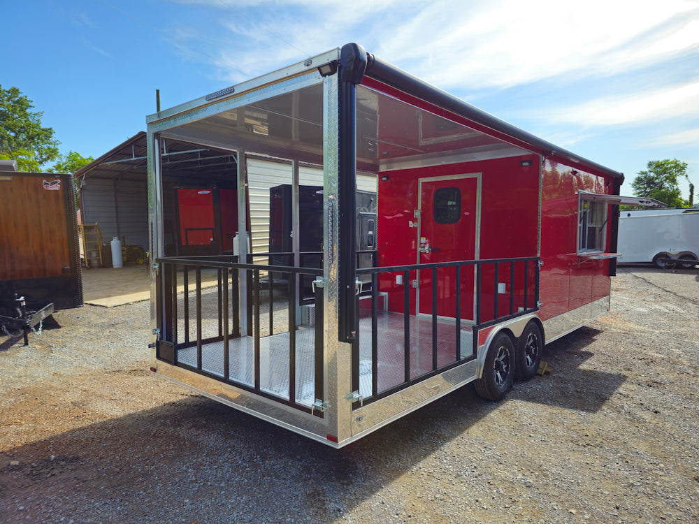 This 8.5' x 24' red concession trailer with a 12' porch is designed for high-impact food service at events, festivals, and catering gigs. It features a spacious interior with 7.6' height, a 5' serving window, full sink package, A/C and heat, and a powerful 100 Amp electric system. The bold red exterior, rear porch with removable rails, and electric awning make it both functional and eye-catching.