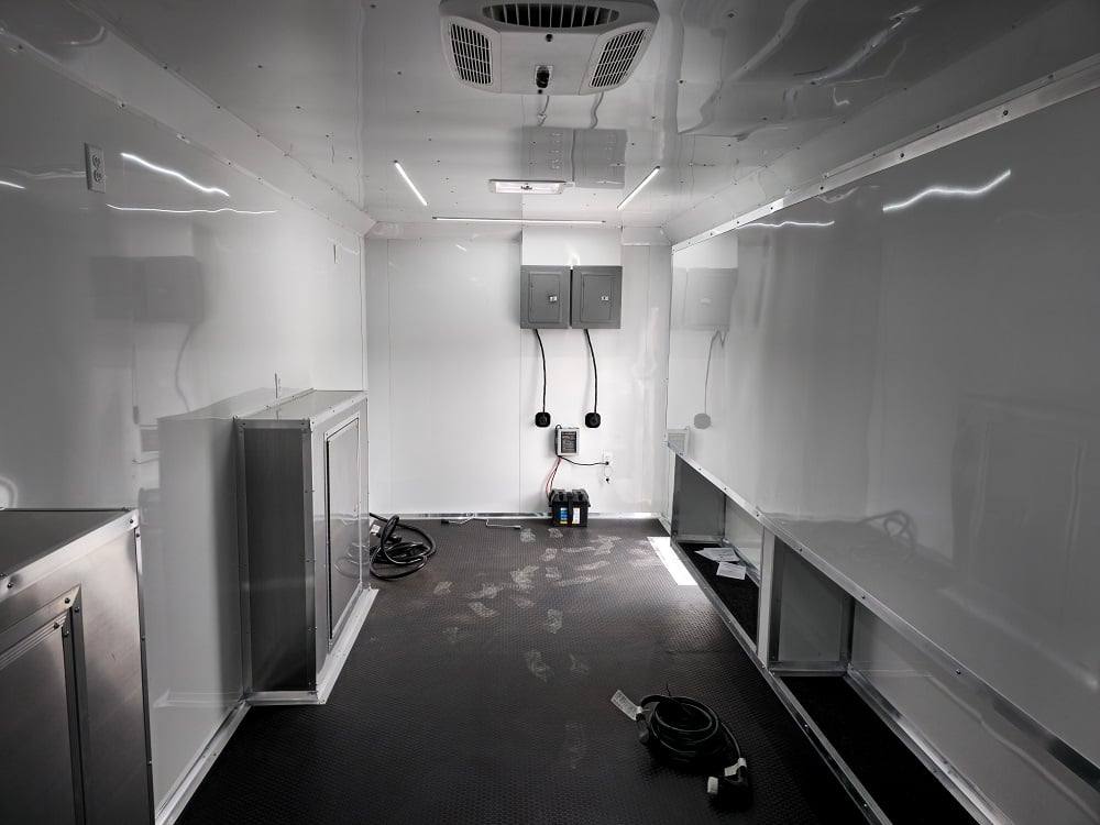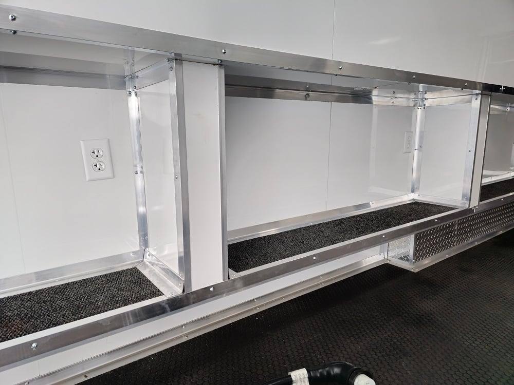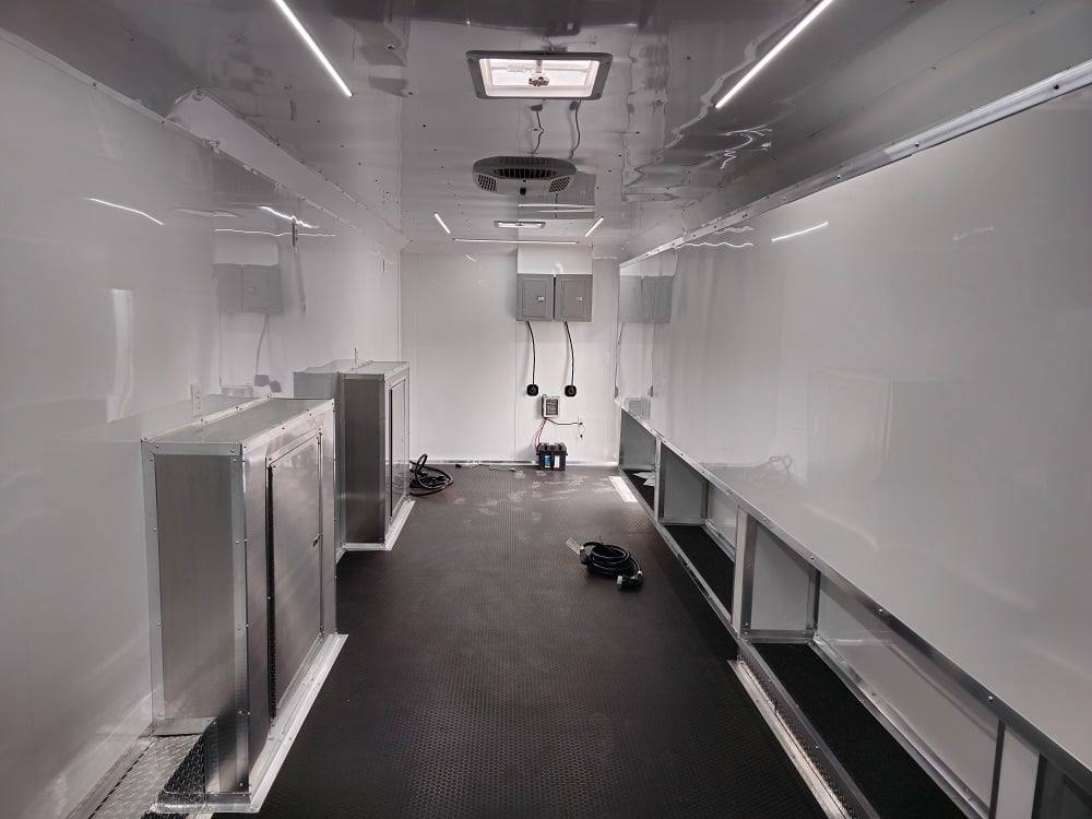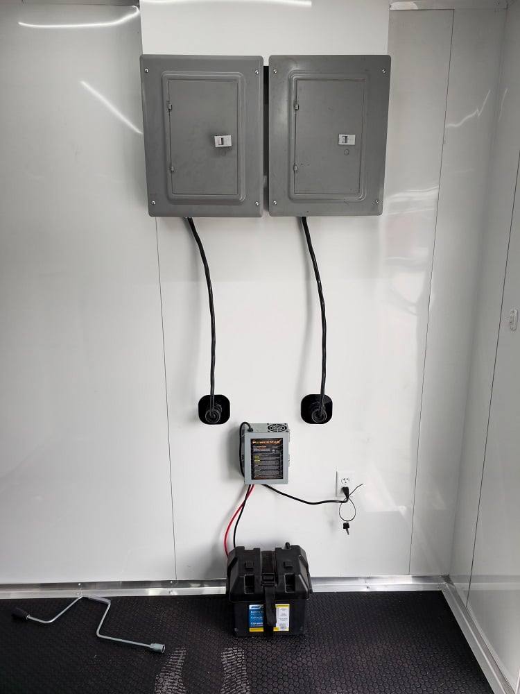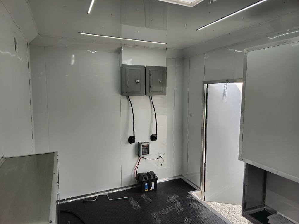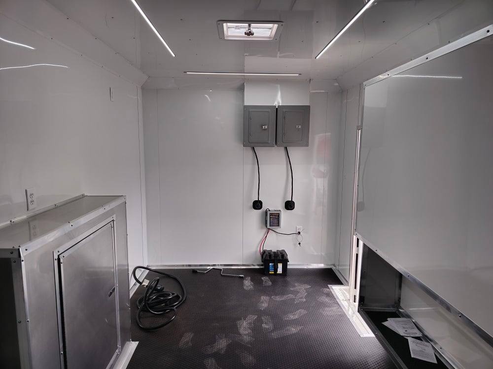 This trailer is designed for a video game/arcade-style setup offering plenty of areas for tv installations and console storage. This trailer features (2) 100amp power panels with (2) 50amp power cables for a combined total of 100amps of power.