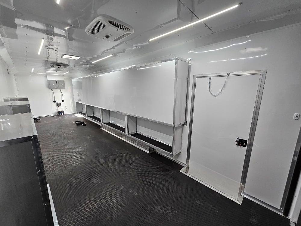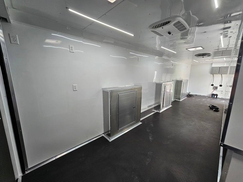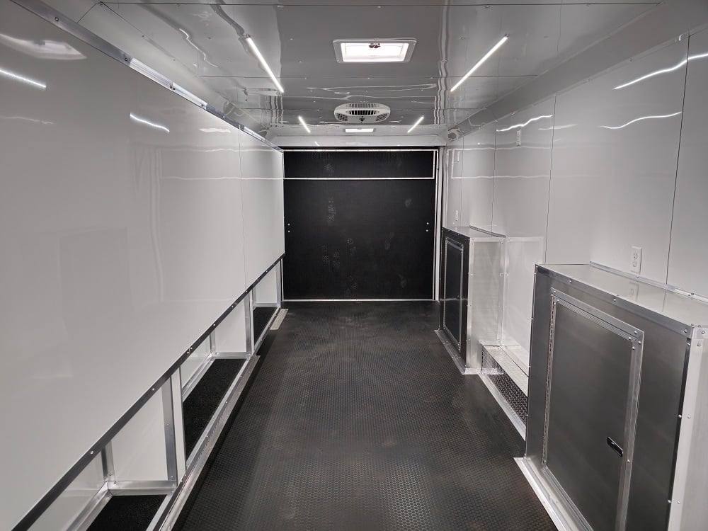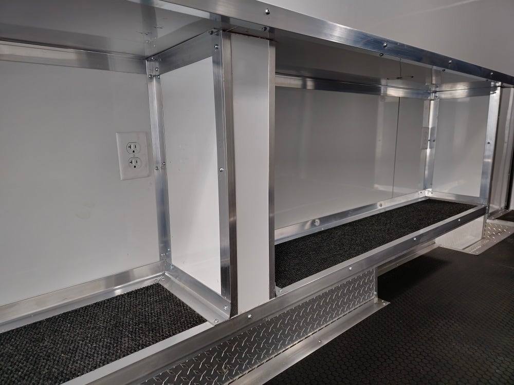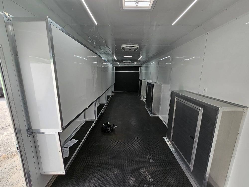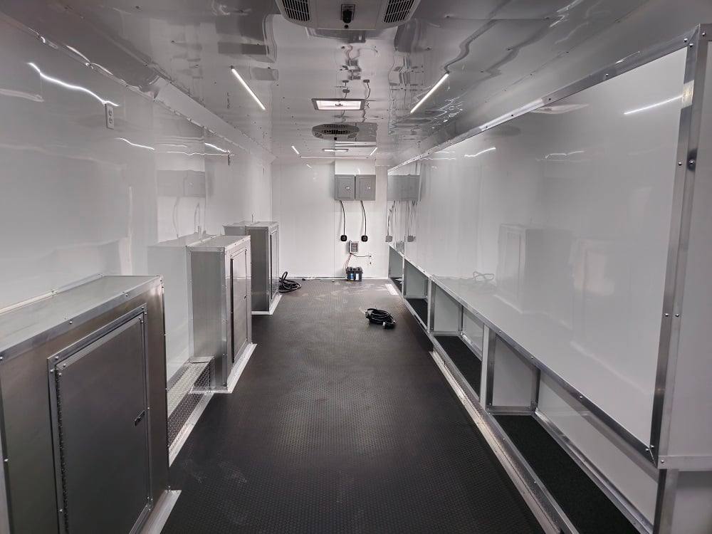 This trailer is designed for a video game/arcade-style setup offering plenty of areas for tv installations and console storage. This trailer features (2) 100amp power panels with (2) 50amp power cables for a combined total of 100amps of power.