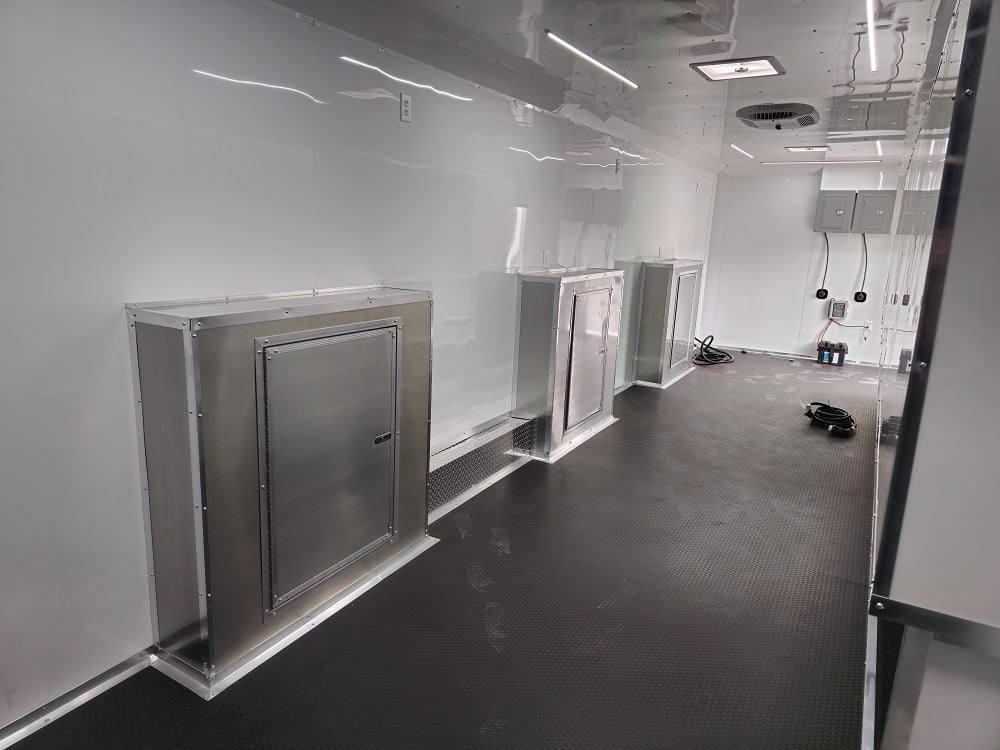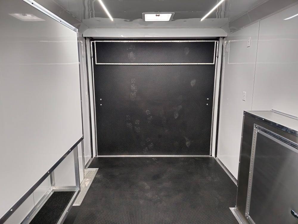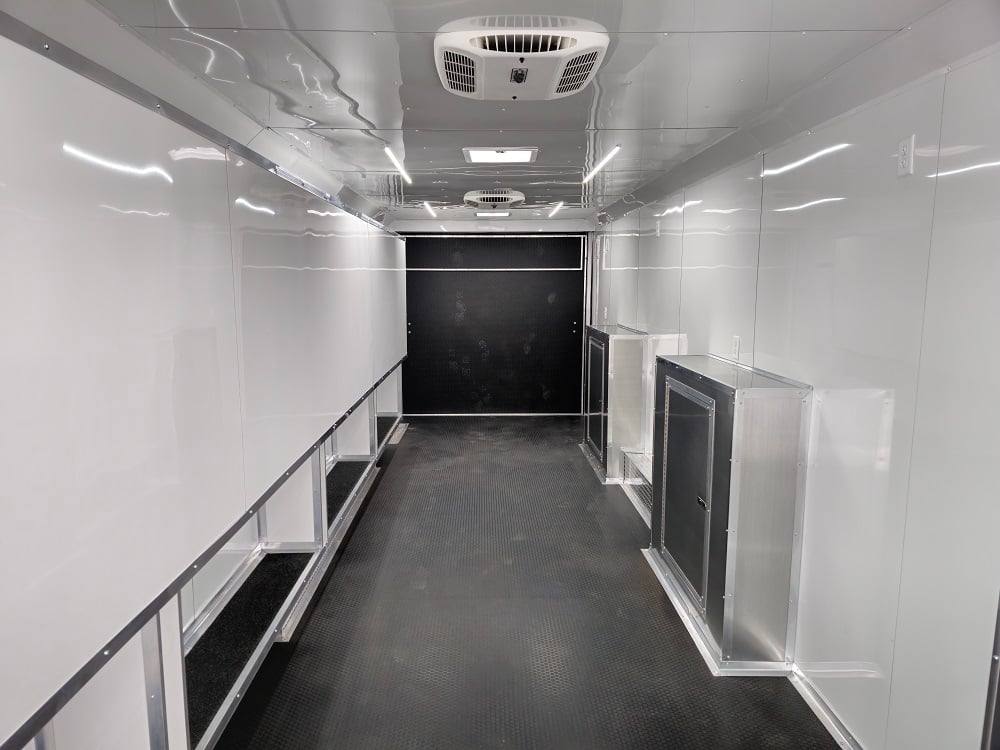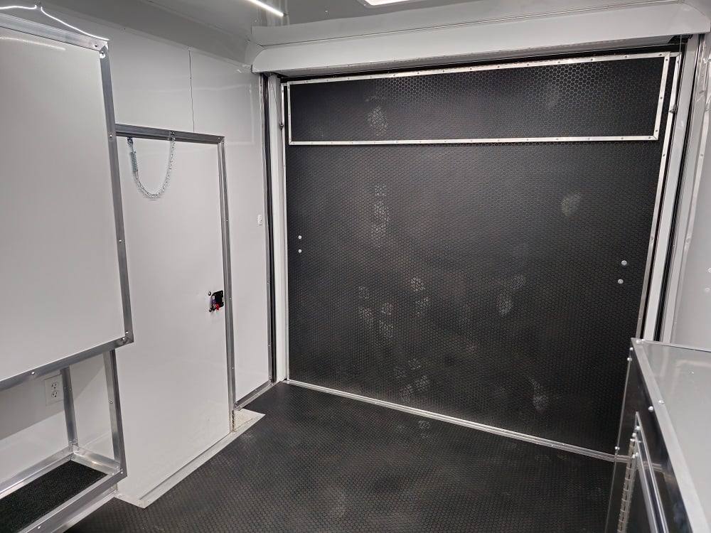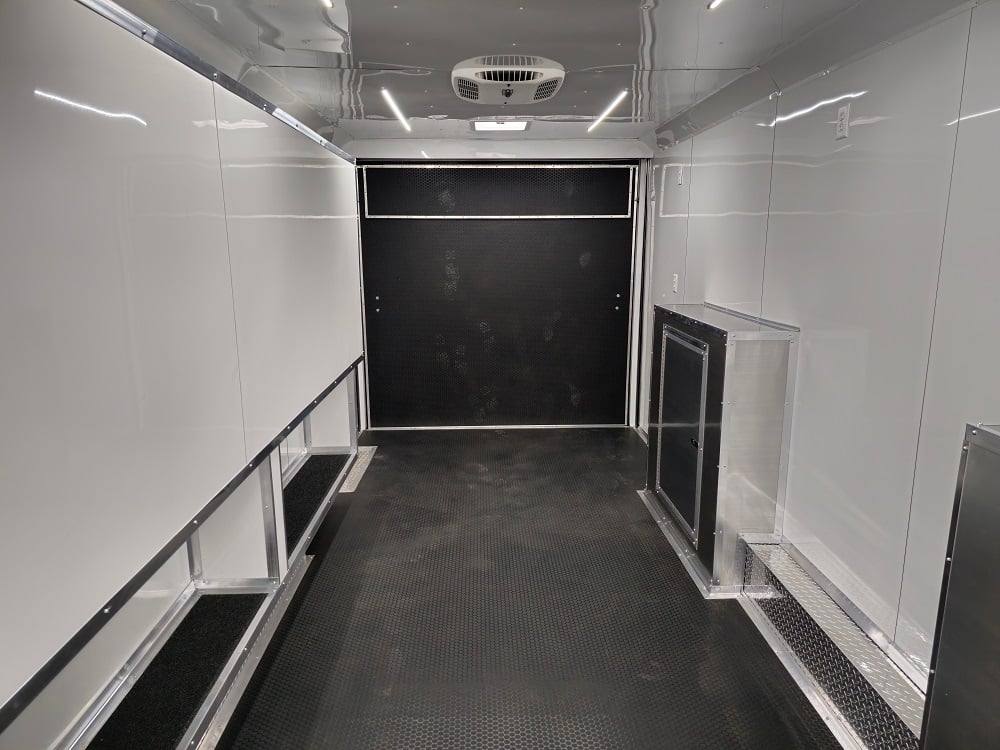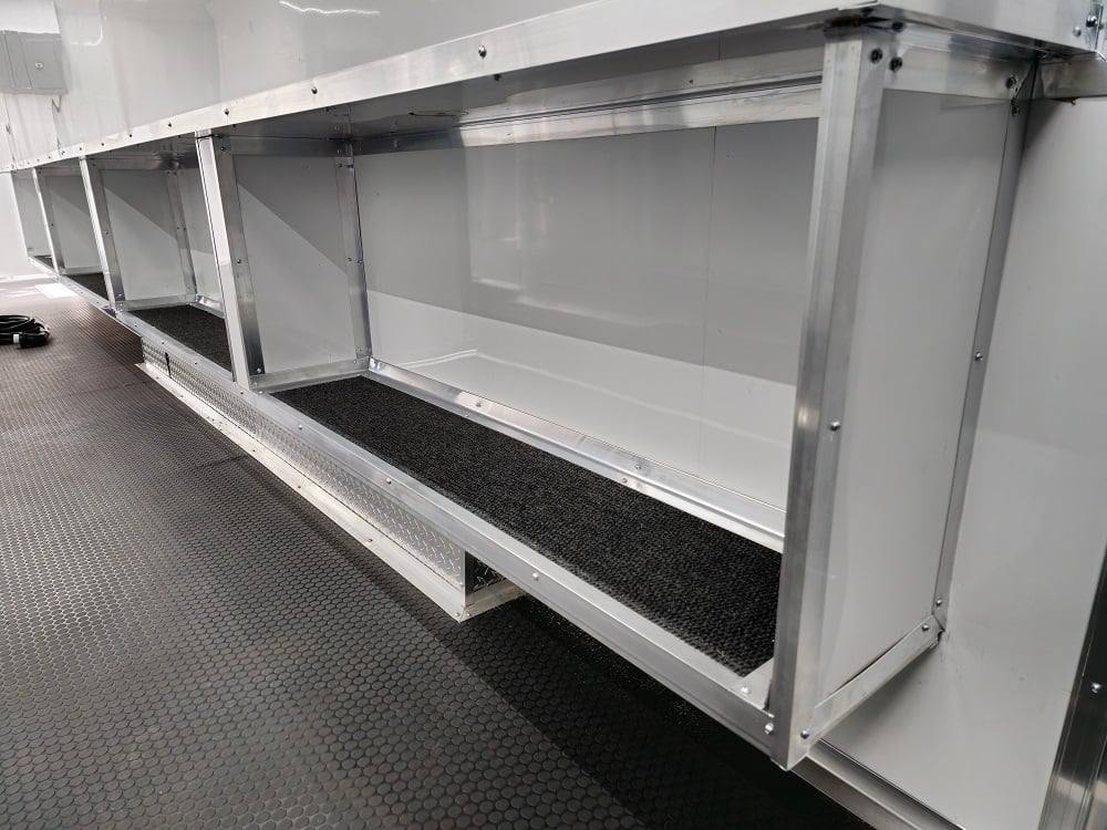 This trailer is designed for a video game/arcade-style setup offering plenty of areas for tv installations and console storage. This trailer features (2) 100amp power panels with (2) 50amp power cables for a combined total of 100amps of power.