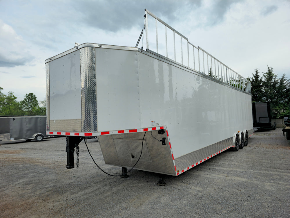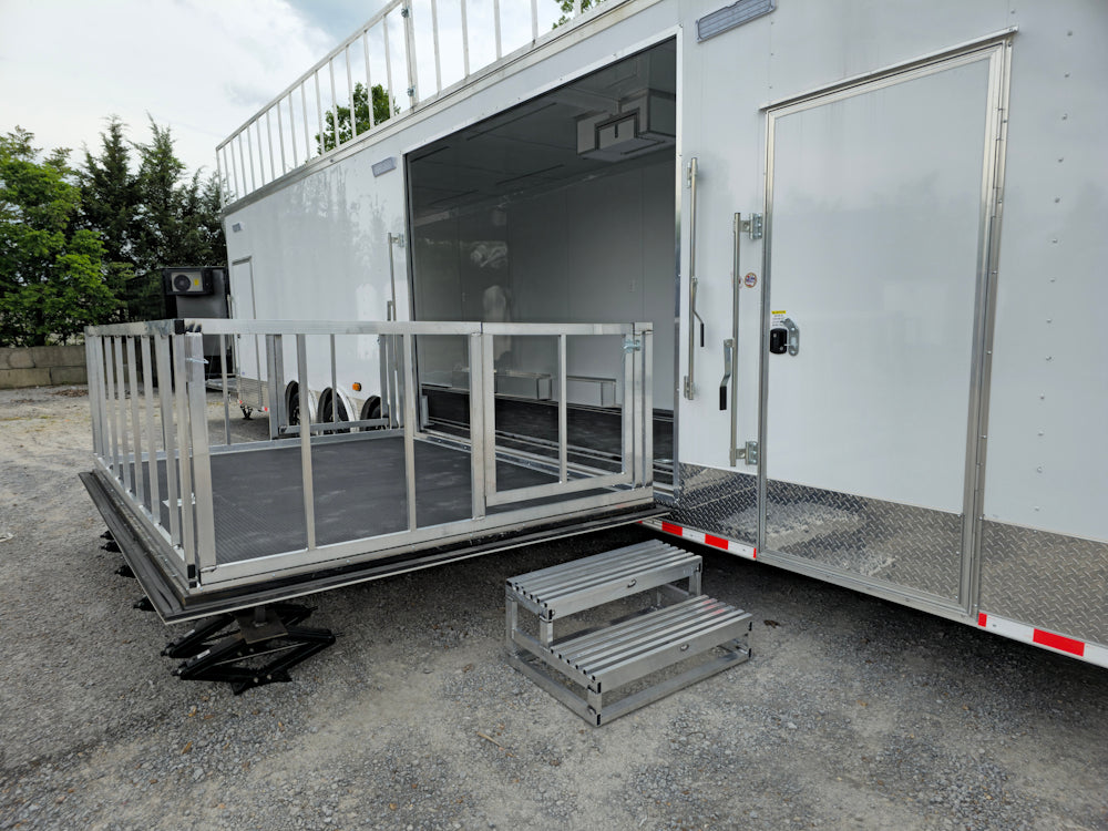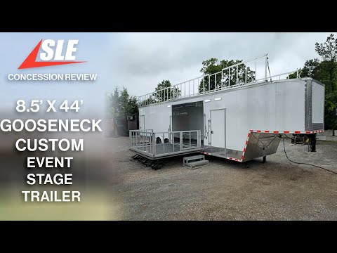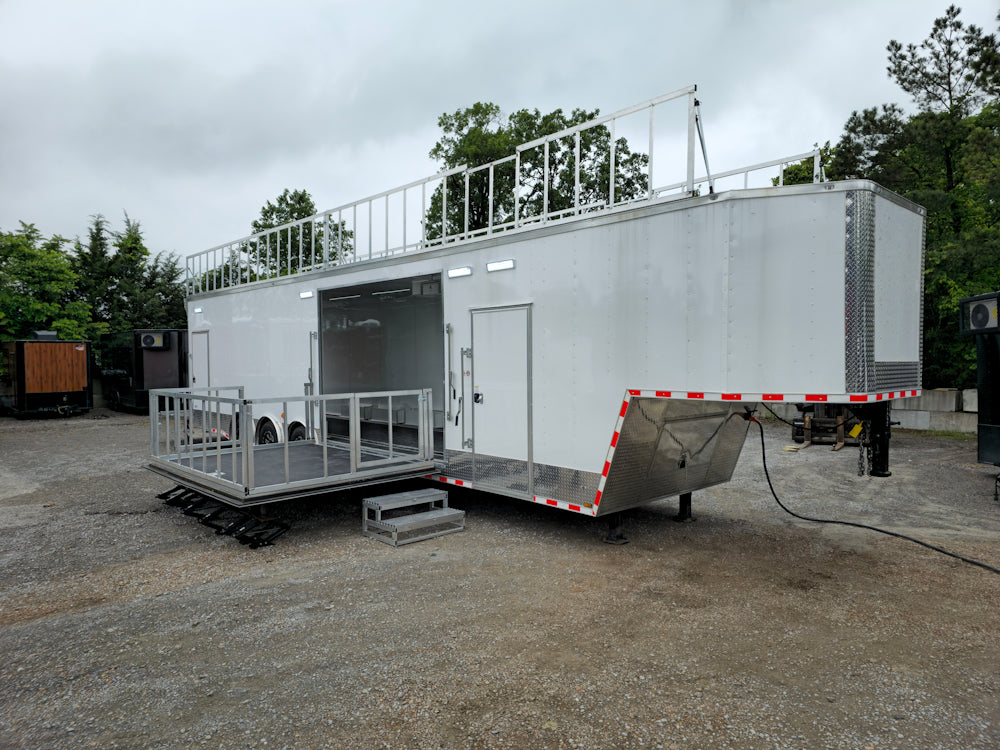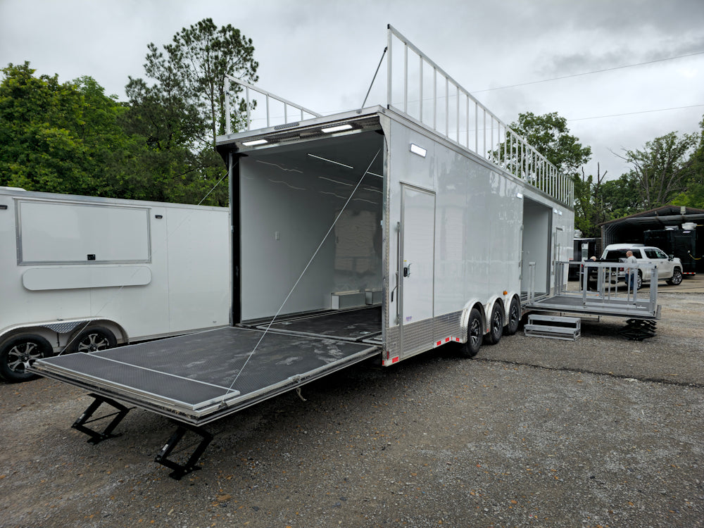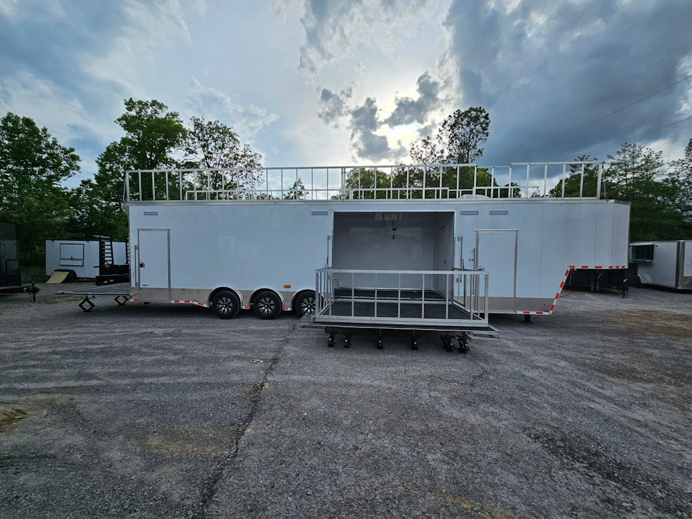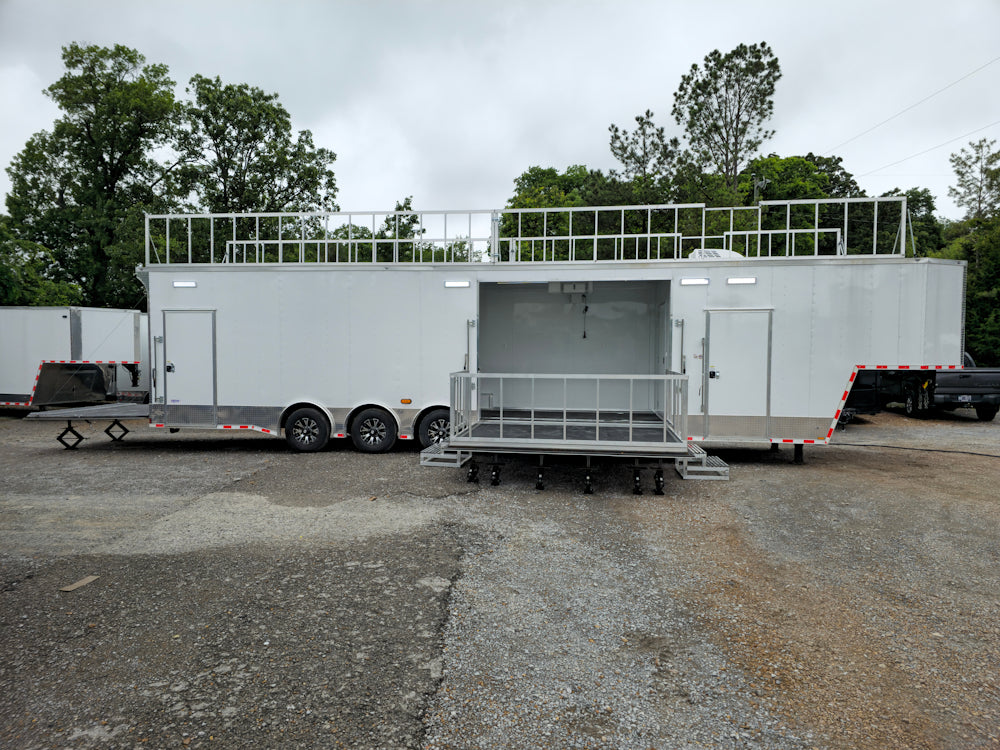 The 8.5' x 44' Gooseneck Custom Event Stage Trailer is a mobile powerhouse built for high-impact events, live performances, and brand activations. Featuring a 12' fold-out stage with railings, walk-on roof, triple 7,000 lb. axles, and a 100 Amp electric system, it's engineered for performance and presence. With sleek white aluminum finishes, full insulation, and versatile access points, this trailer delivers a professional edge on the road or on-site.
