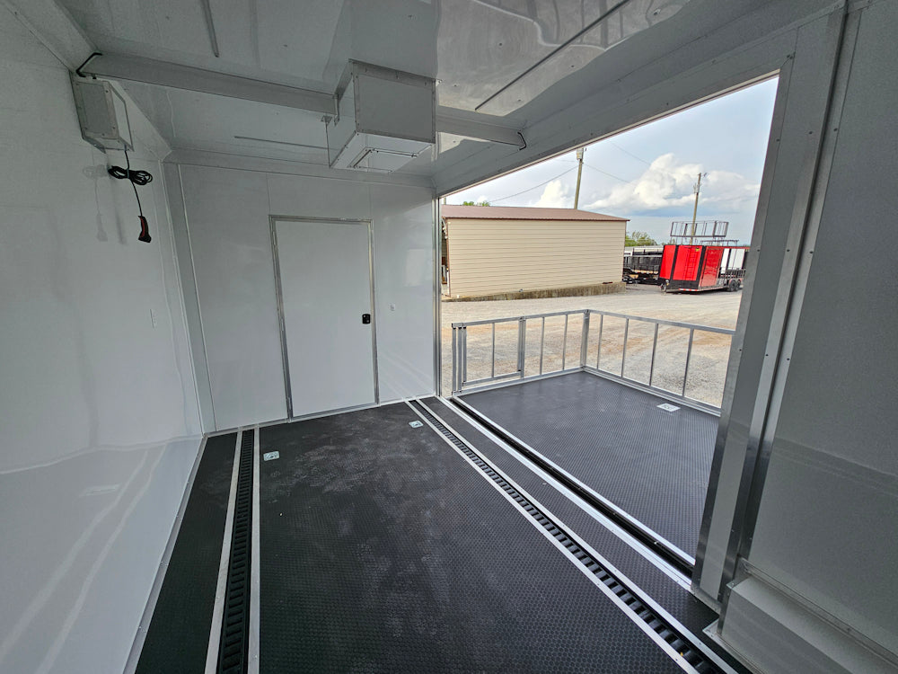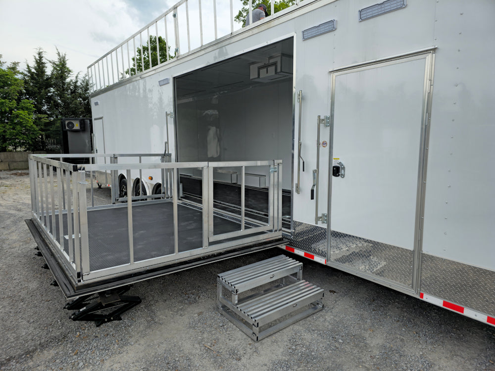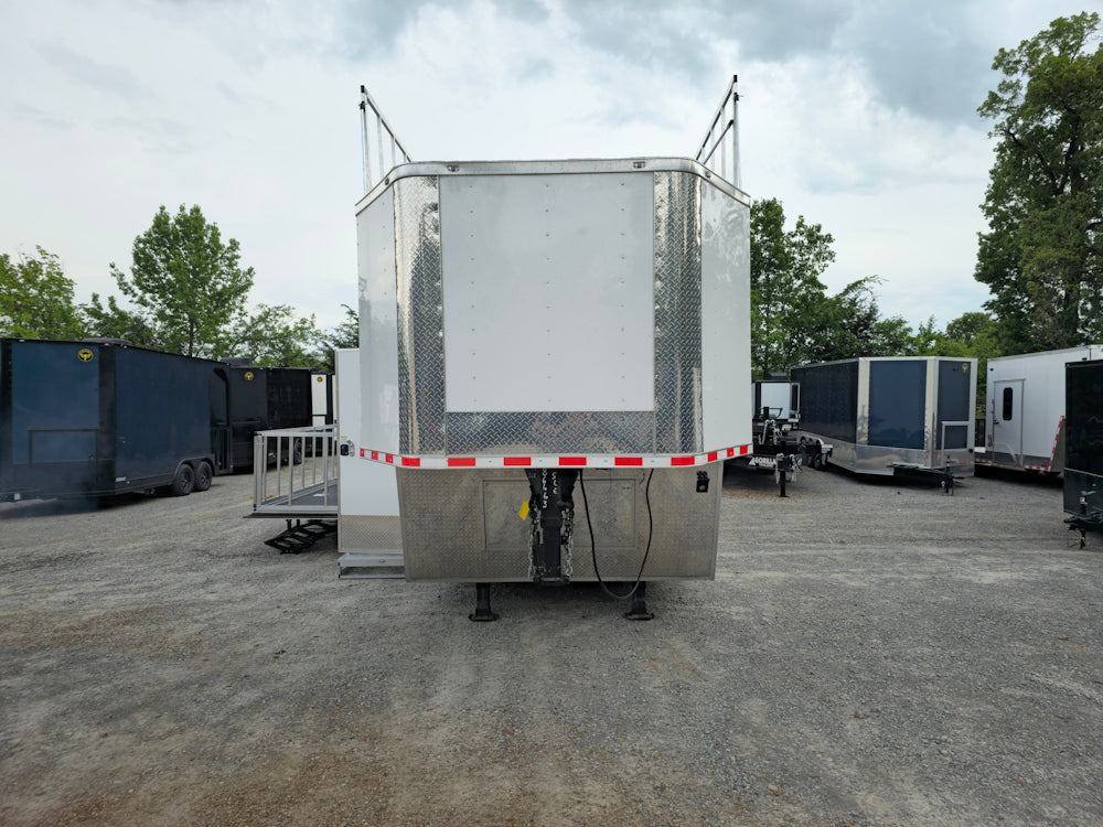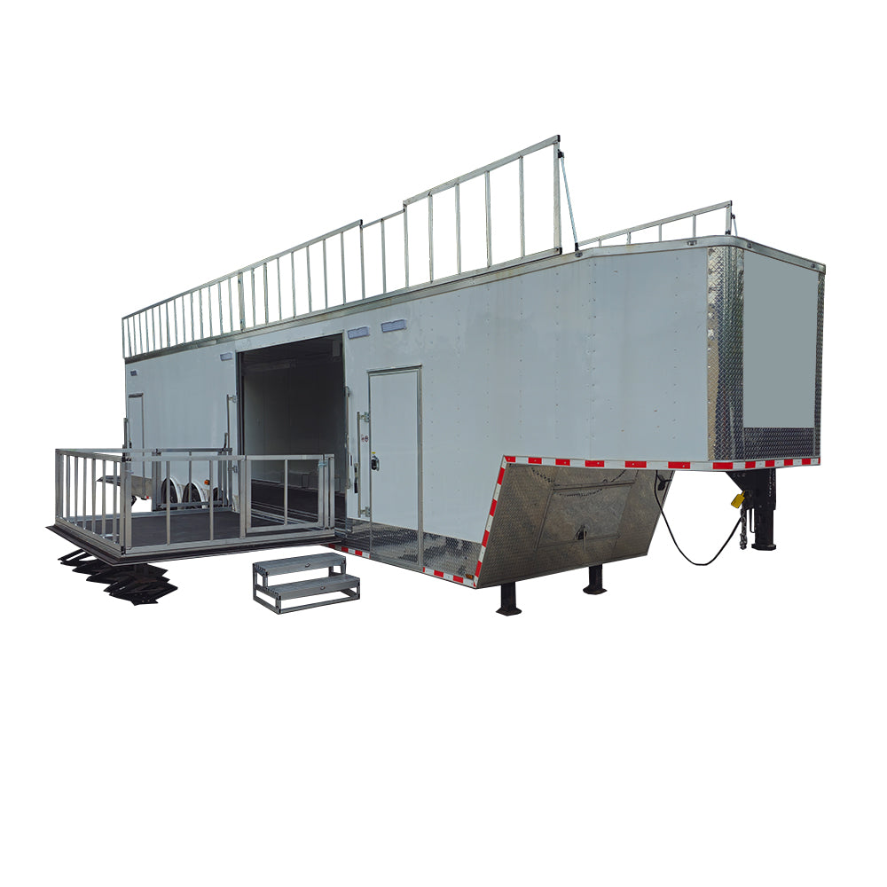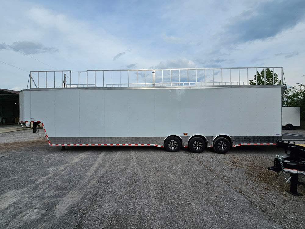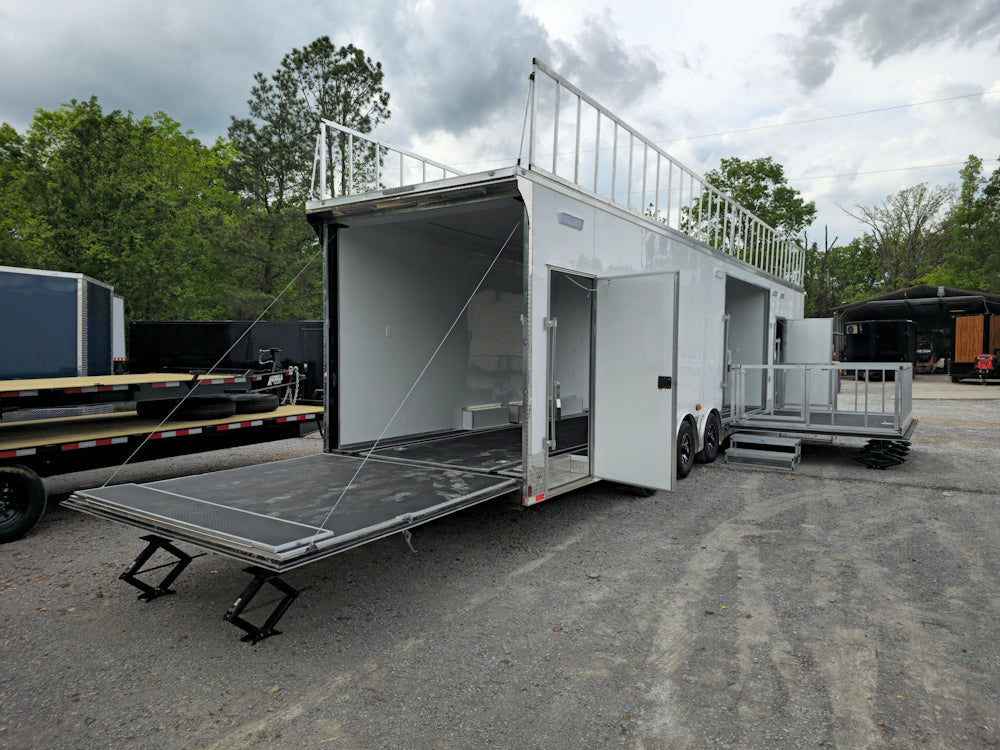 The 8.5' x 44' Gooseneck Custom Event Stage Trailer is a mobile powerhouse built for high-impact events, live performances, and brand activations. Featuring a 12' fold-out stage with railings, walk-on roof, triple 7,000 lb. axles, and a 100 Amp electric system, it's engineered for performance and presence. With sleek white aluminum finishes, full insulation, and versatile access points, this trailer delivers a professional edge on the road or on-site.