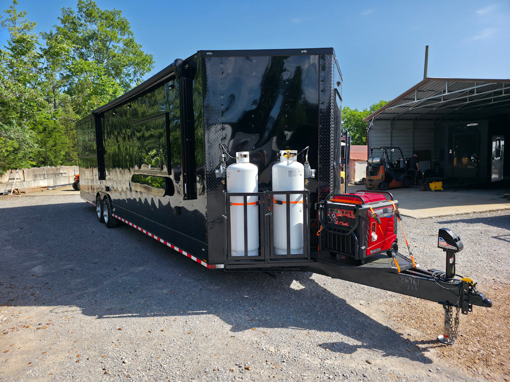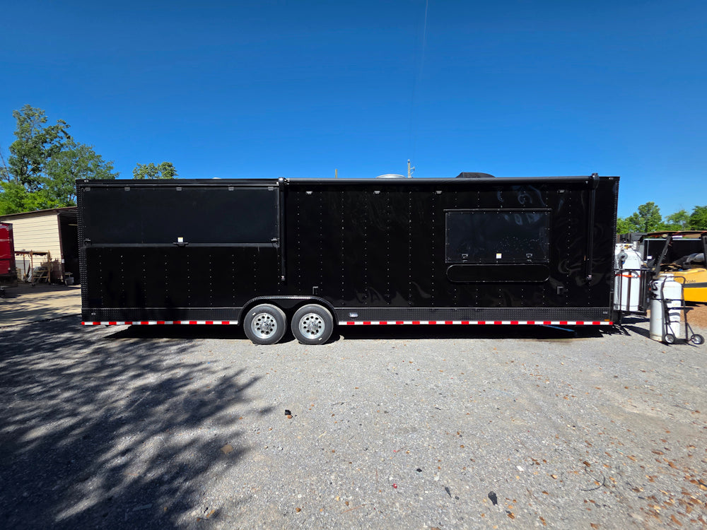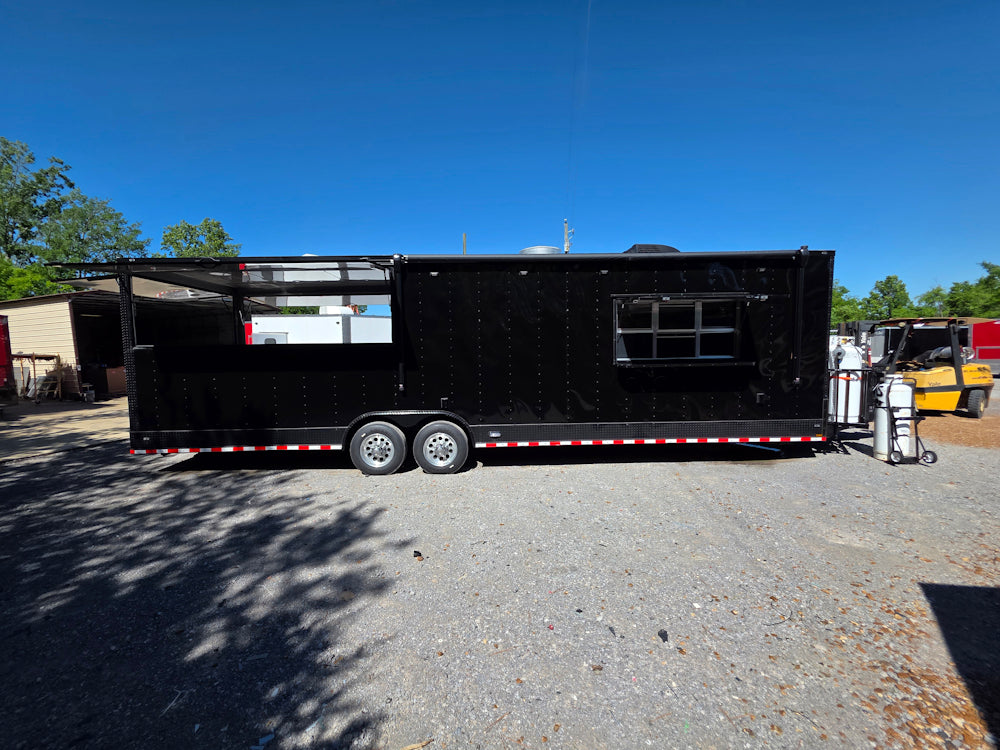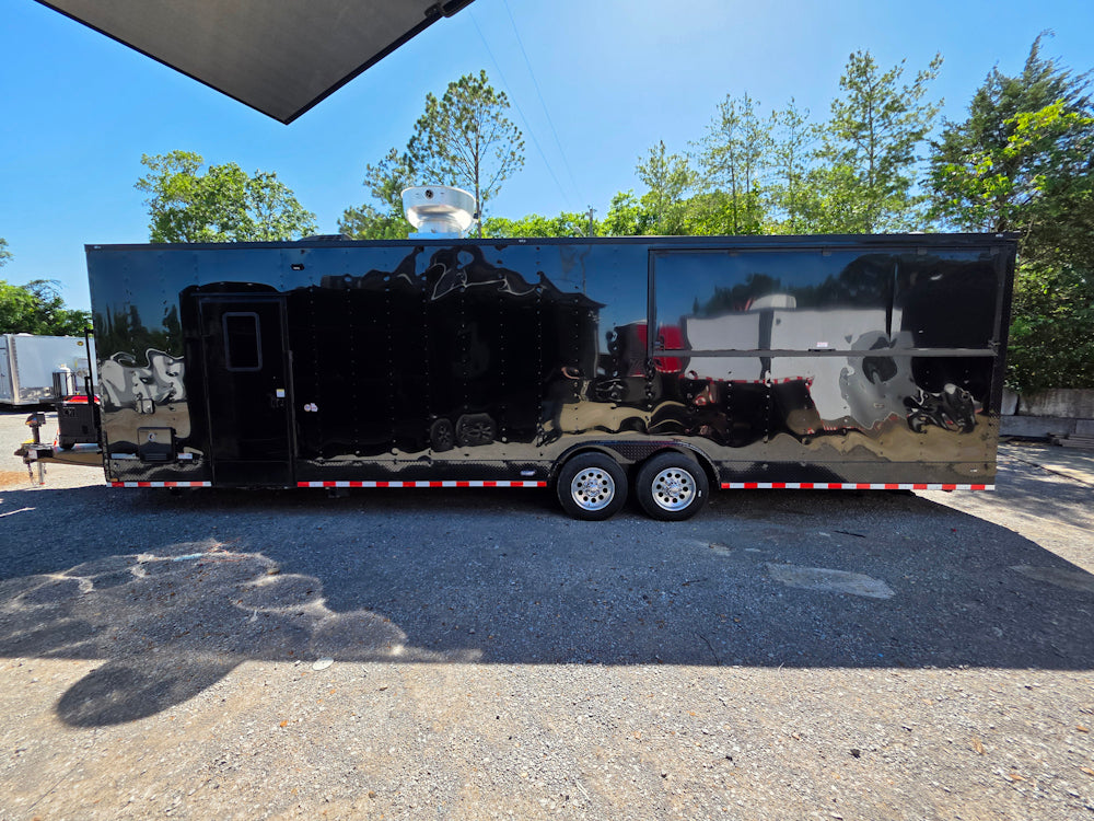 This 8.5' x 32' custom concession trailer is built for serious operators, combining a spacious 12' porch, full kitchen setup, and a complete bathroom package. Outfitted with heavy-duty 10,000 lb axles, a 100-amp electric system, A/C and heat, and a commercial grease hood, it’s designed to handle demanding events with ease. With sleek black styling, stainless steel finishes, and abundant storage, this trailer delivers both professional function and standout curb appeal.