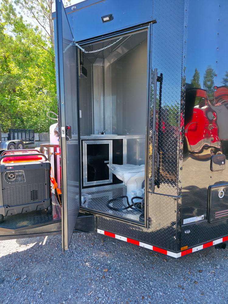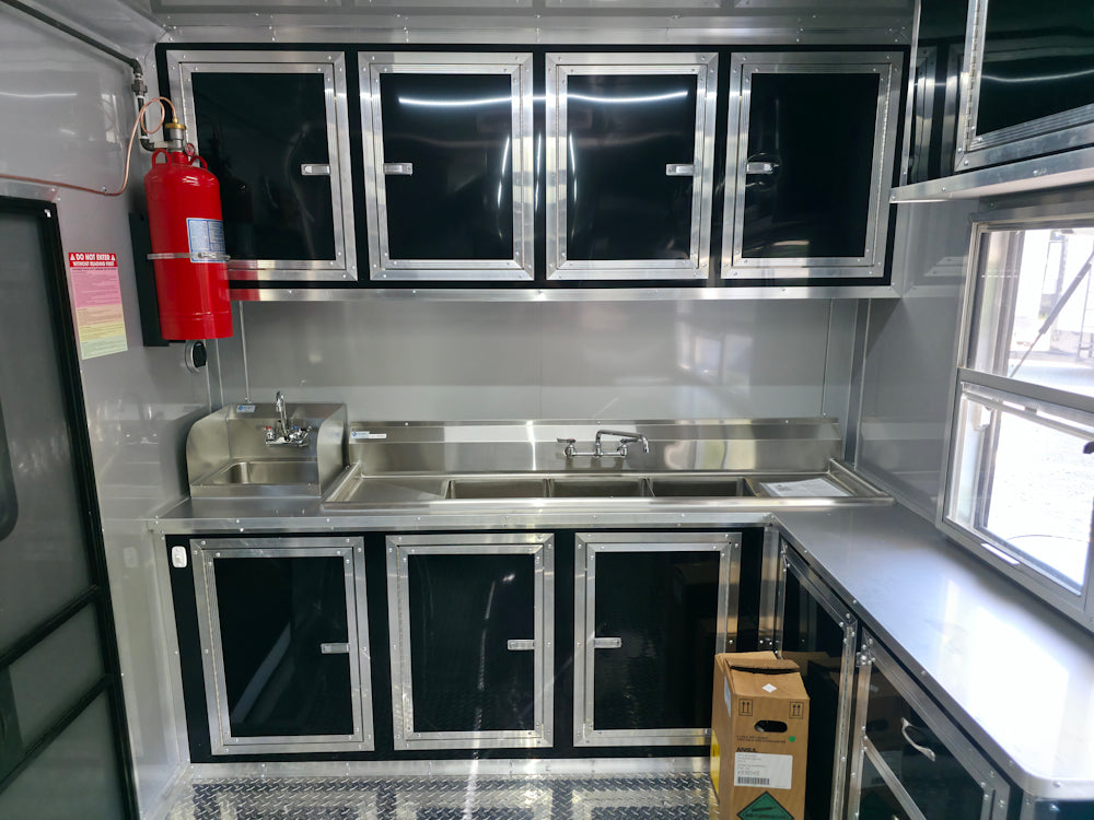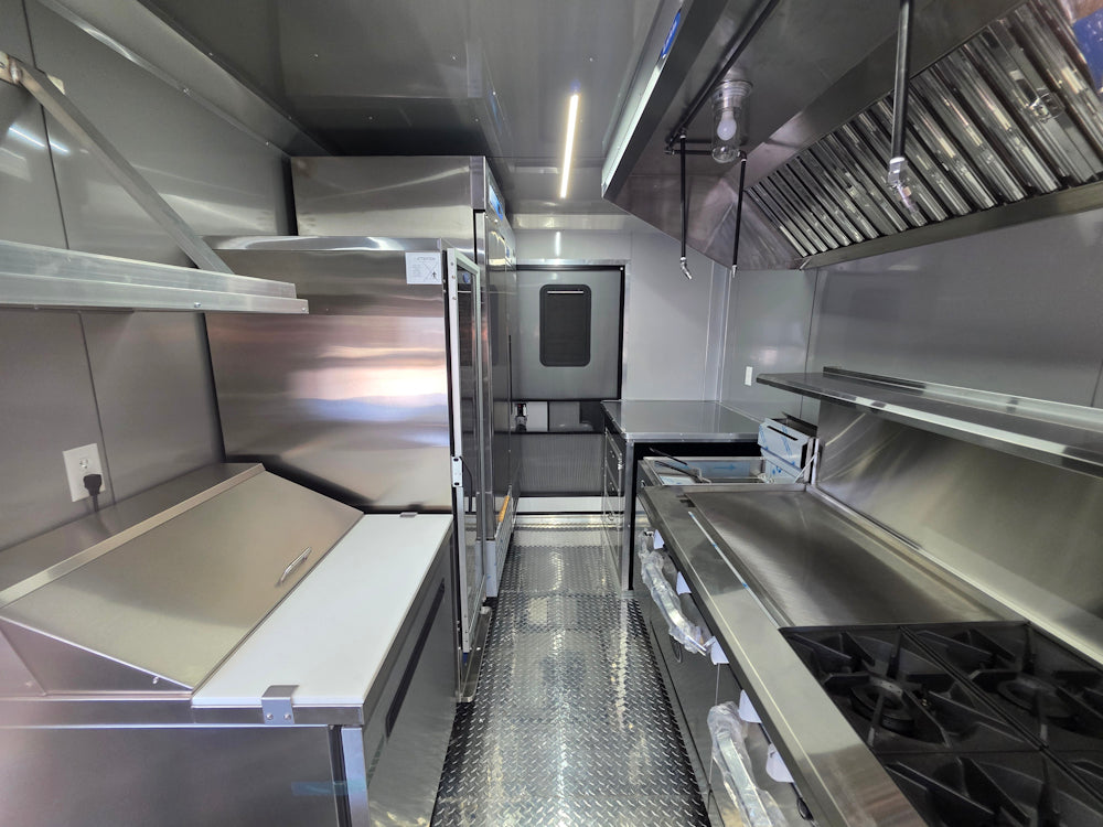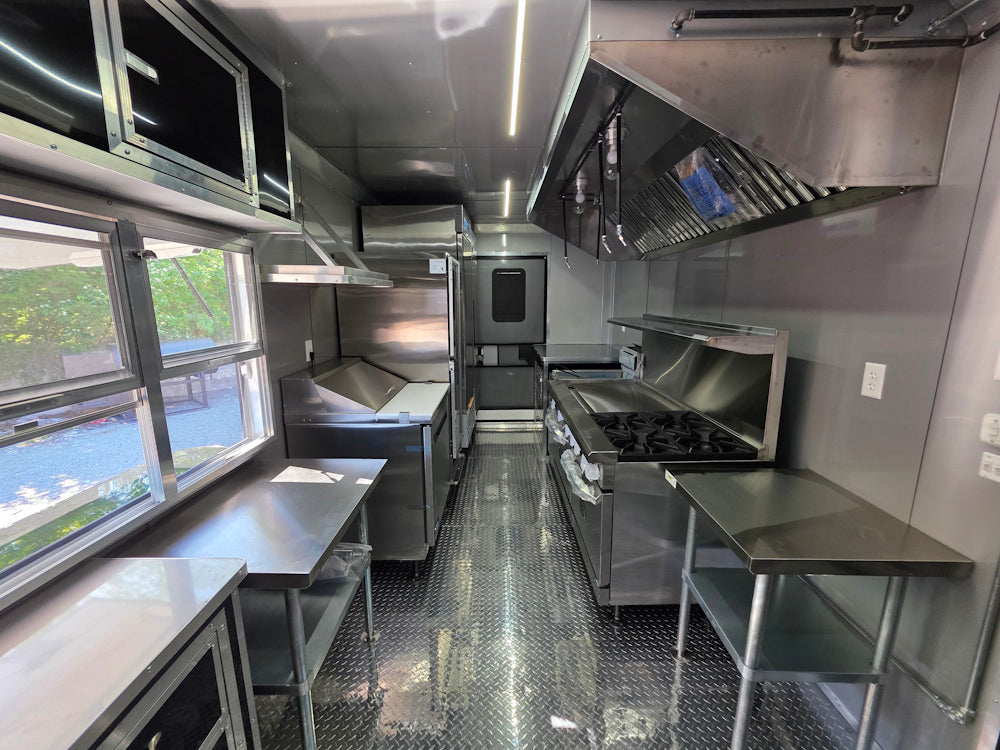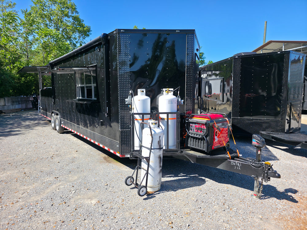 This 8.5' x 32' custom concession trailer is built for serious operators, combining a spacious 12' porch, full kitchen setup, and a complete bathroom package. Outfitted with heavy-duty 10,000 lb axles, a 100-amp electric system, A/C and heat, and a commercial grease hood, it’s designed to handle demanding events with ease. With sleek black styling, stainless steel finishes, and abundant storage, this trailer delivers both professional function and standout curb appeal.