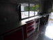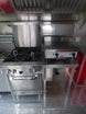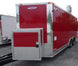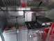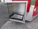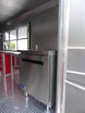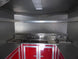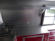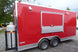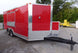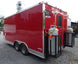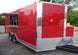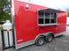 Concession Trailer Red 8.5 X 16 with 8' commercial stainless steel grease hood, generator box with sliding tray, crank jacks, rv door with screen, and appliances.