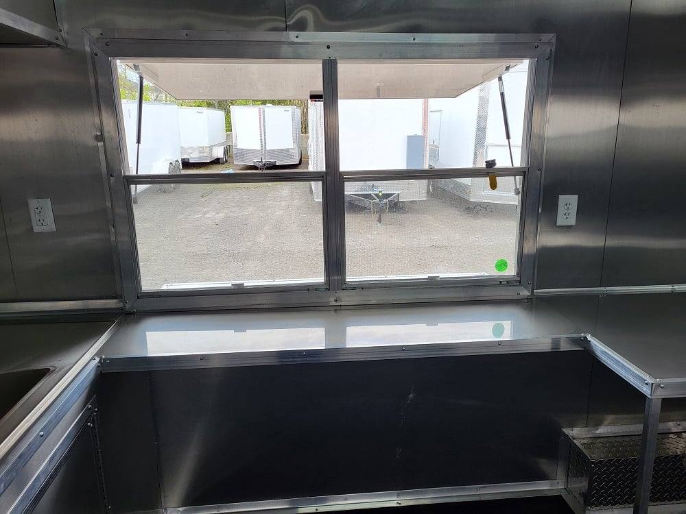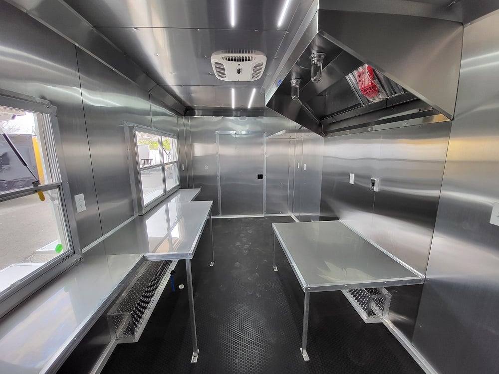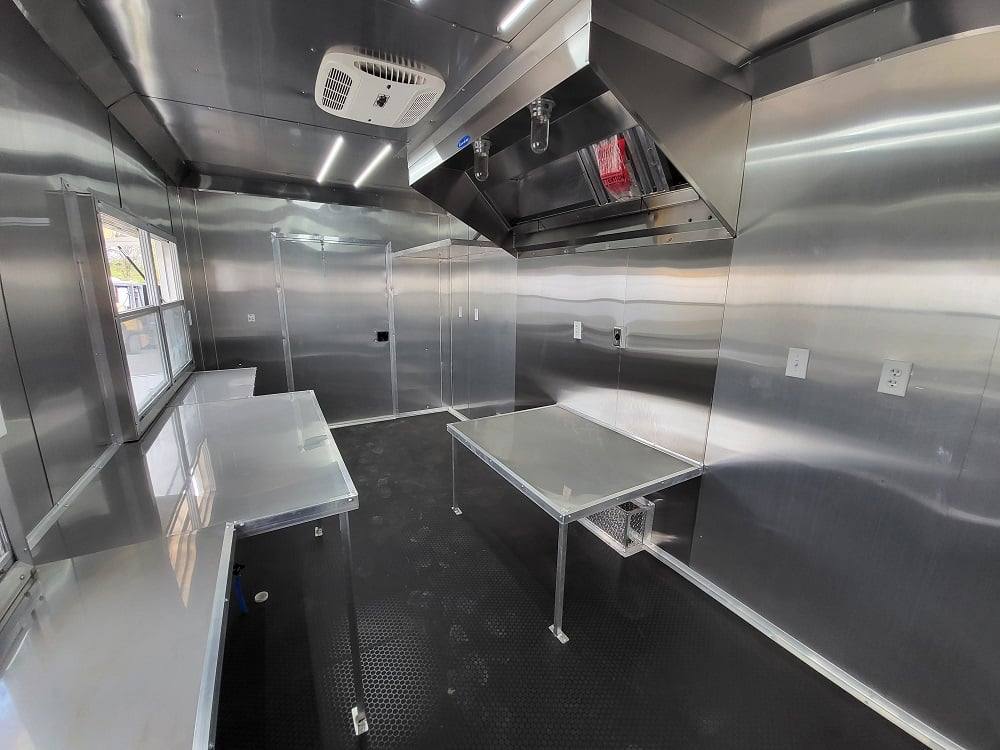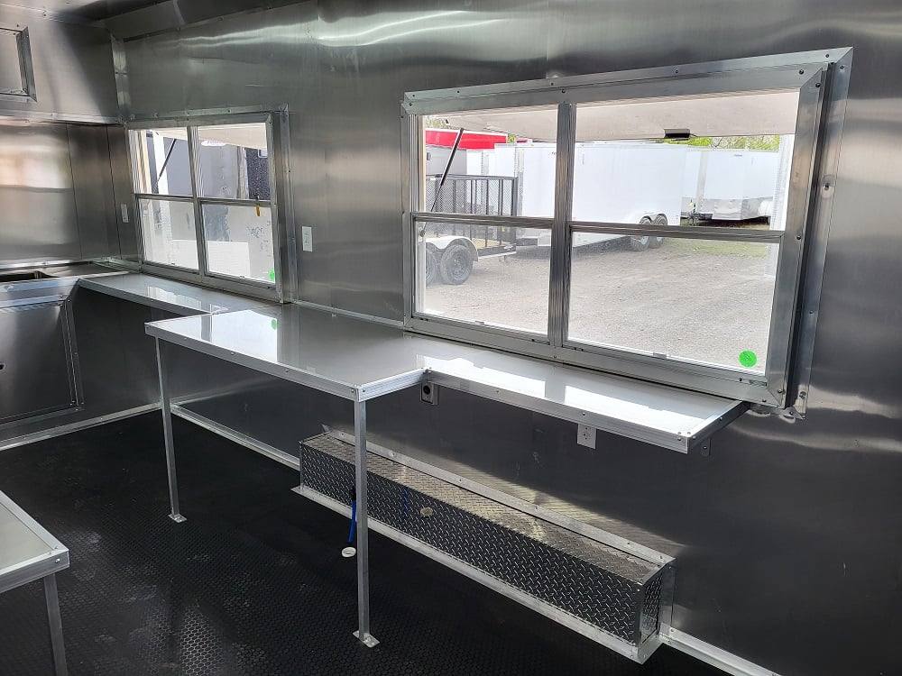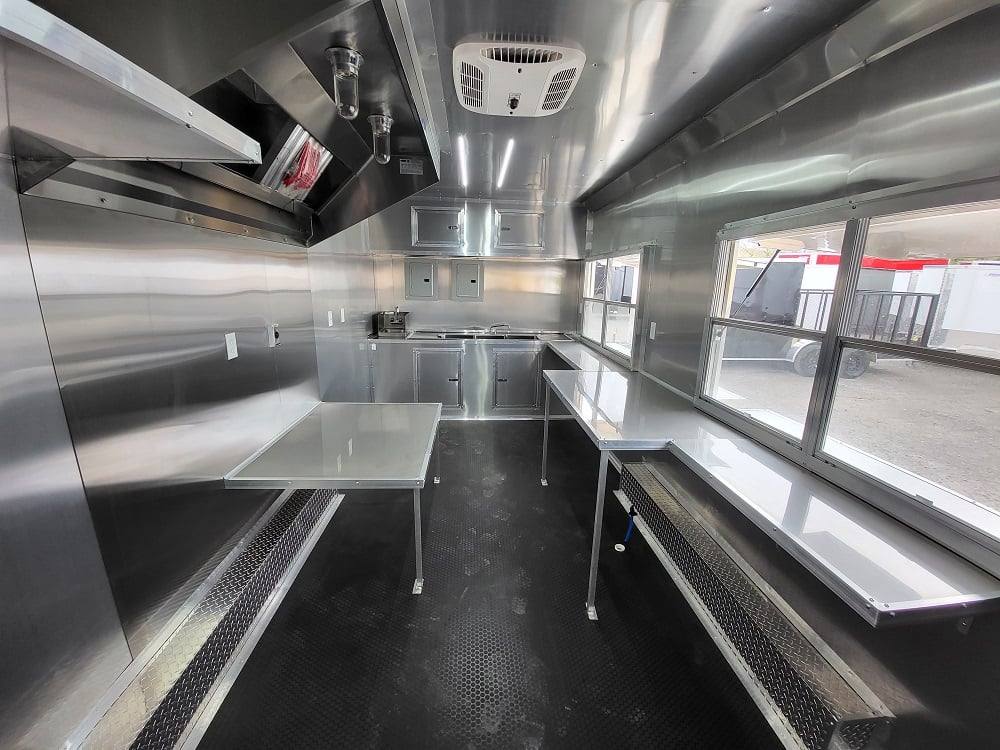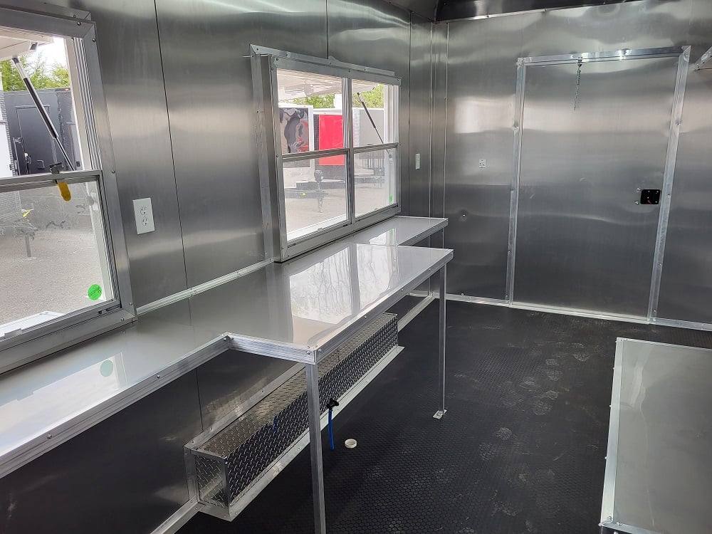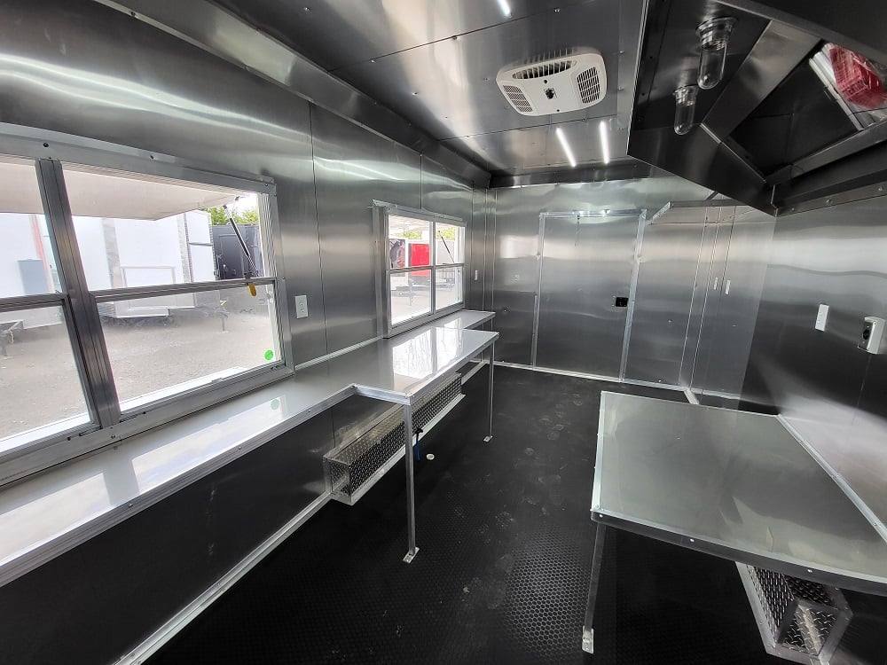 This concession trailer is designed with a 6-foot commercial grease hood, an Electric package, and all the plumbing completed. This trailer also offers two concession windows to separate order and pick-up lines.