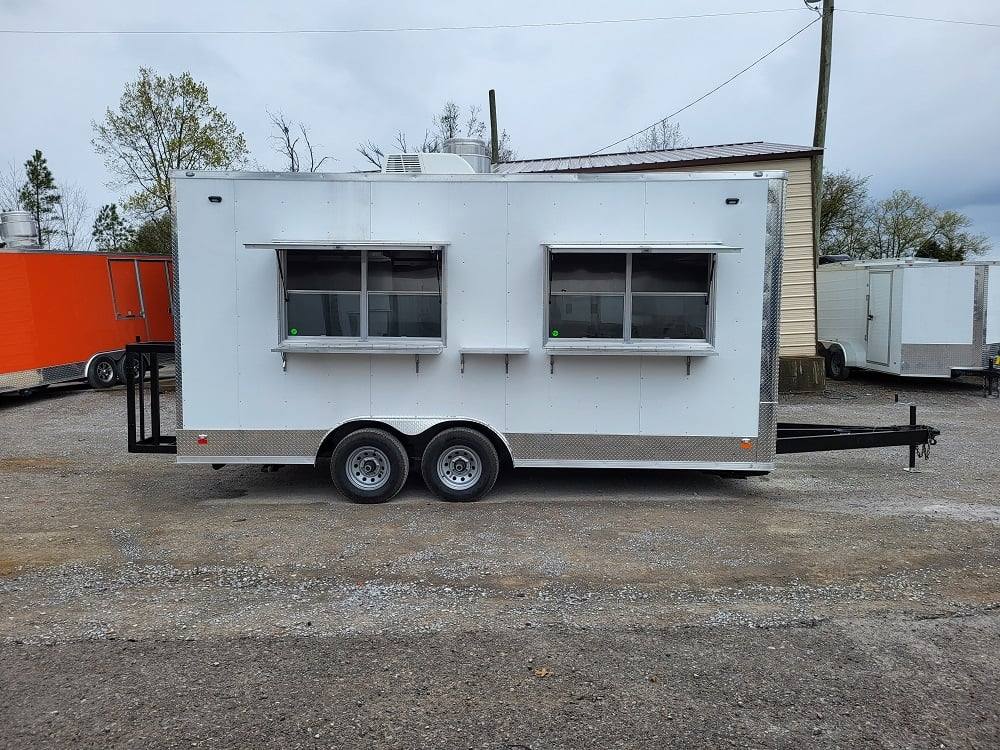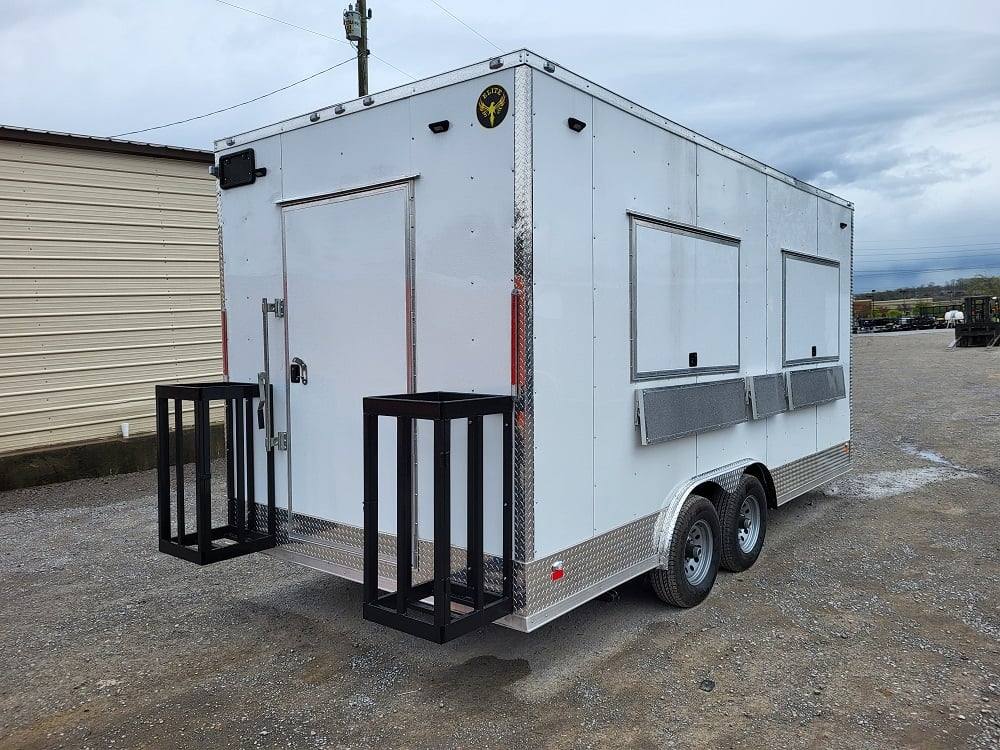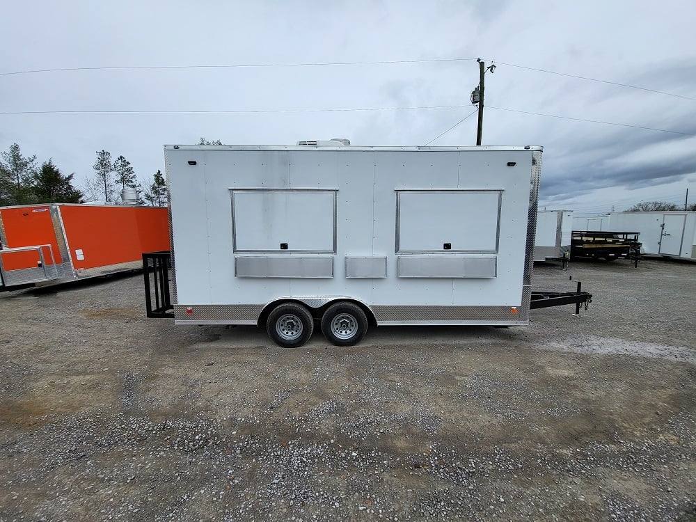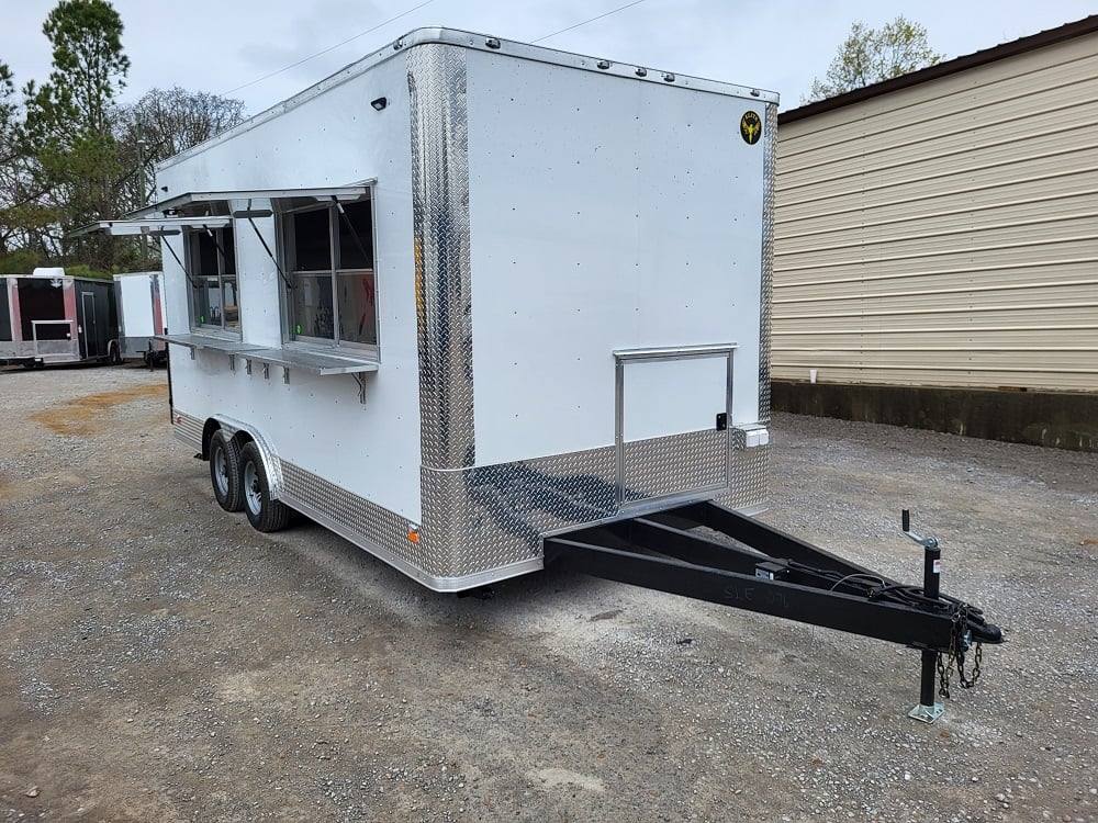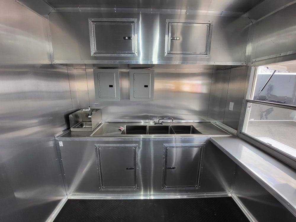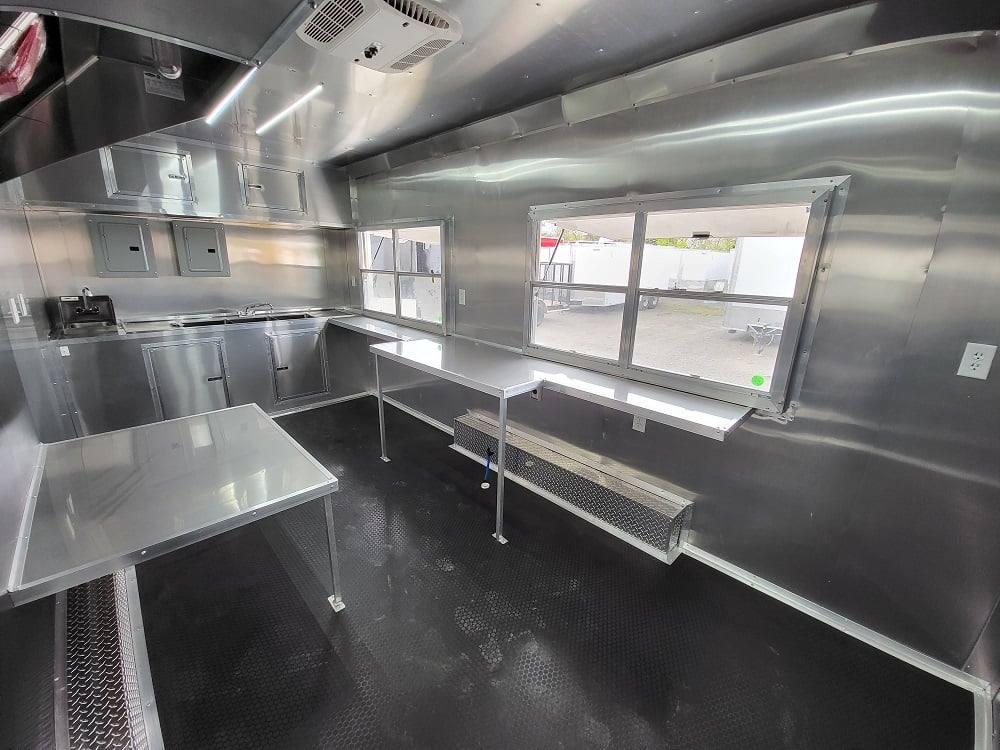 This concession trailer is designed with a 6-foot commercial grease hood, an Electric package, and all the plumbing completed. This trailer also offers two concession windows to separate order and pick-up lines.