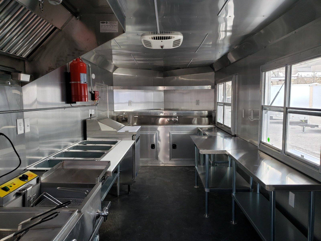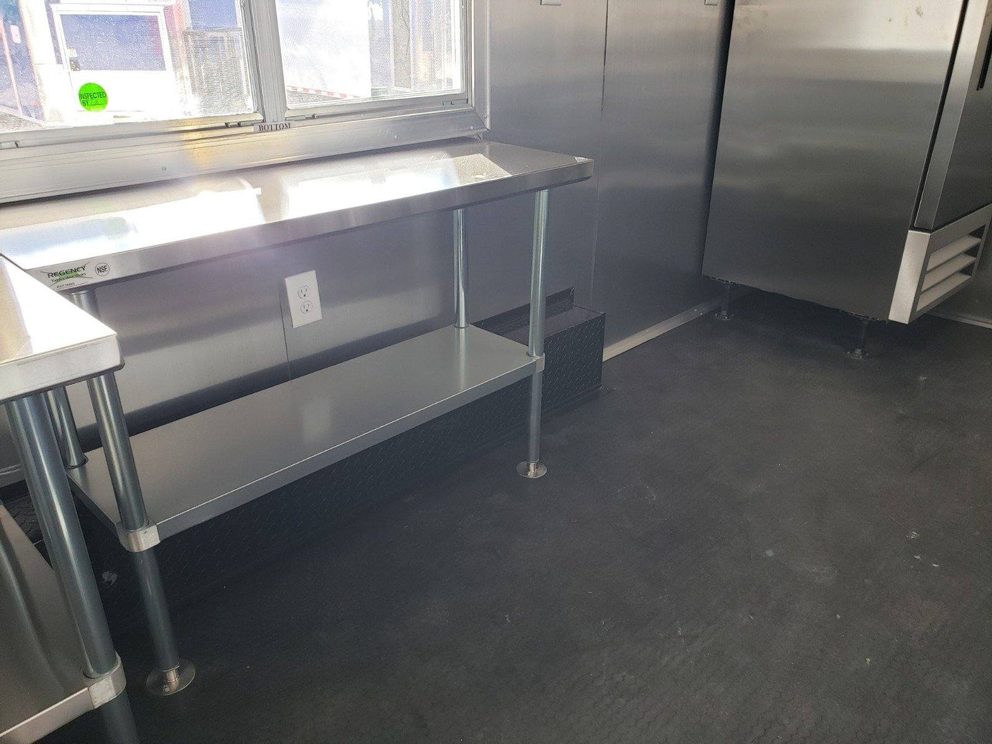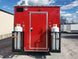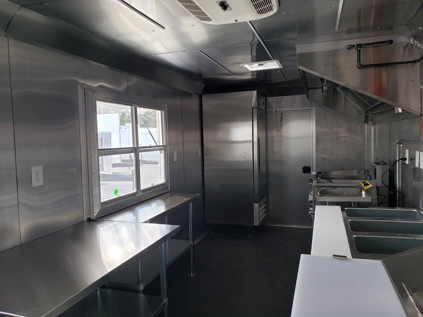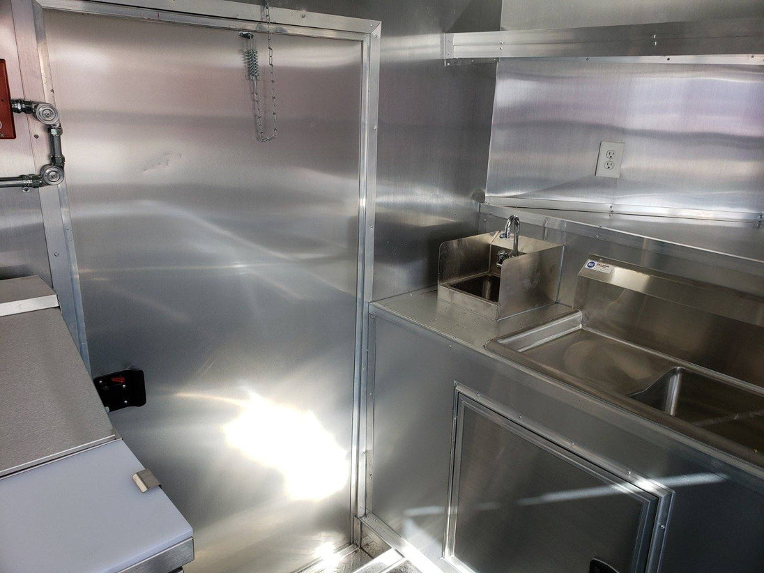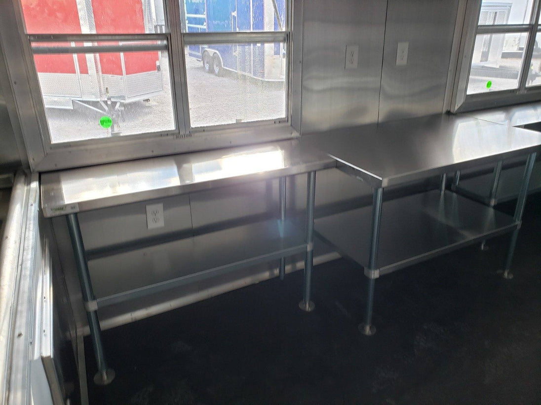 This concession trailer is designed with an 8-foot commercial grease hood and features (2) concession windows for vending. The trailer has a sink package, and electric package, and features plenty of counters for prep work.