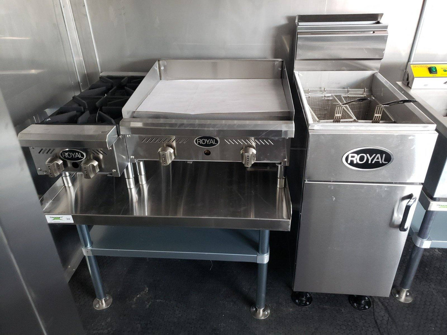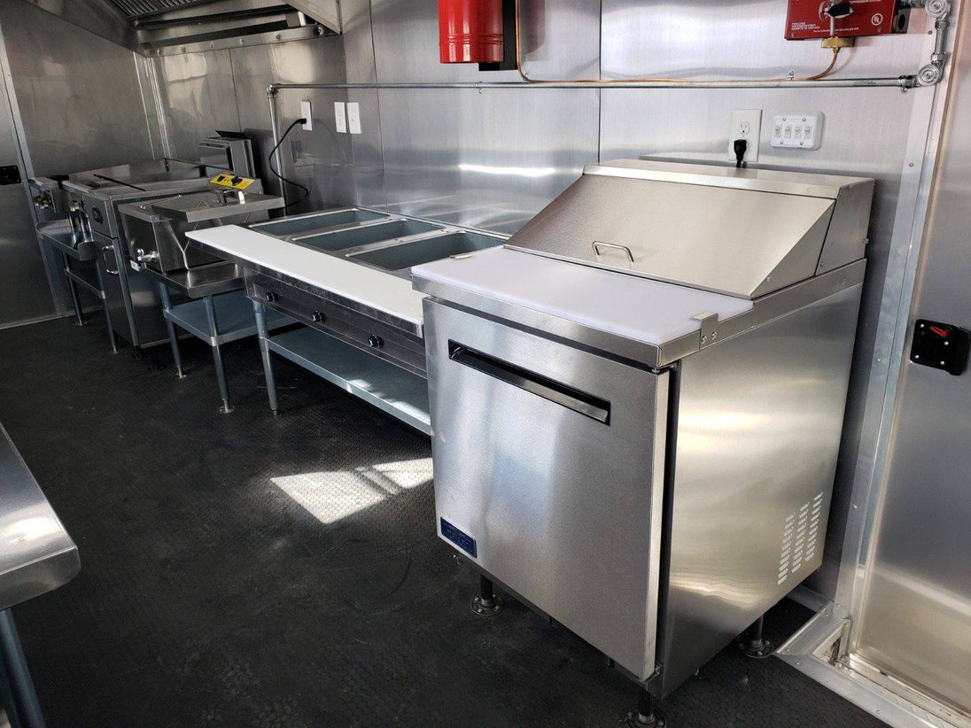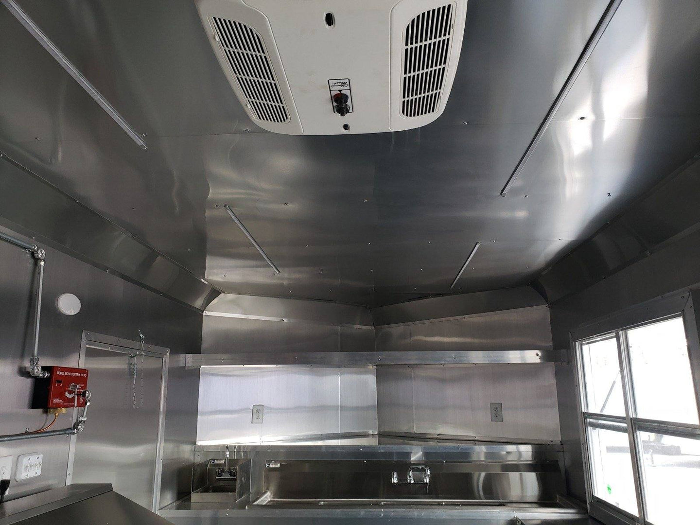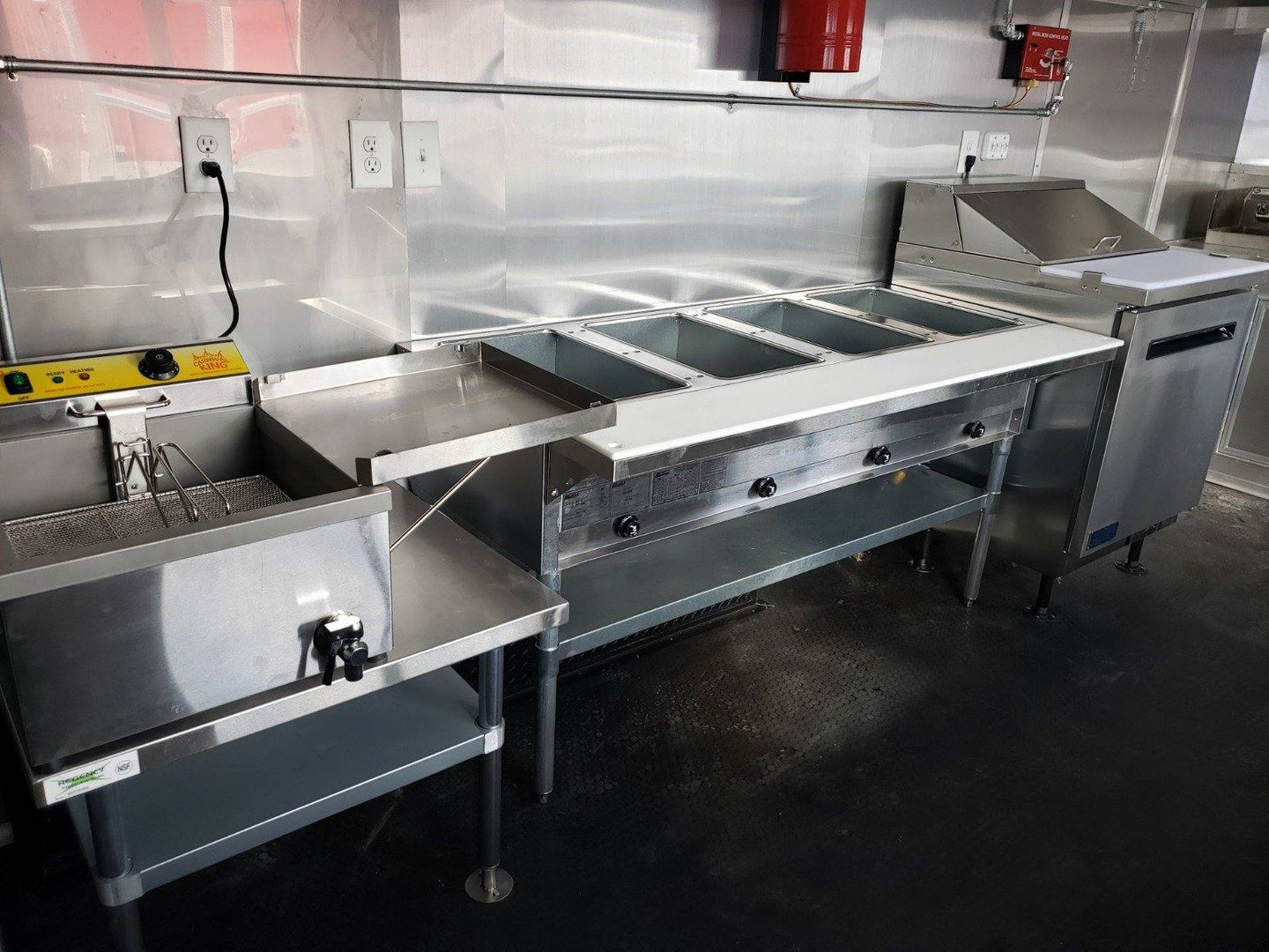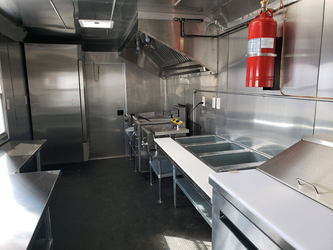 This concession trailer is designed with an 8-foot commercial grease hood and features (2) concession windows for vending. The trailer has a sink package, and electric package, and features plenty of counters for prep work.