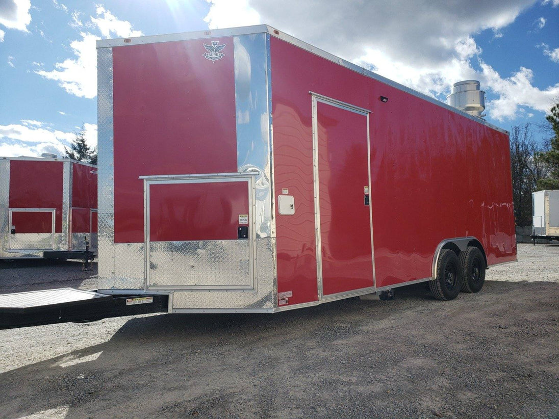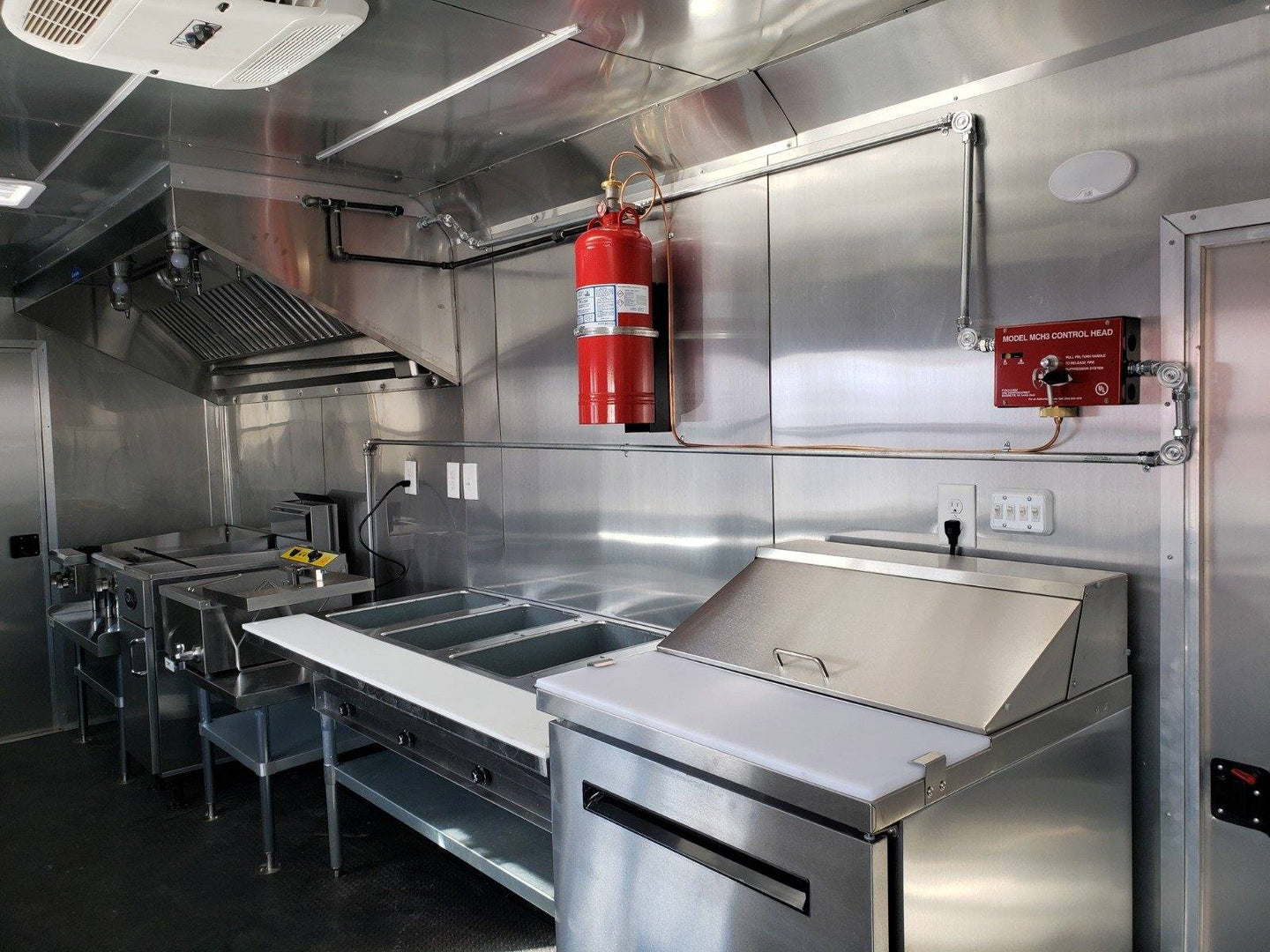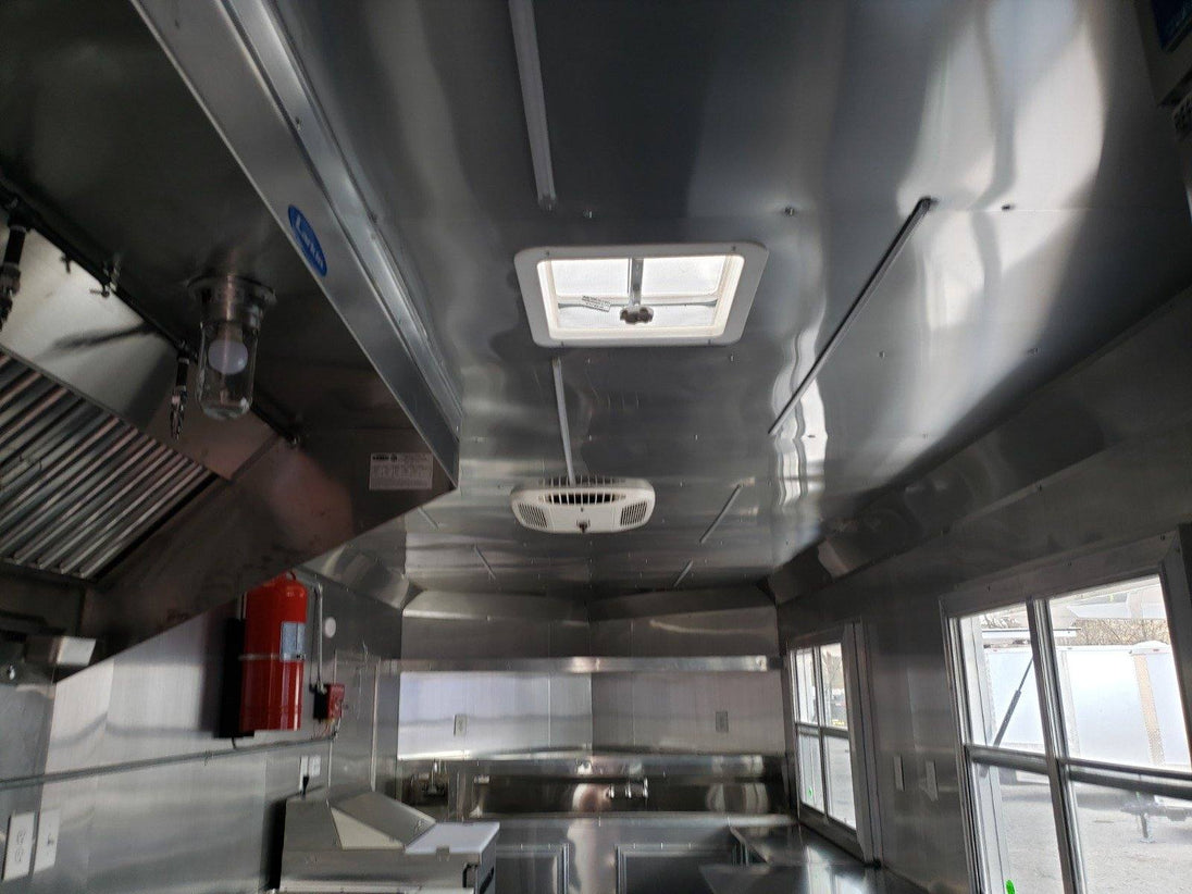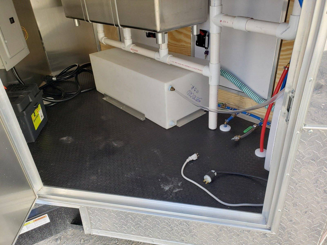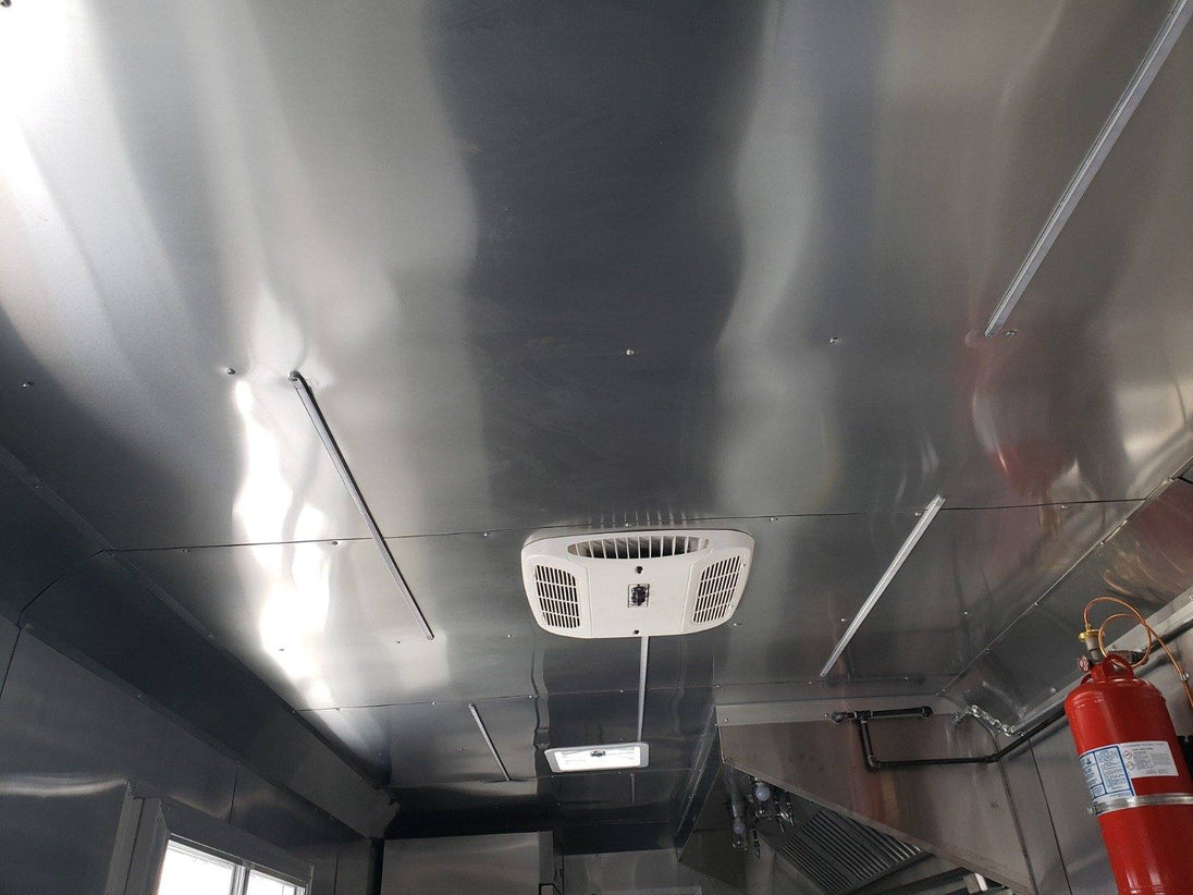 This concession trailer is designed with an 8-foot commercial grease hood and features (2) concession windows for vending. The trailer has a sink package, and electric package, and features plenty of counters for prep work.