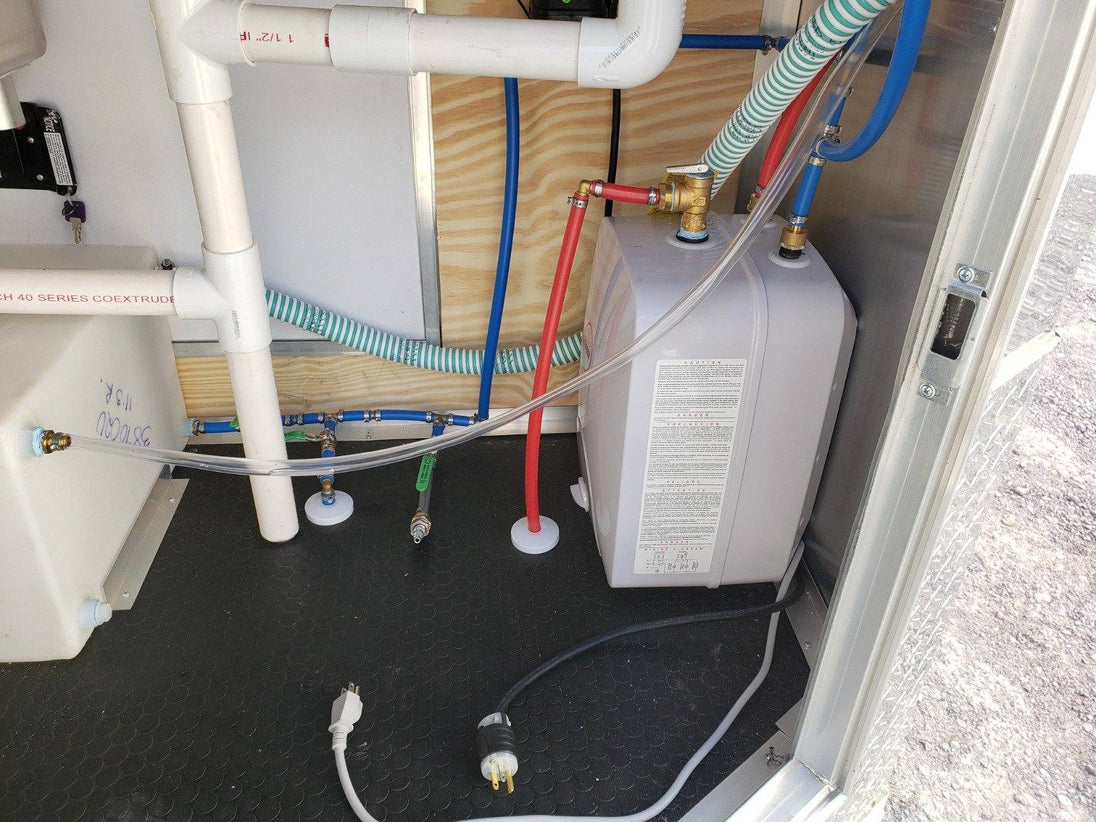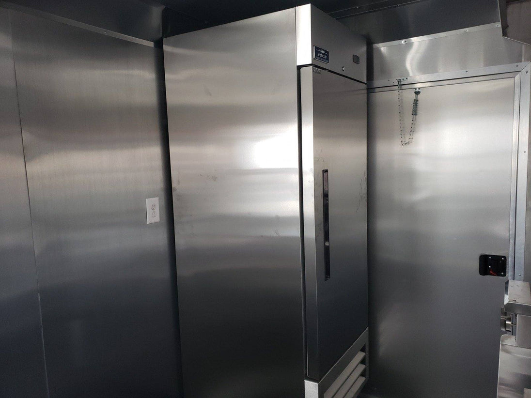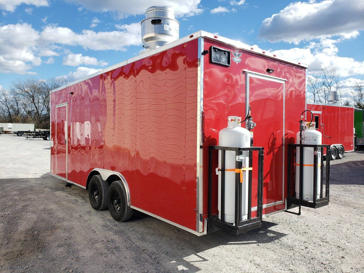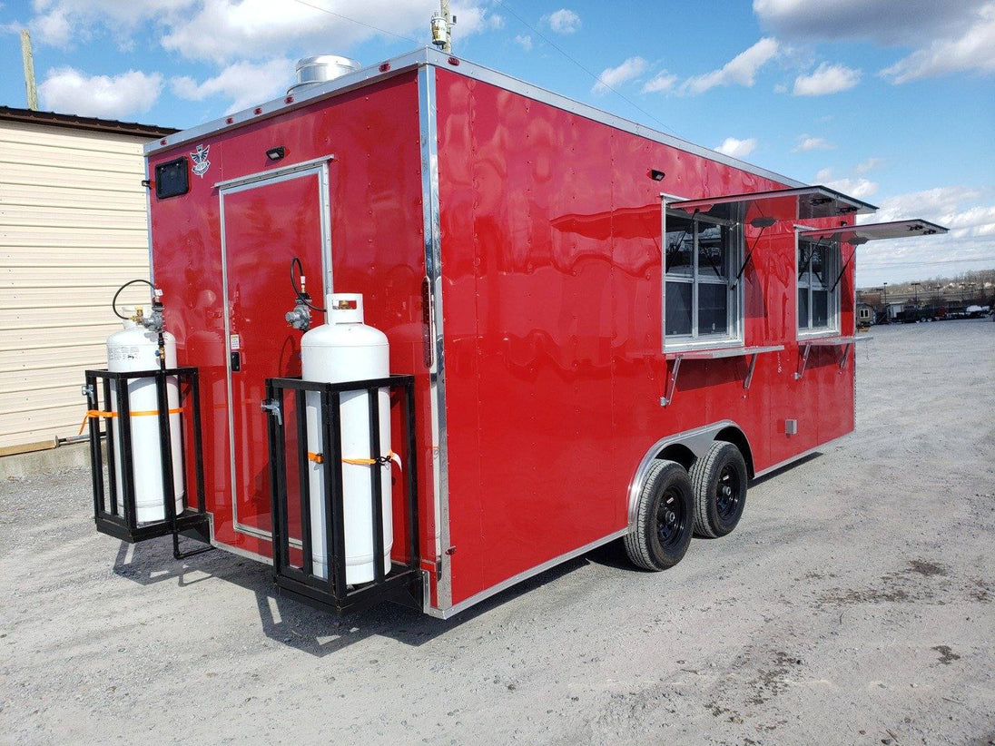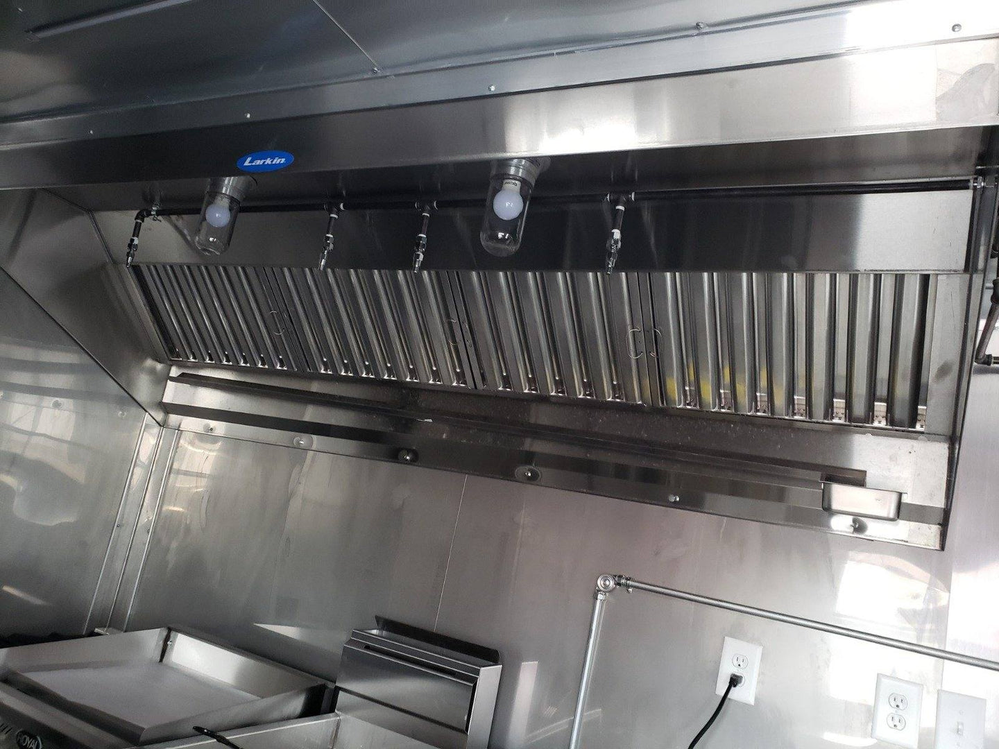 This concession trailer is designed with an 8-foot commercial grease hood and features (2) concession windows for vending. The trailer has a sink package, and electric package, and features plenty of counters for prep work.