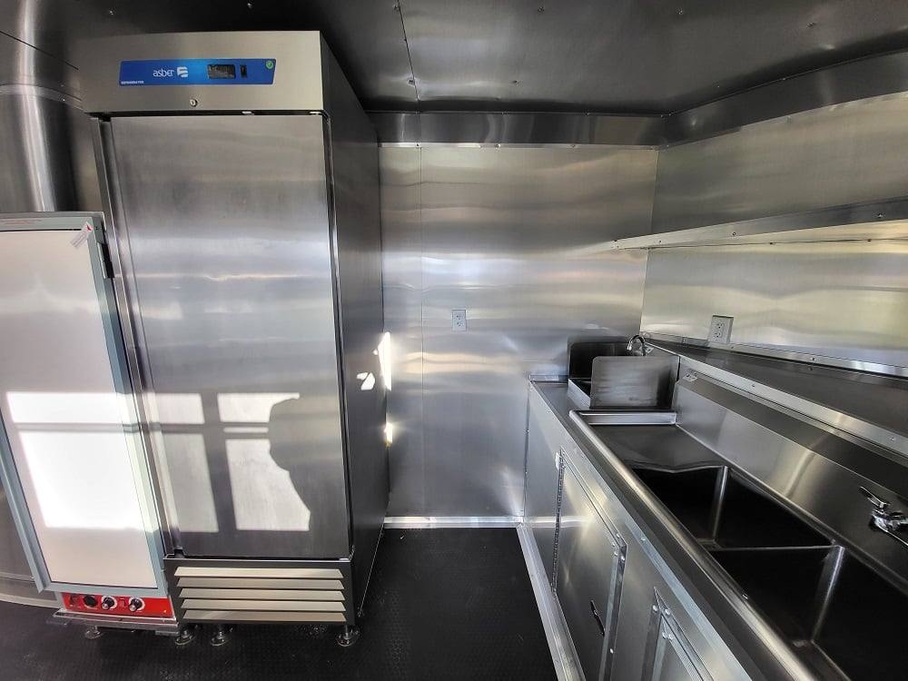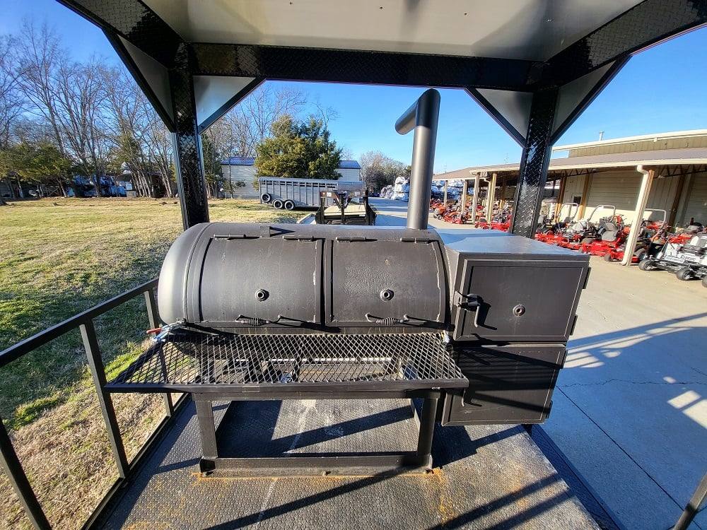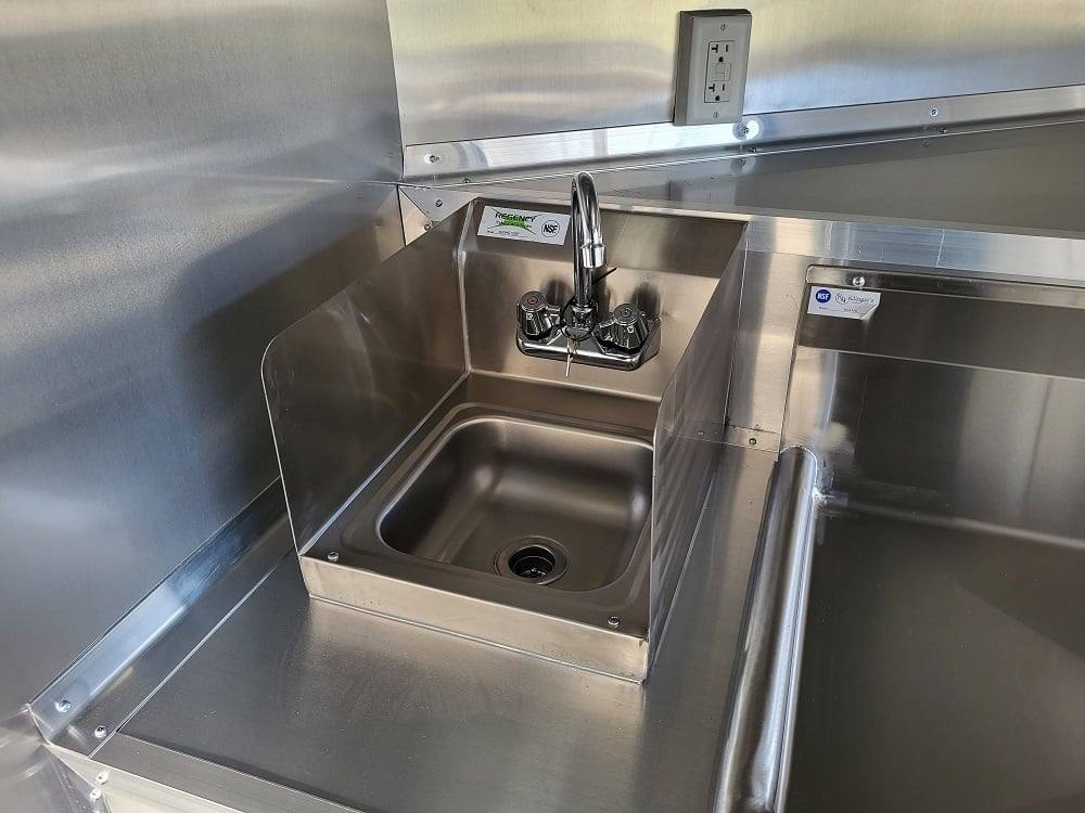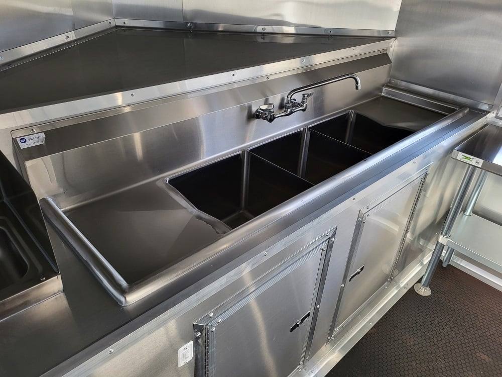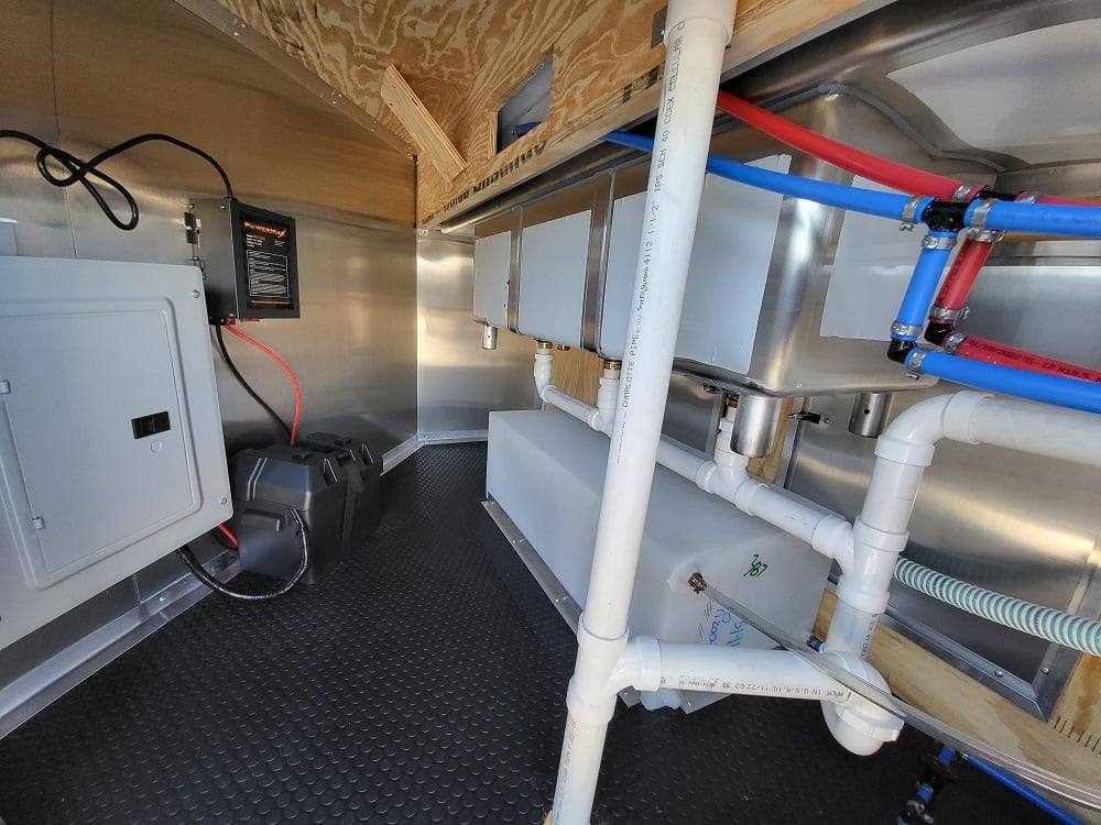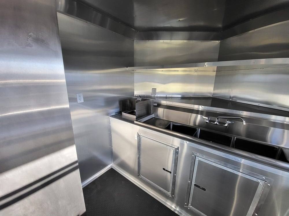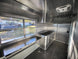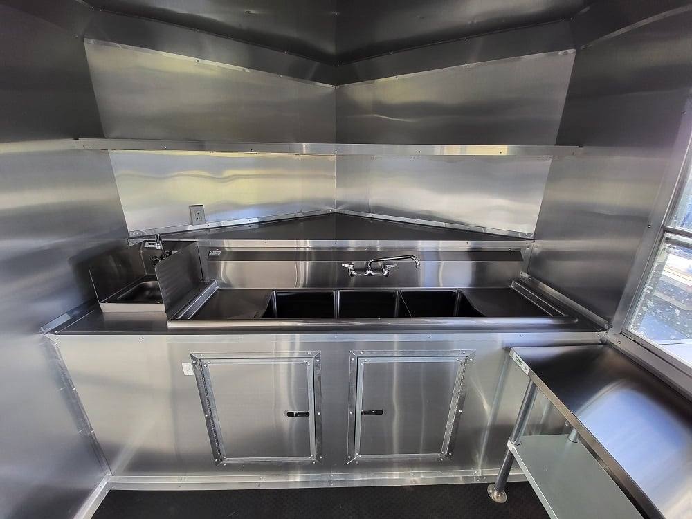 This concession trailer is designed with the sink package and features a three-bay sink and handwashing sink alongside, a 100 Amp electric panel with 50amp service cable, and an 8' porch area for a smoker to be installed. This unit is designed for BBQ vending but would also be able to serve other vending options.