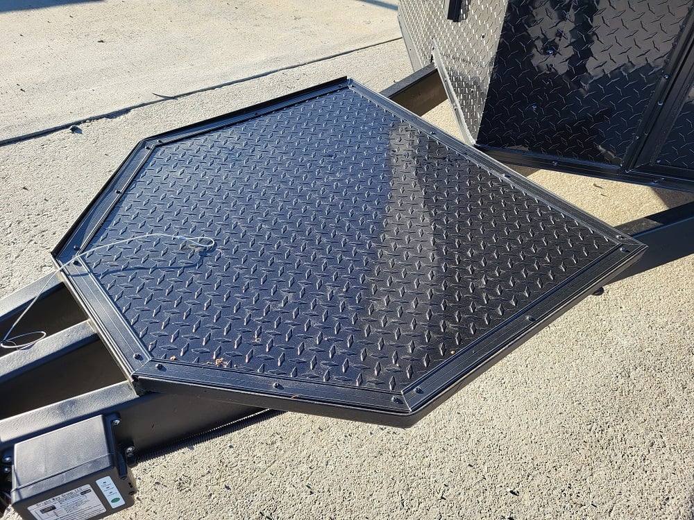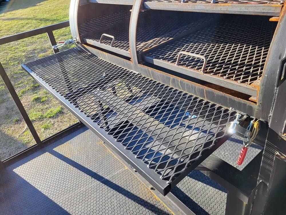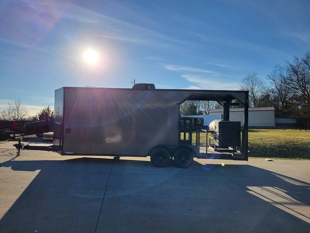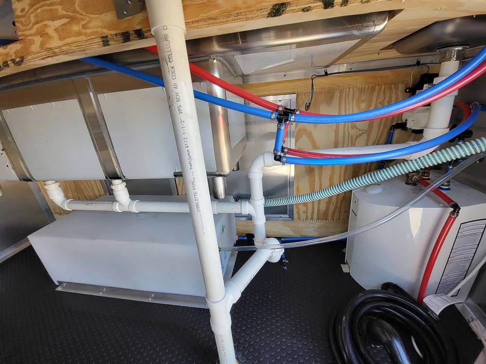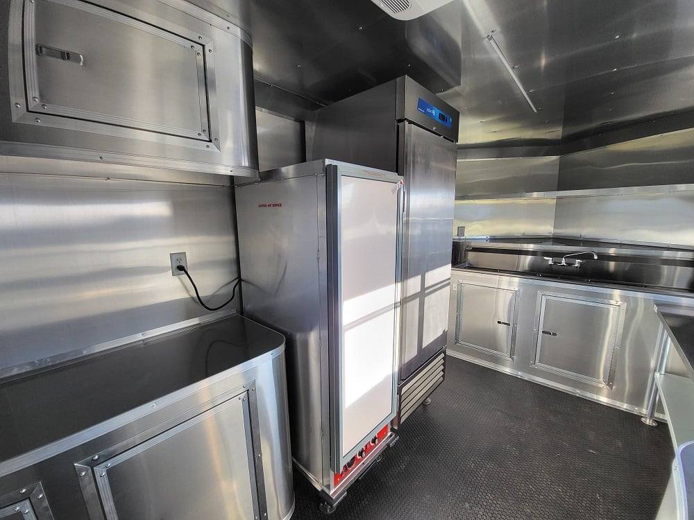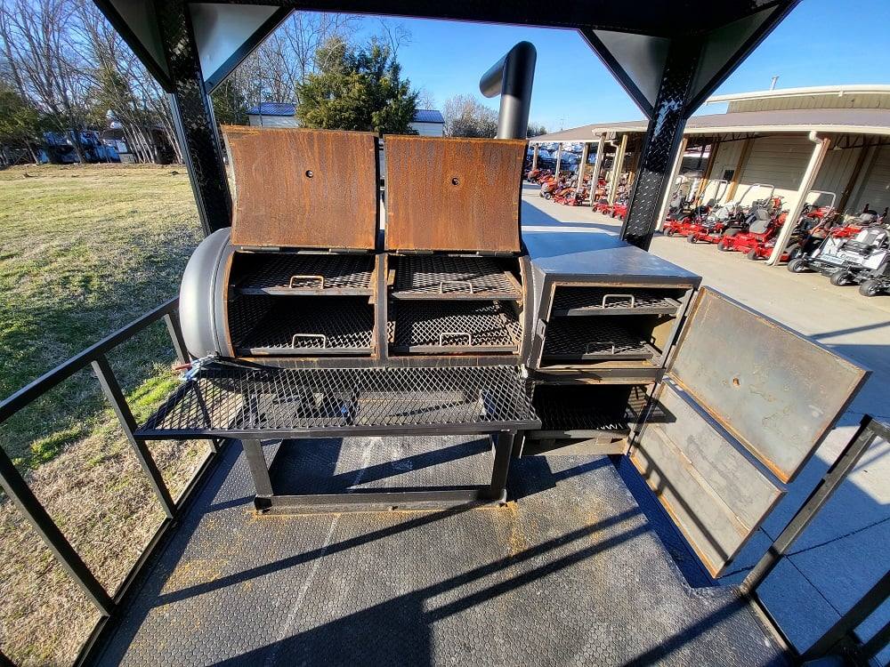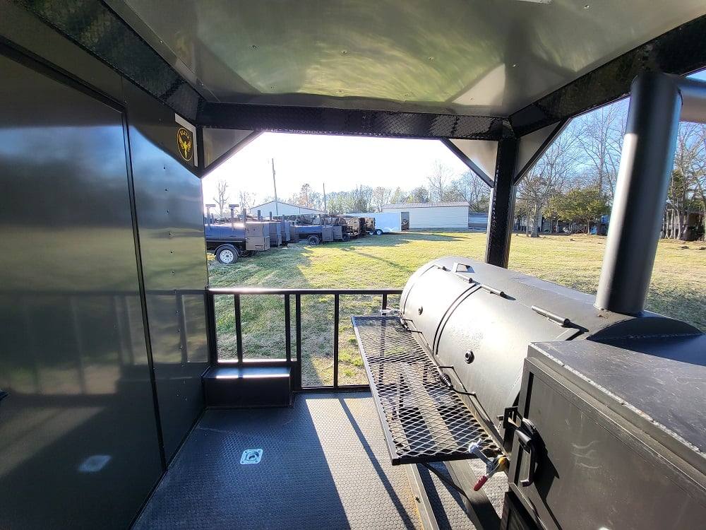 This concession trailer is designed with the sink package and features a three-bay sink and handwashing sink alongside, a 100 Amp electric panel with 50amp service cable, and an 8' porch area for a smoker to be installed. This unit is designed for BBQ vending but would also be able to serve other vending options.