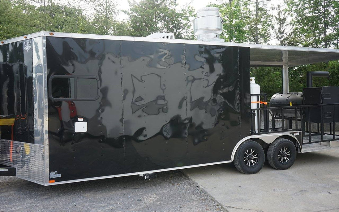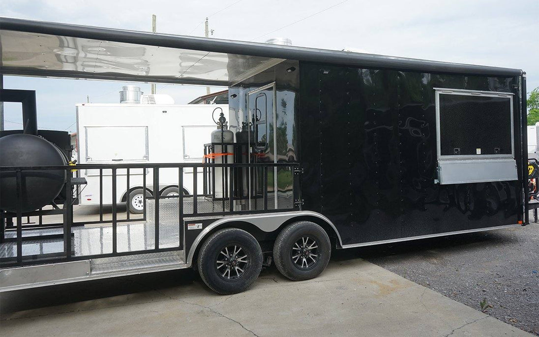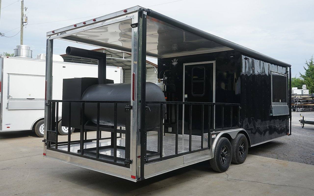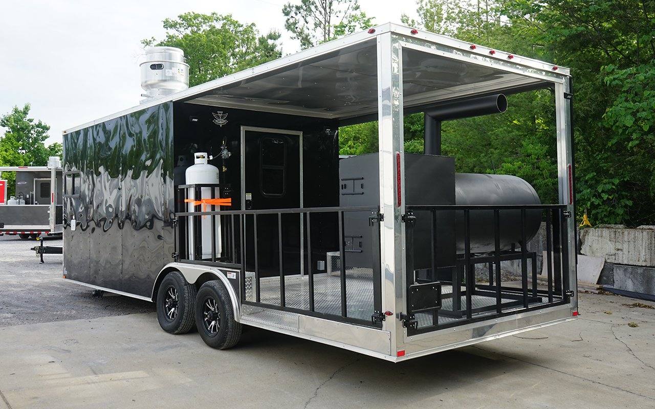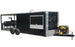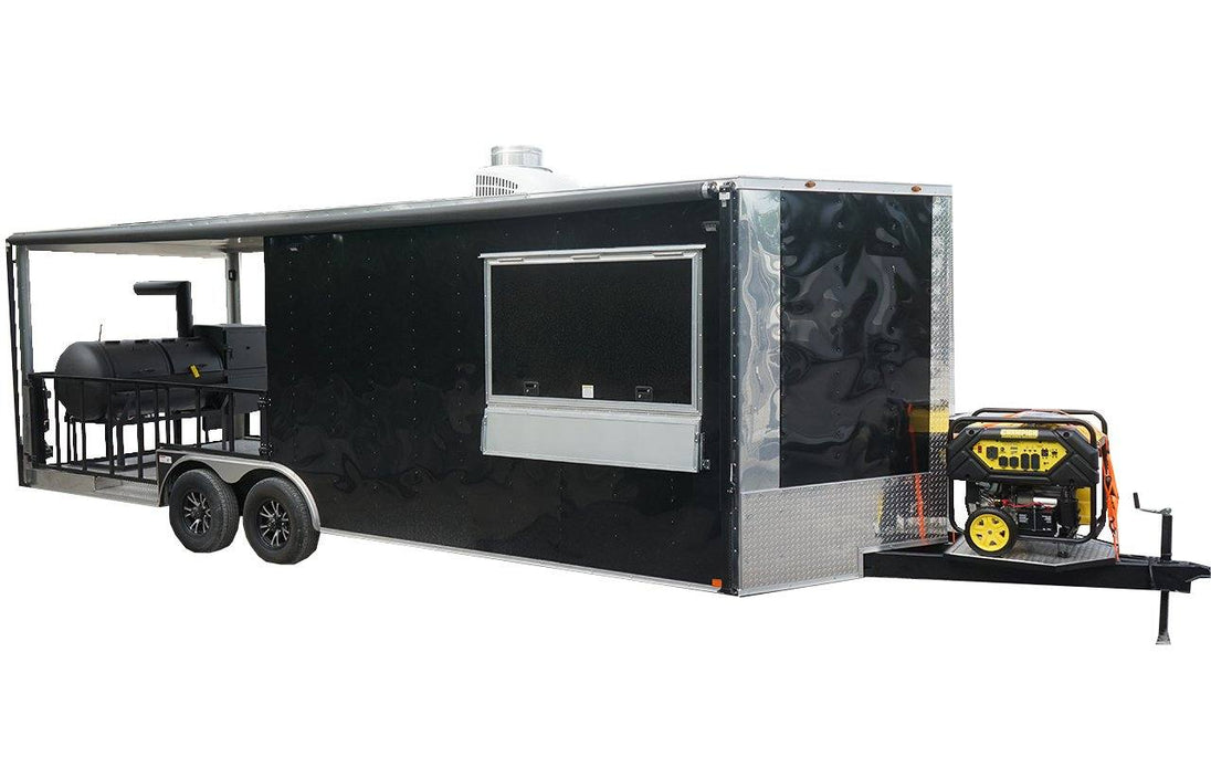 This concession trailer is an 8.5' X 24' unit that features a BBQ porch with space on the interior for cooking equipment designed with a fridge, fryer, and 24" griddle in mind. It has a 3 bay sink, hand sink with all the plumbing completed as well as an electric package installed.