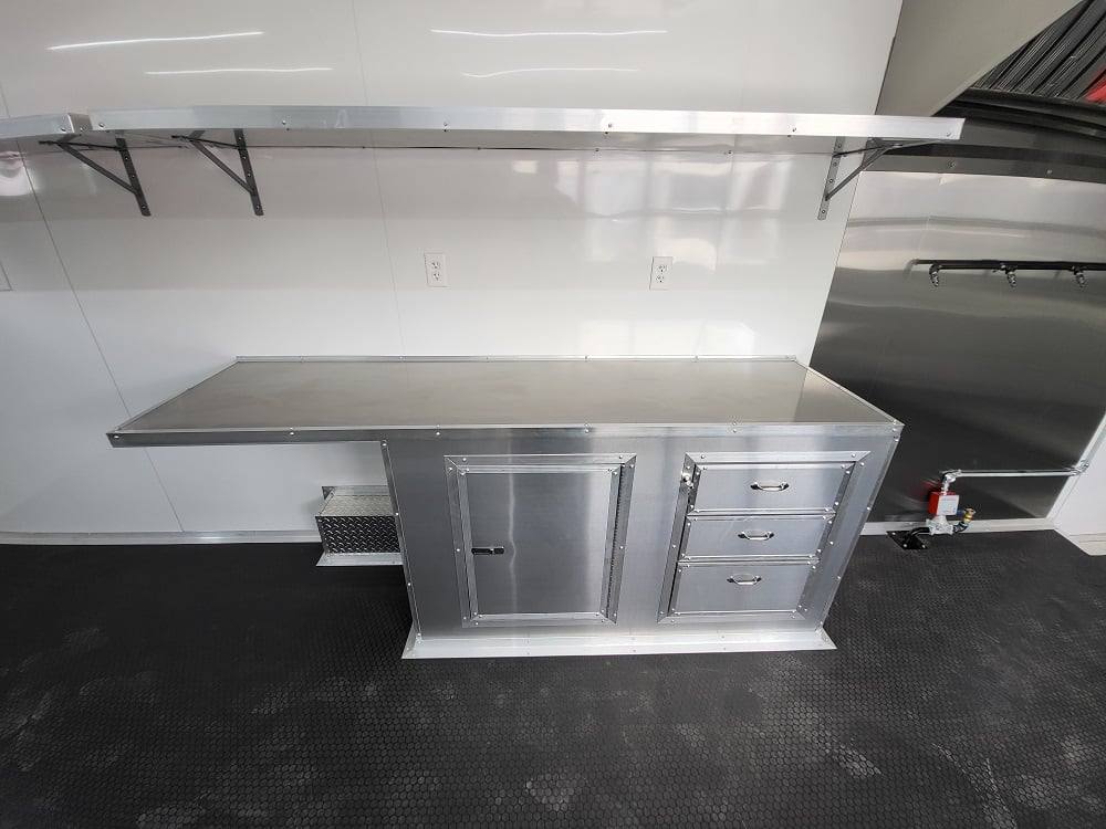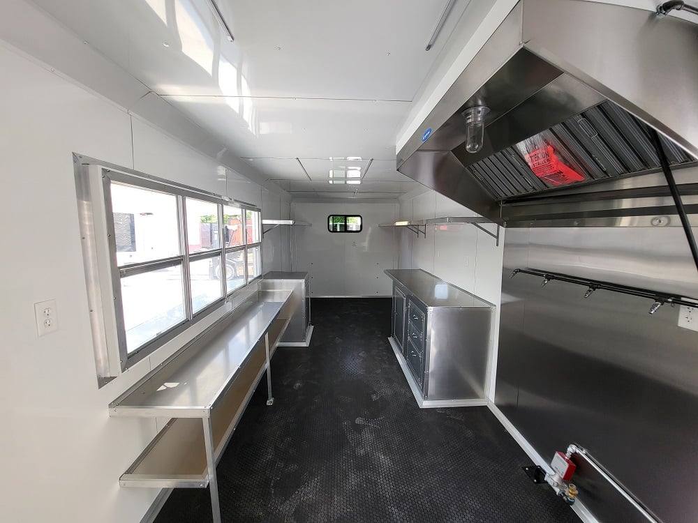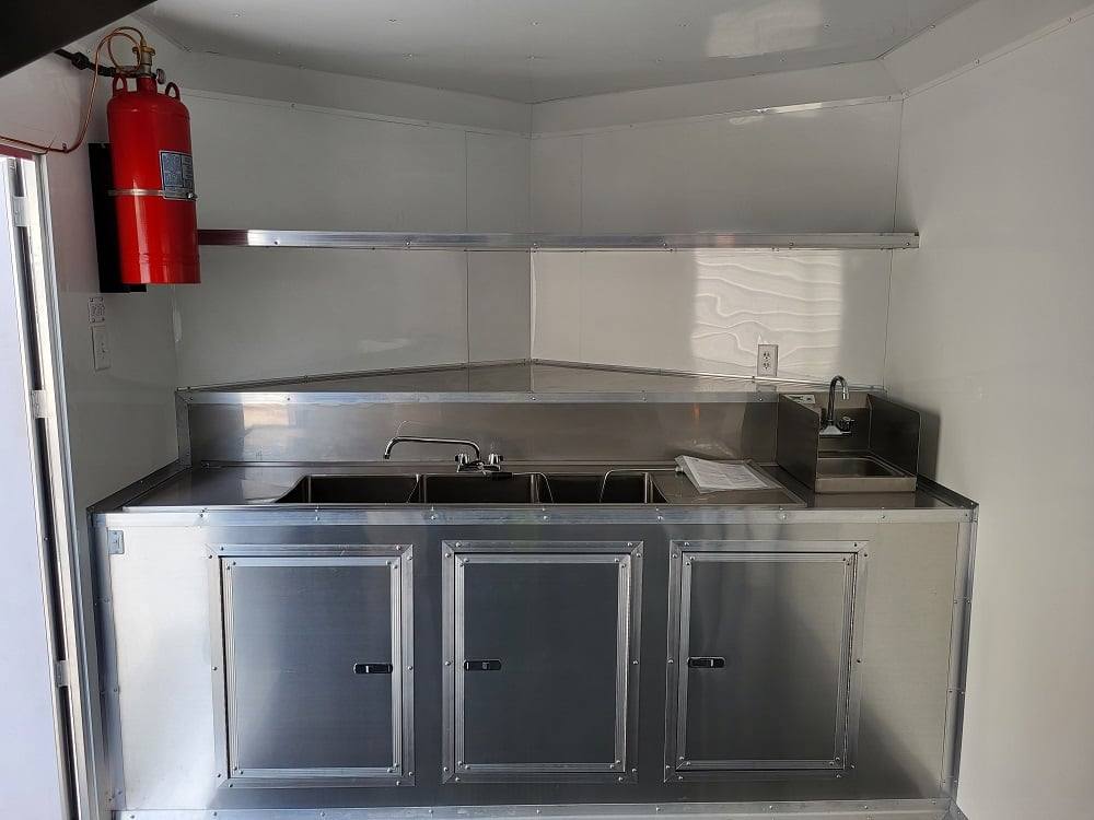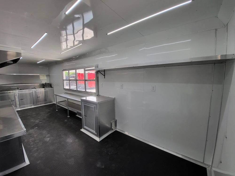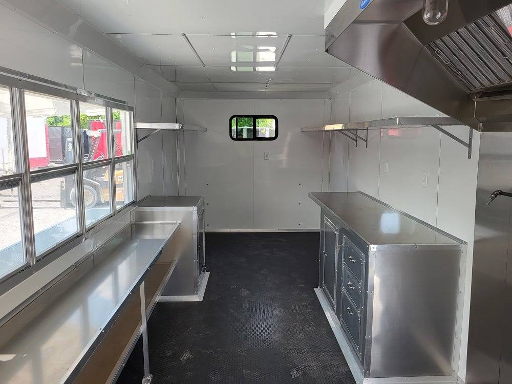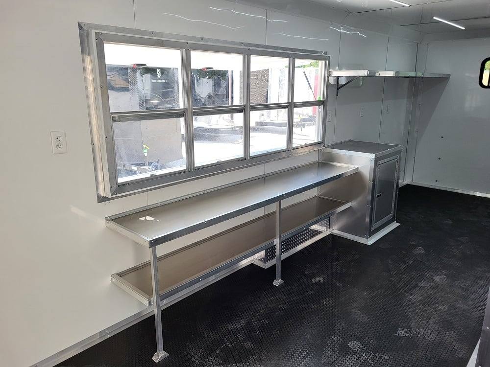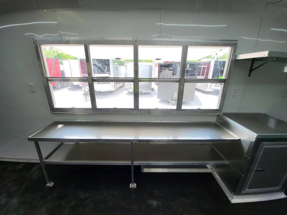 This concession trailer is designed with a 5-foot commercial grease hood and offers plenty of shelving or countertop for prep work and storage. The trailer also features an 8ft concession window with glass and screens for a wide area for vending.