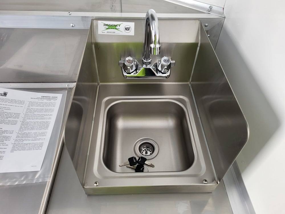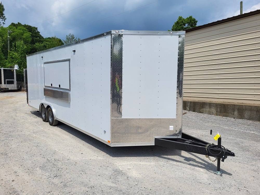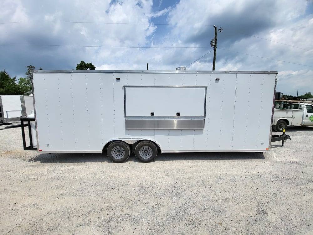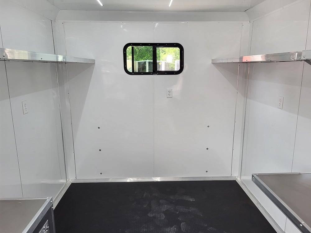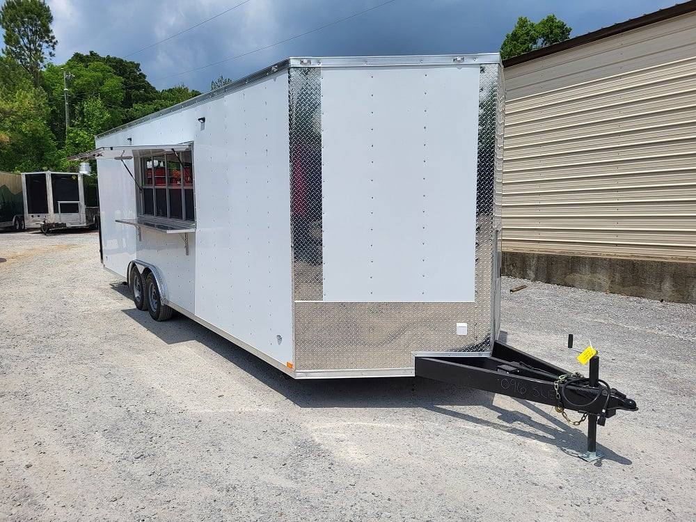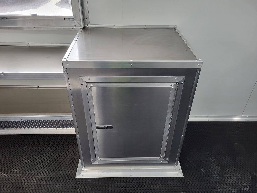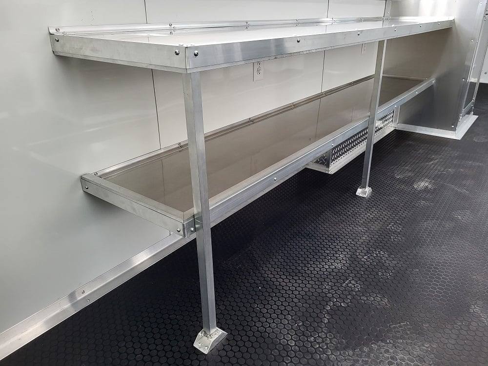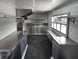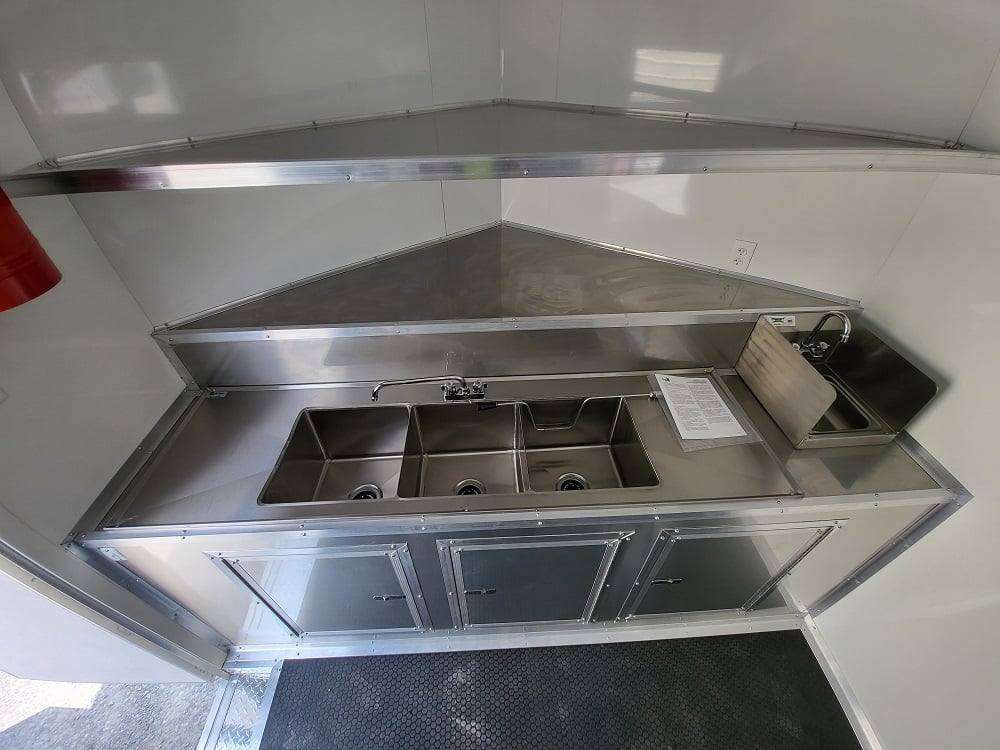 This concession trailer is designed with a 5-foot commercial grease hood and offers plenty of shelving or countertop for prep work and storage. The trailer also features an 8ft concession window with glass and screens for a wide area for vending.