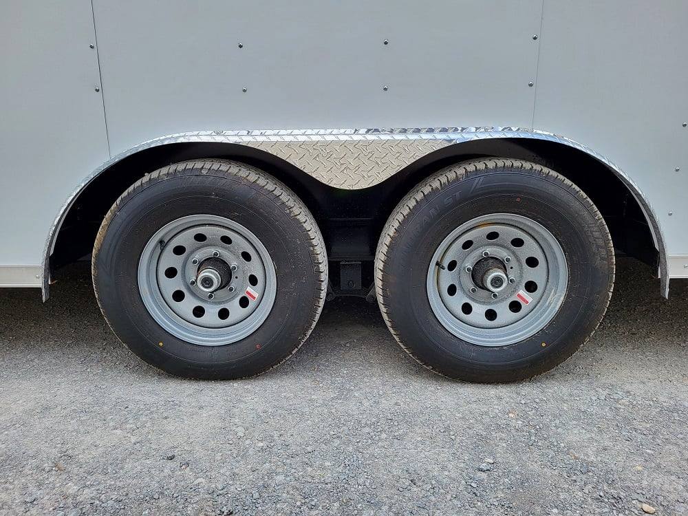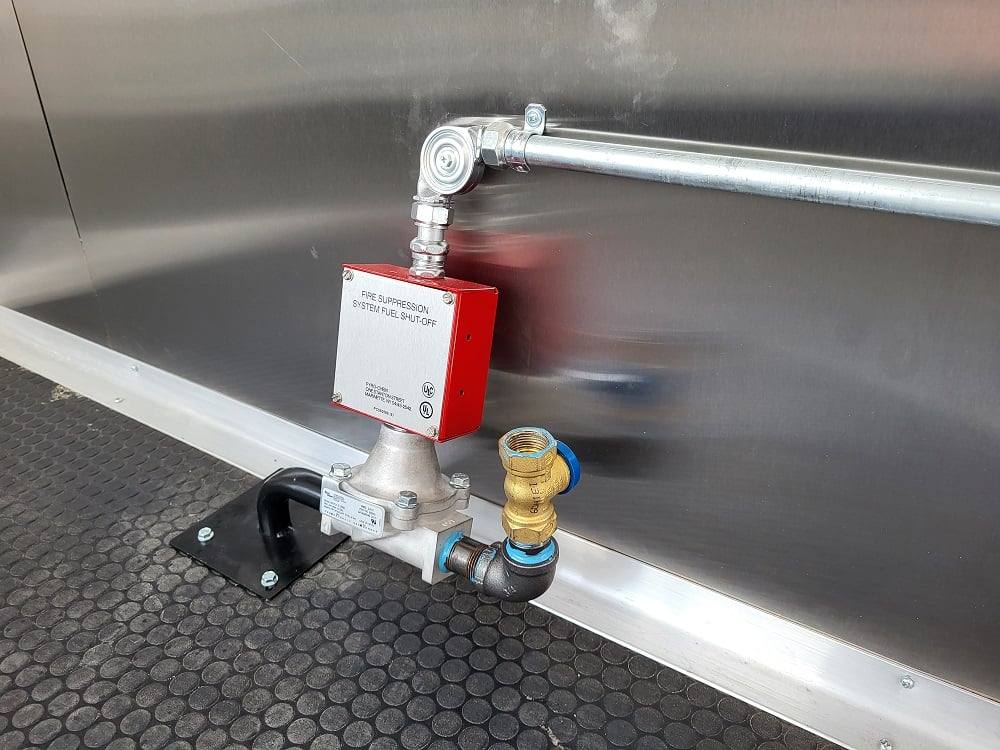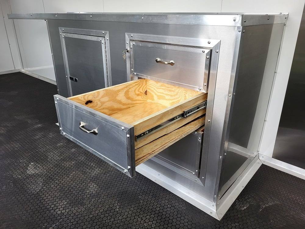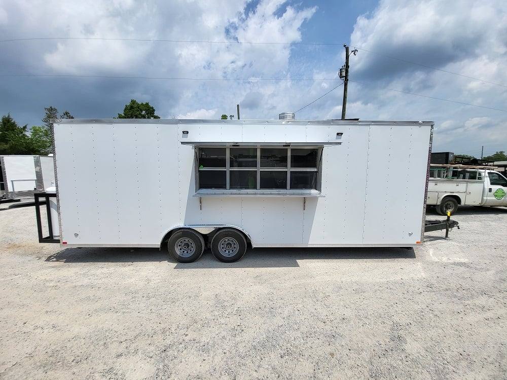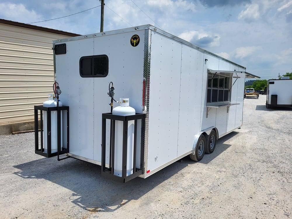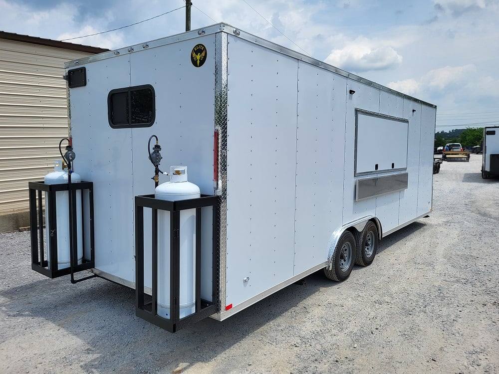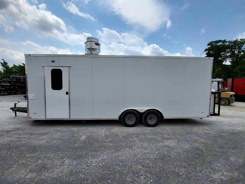This concession trailer is designed with a 5-foot commercial grease hood and offers plenty of shelving or countertop for prep work and storage. The trailer also features an 8ft concession window with glass and screens for a wide area for vending.