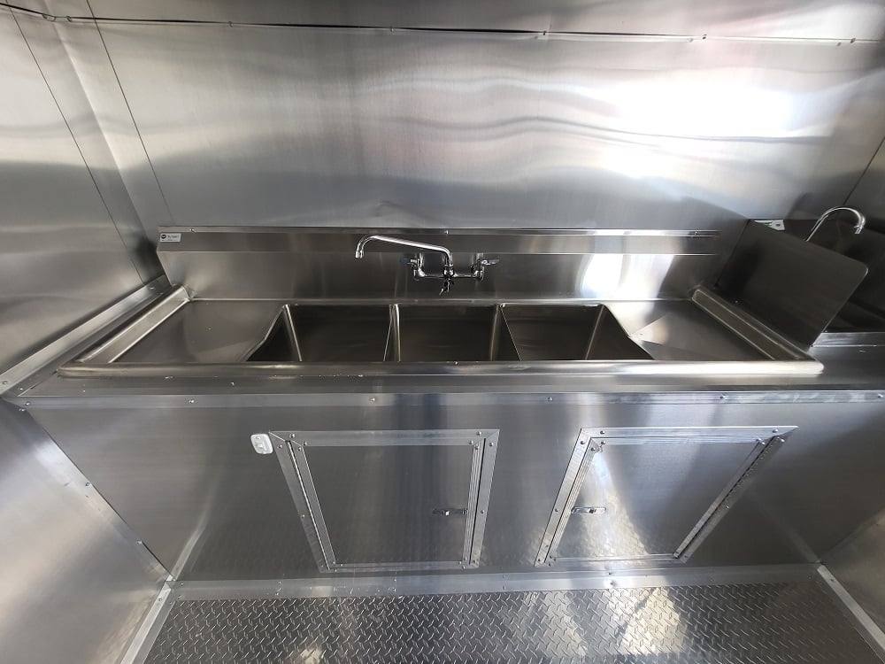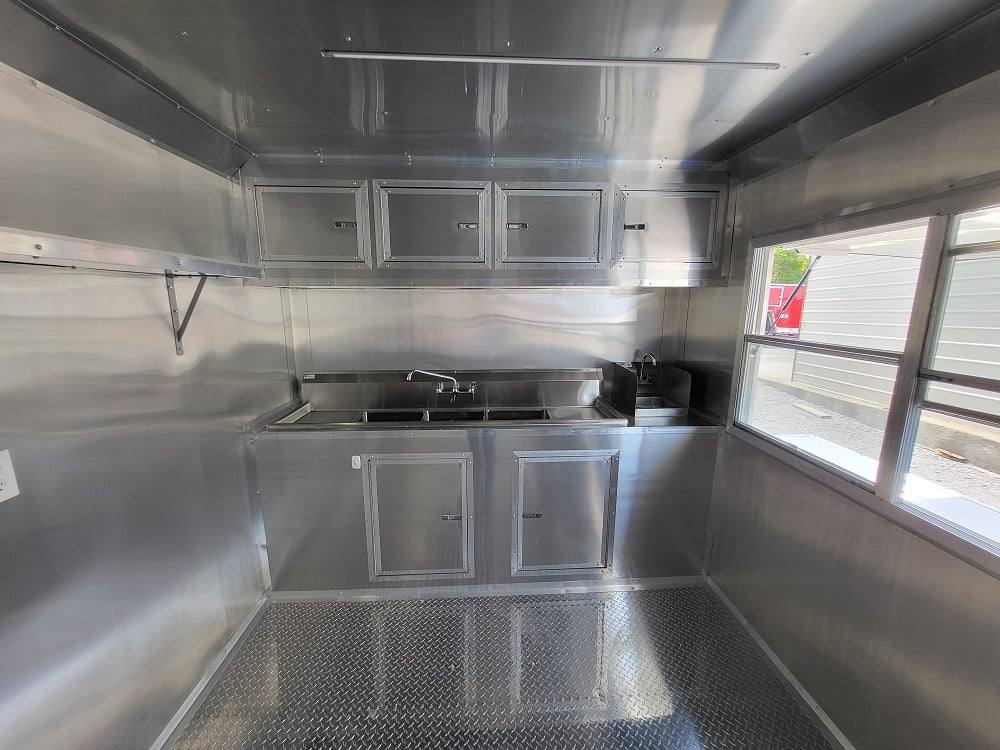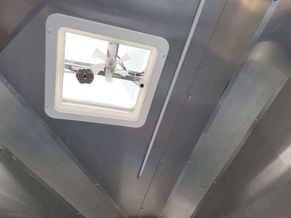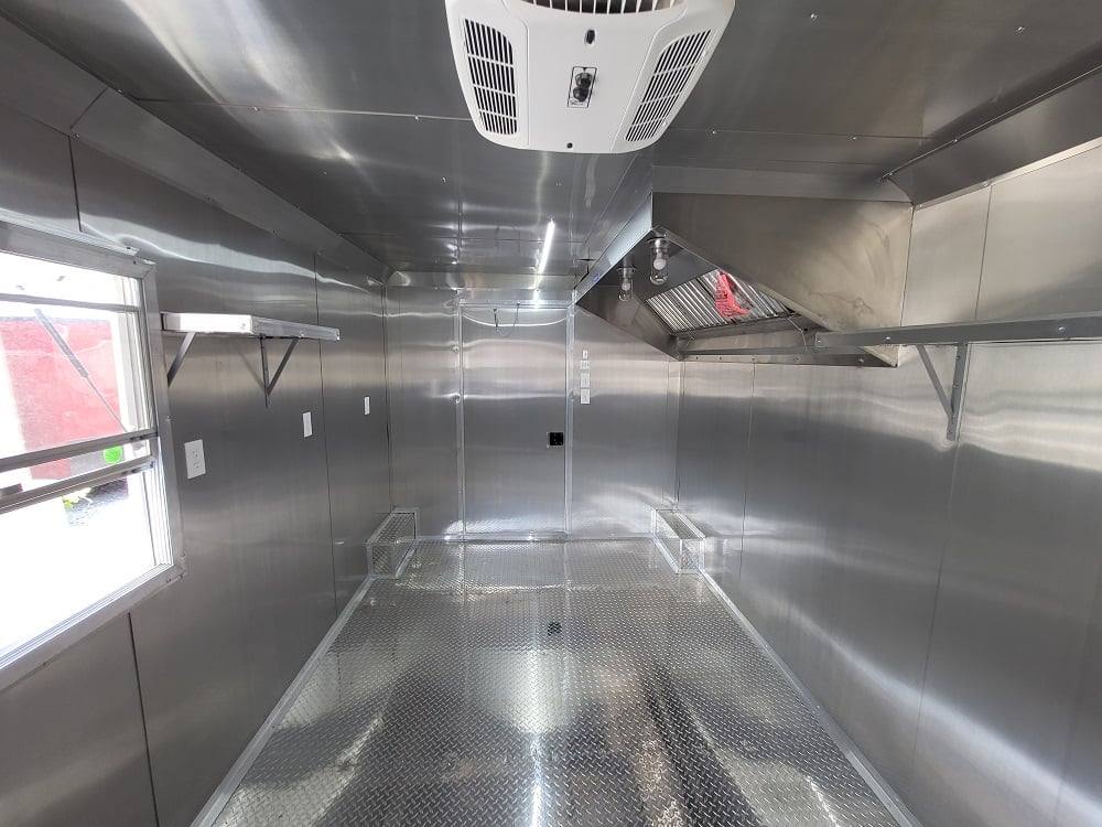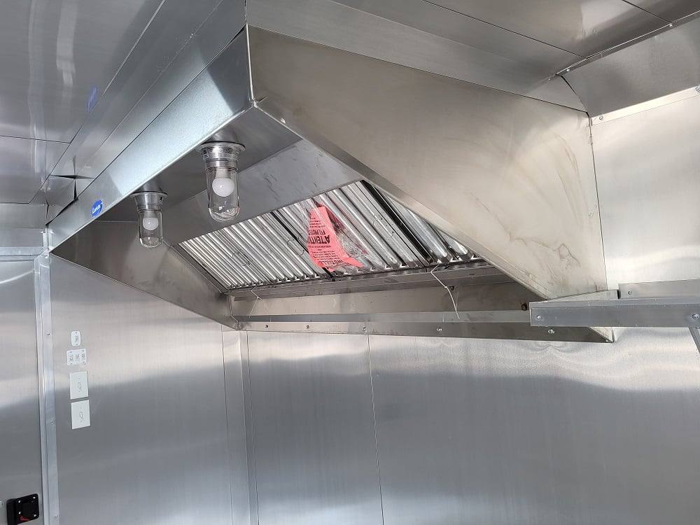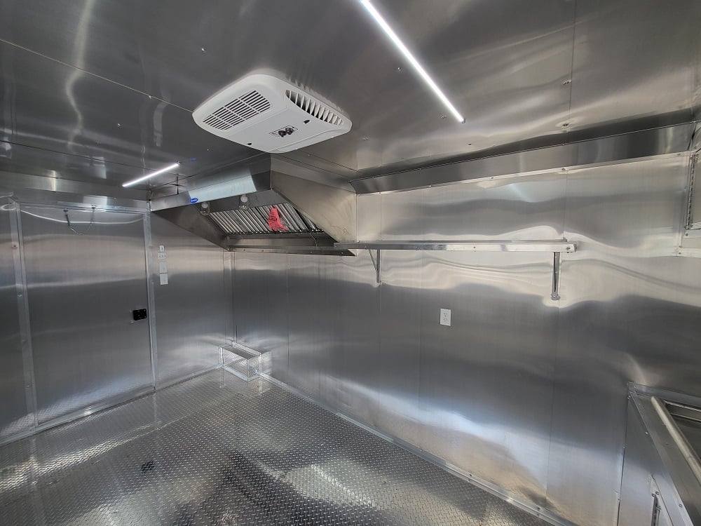 This concession trailer is designed with a 12' porch area designed for a custom smoker to be installed. This unit is designed with an extraction fan on the porch area as well as the interior kitchen comes with a 7ft commercial grease hood.