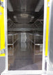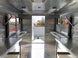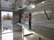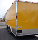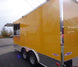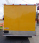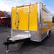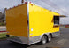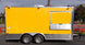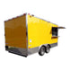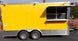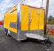 A custom concession trailer in yellow that measures 8.5 ft by 16 ft and includes two 5 ft food windows, cabinet and shelf package, 100 amp electrical package, triple sink package.