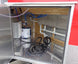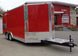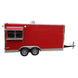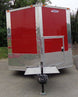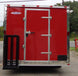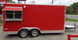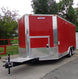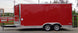 A red concession trailer, custom built, 8.5 ft by 16 ft and features a 4 ft food window, flip-up outside counter, generator platform, sink package, A/C and heat, 7 ft inside height.