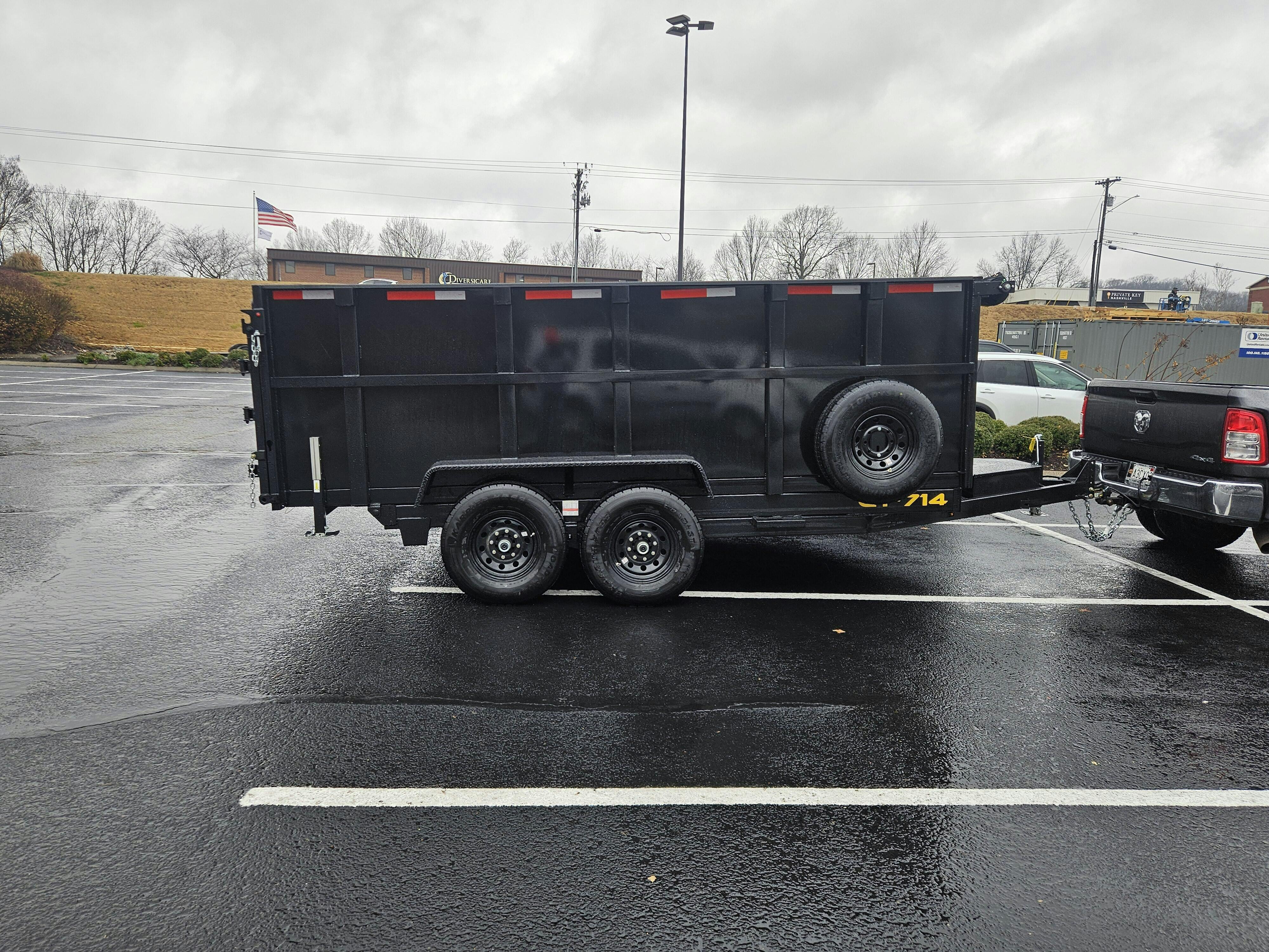 This 7x14 Low-Pro dump trailer features deep 4ft steel sides, a 14k GVWR, and a strong 3-stage telescopic lift system built for heavy commercial loads. Its 10-gauge steel floor, reinforced tube cross members, and EZ Lube 7k axles provide excellent durability and dependable performance. The 12V hydraulic pump with an Interstate battery delivers smooth lifting power, while LED lighting, welded D-rings, and a 2-way barn/spreader gate add everyday usability. With 16" radial tires, a powder-coat finish, and a stable leaf-spring suspension, it’s designed for reliable towing on any jobsite. A 10,096lb payload capacity makes it ideal for hauling dirt, debris, and equipment.