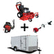 This package includes a 48 inch Bradley 48WT-BS25 walk behind mower with a 25 horsepower Briggs and Stratton V Twin engine, a Shindaiwa EB600RT backpack blower, a Shindaiwa T235 string trimmer, and a 6 x 12 enclosed trailer.