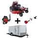 This package includes a 52 inch Bradley 52SC-BS26 compact stand on mower with a 26 horsepower Vanguard engine, a Shindaiwa EB600RT backpack blower, a Shindaiwa T235 string trimmer, and 6 x 12 enclosed trailer.