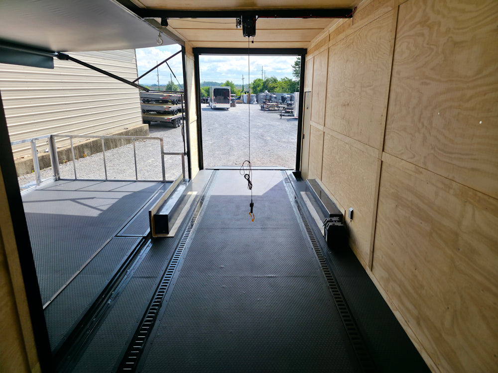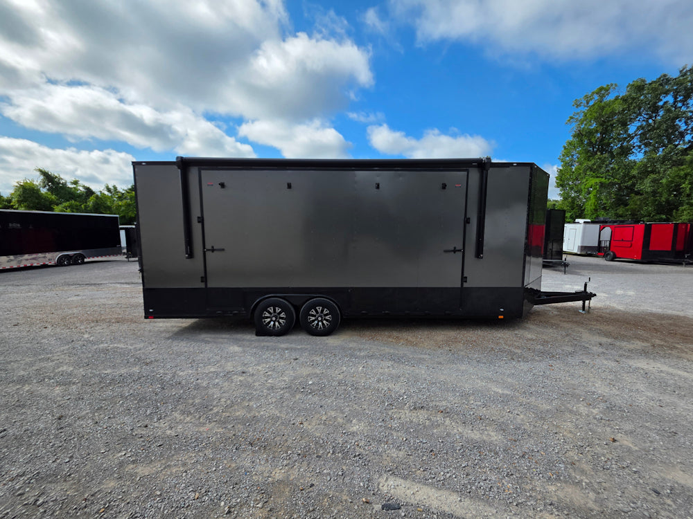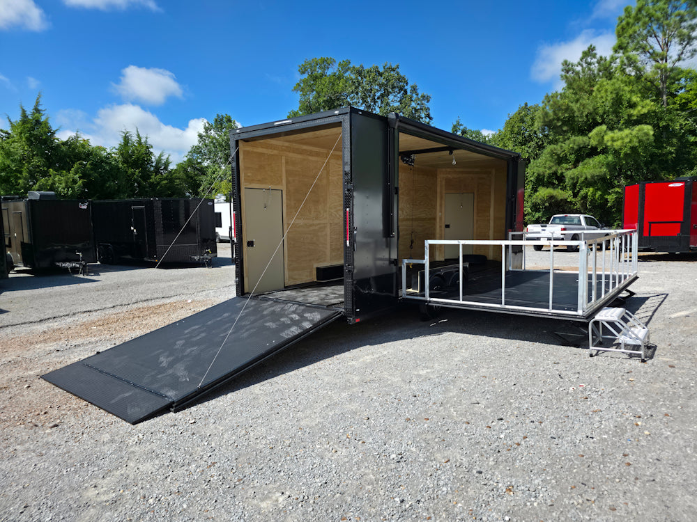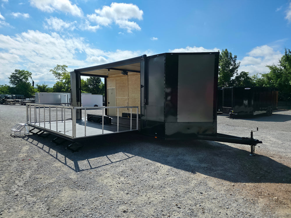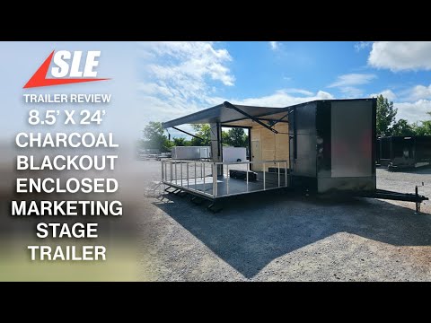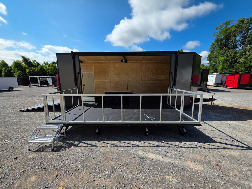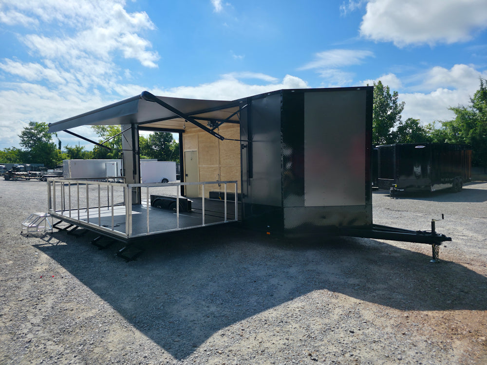 This 8.5’ x 24’ custom enclosed stage trailer is purpose-built for live events, marketing events, and mobile presentations. It features a 16’ fold-out stage with railing and steps, 9’ interior height, dual 7,000 lb torsion axles, and full rubber coin flooring throughout. With a sleek charcoal gray exterior, blackout trim, 18’ awning, and insulated wood-finished interior, it delivers both functionality and professional style.