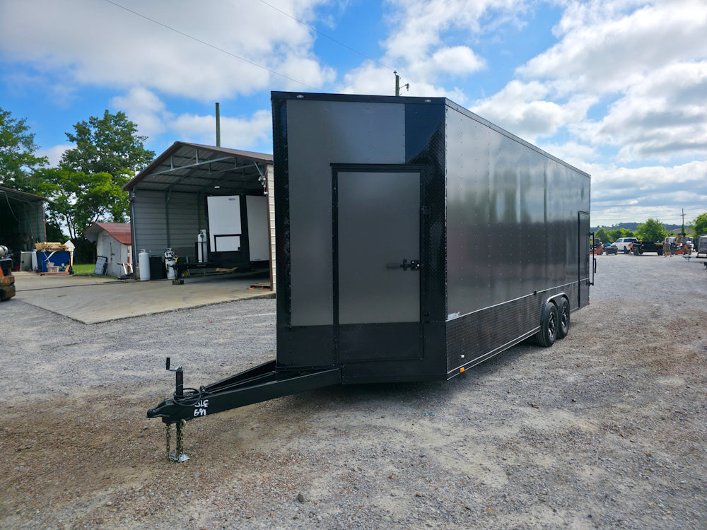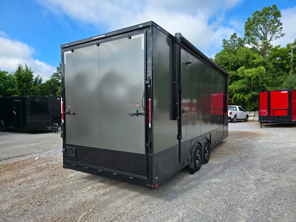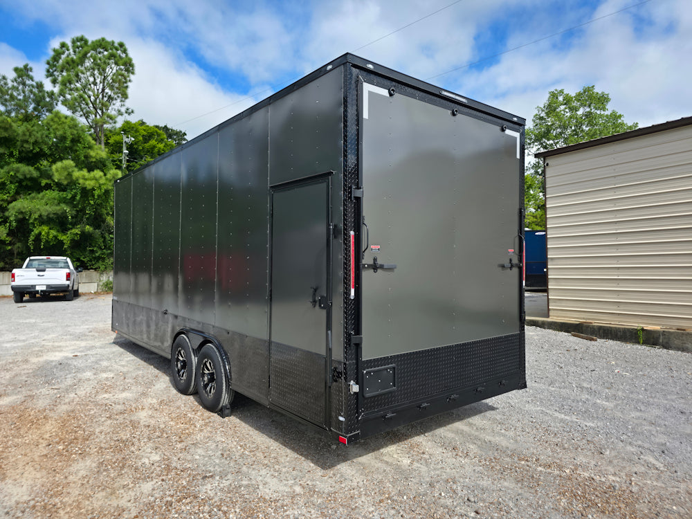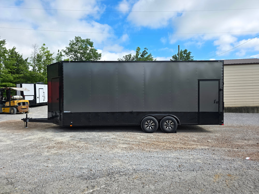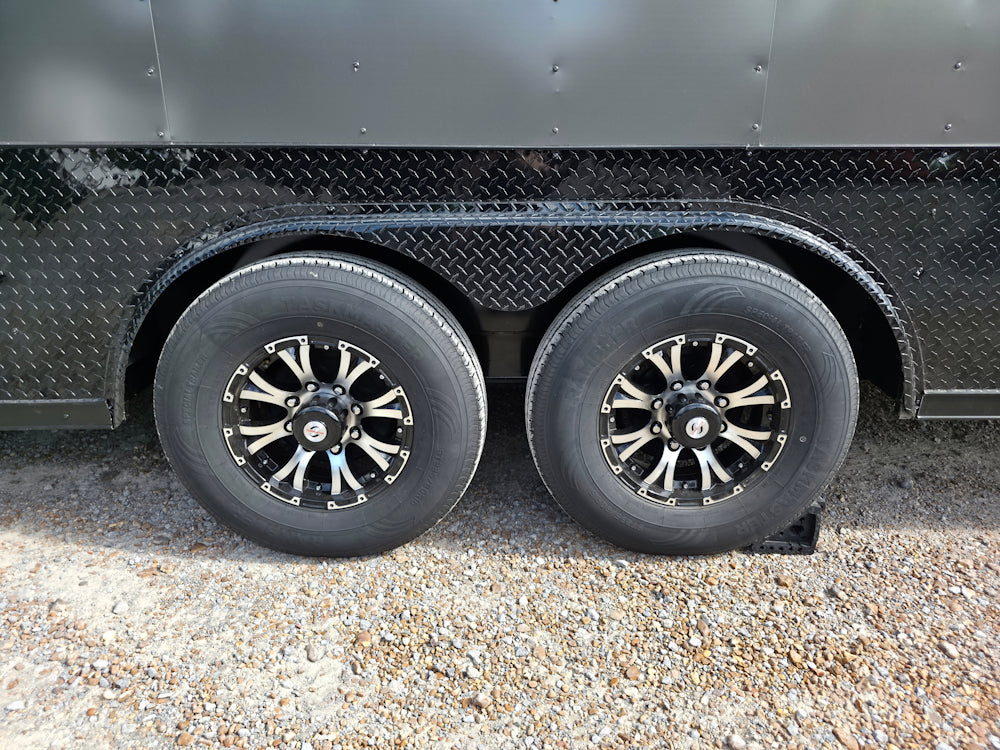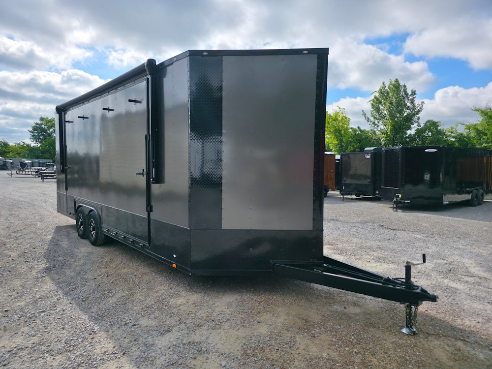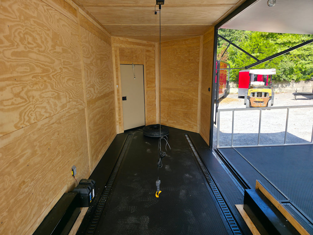 This 8.5’ x 24’ custom enclosed stage trailer is purpose-built for live events, marketing events, and mobile presentations. It features a 16’ fold-out stage with railing and steps, 9’ interior height, dual 7,000 lb torsion axles, and full rubber coin flooring throughout. With a sleek charcoal gray exterior, blackout trim, 18’ awning, and insulated wood-finished interior, it delivers both functionality and professional style.