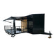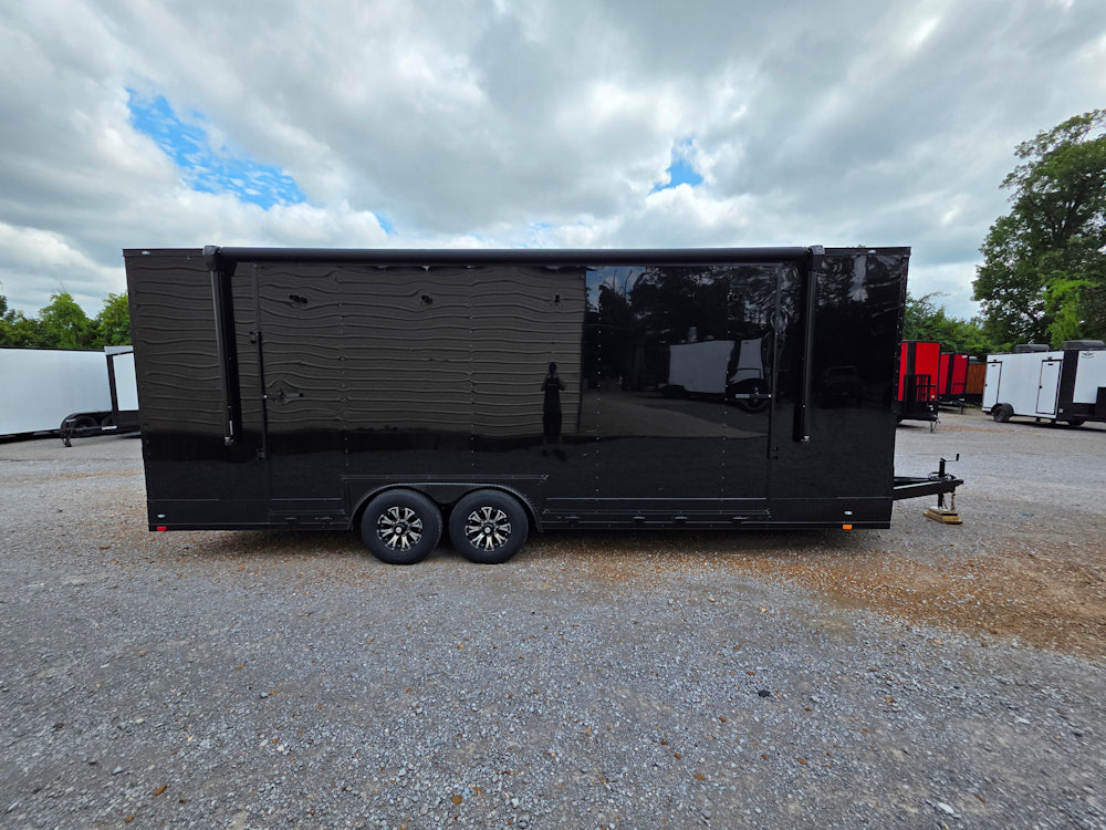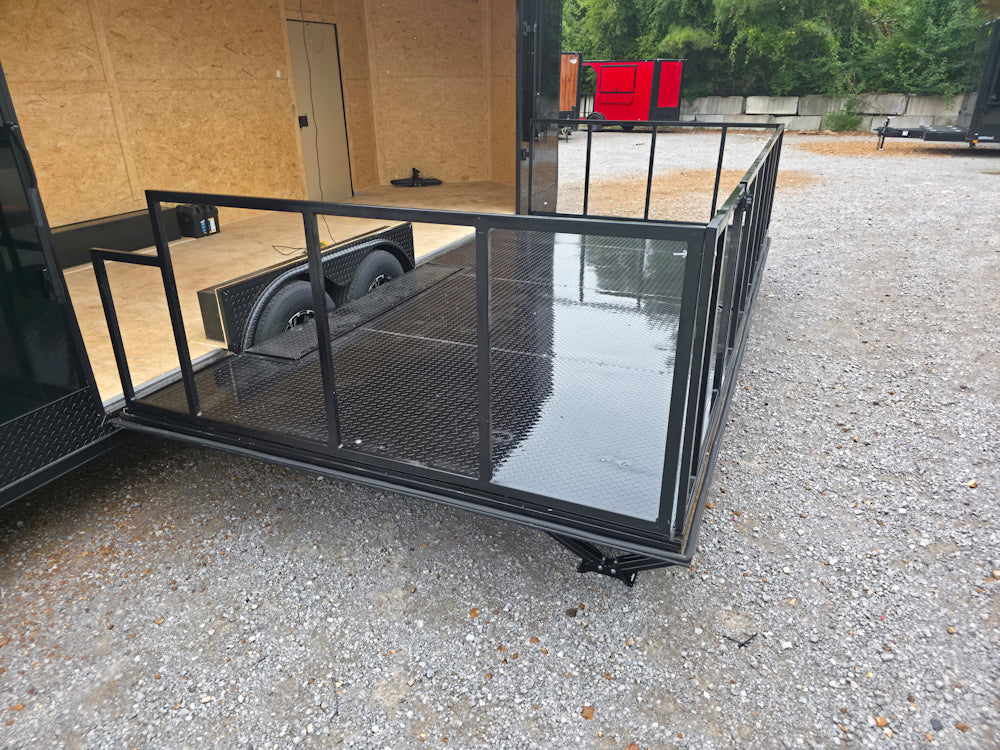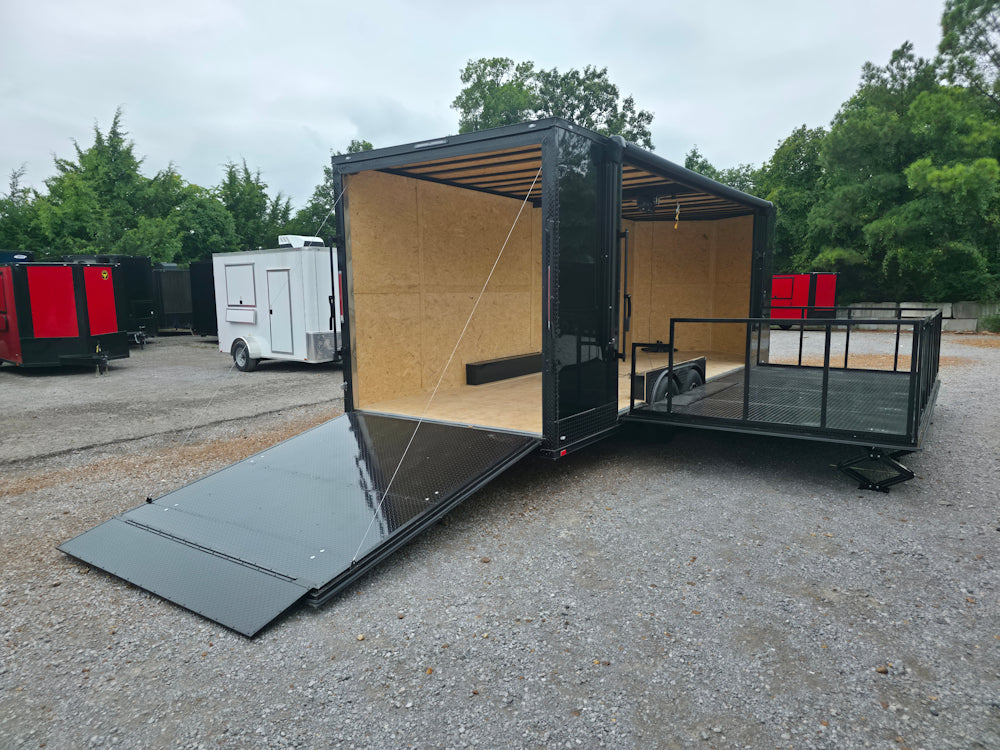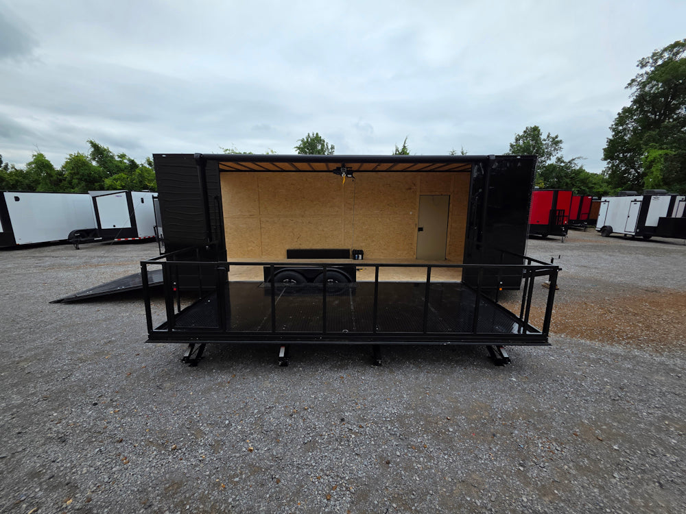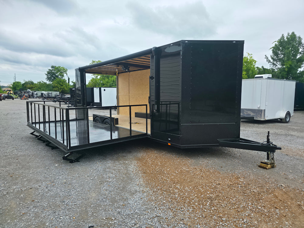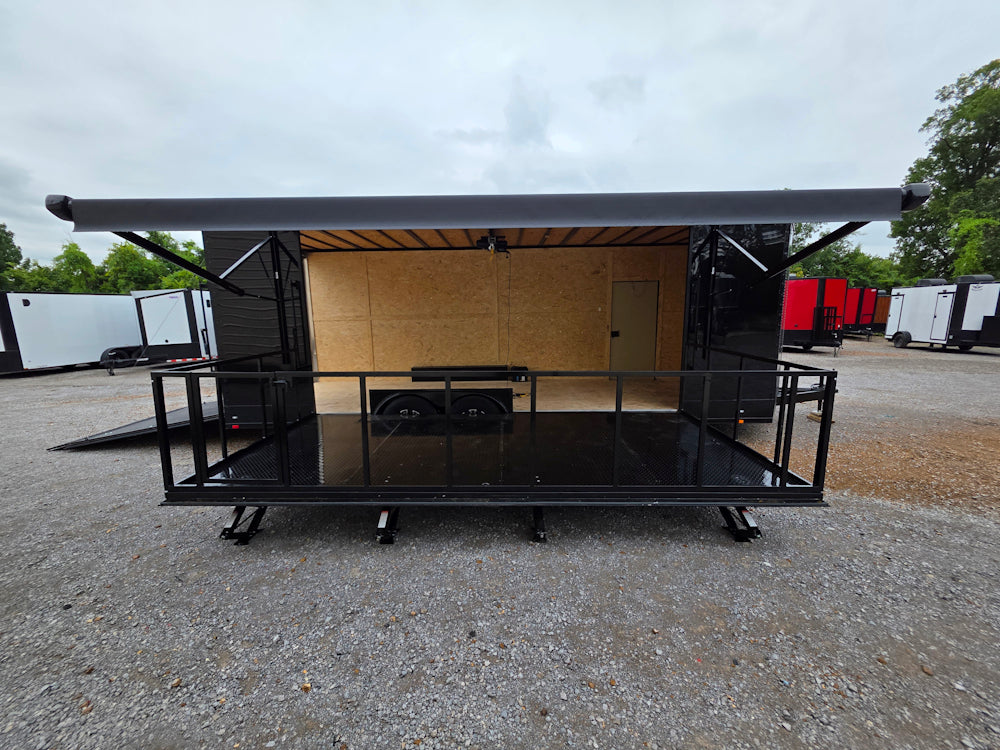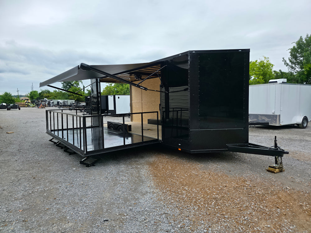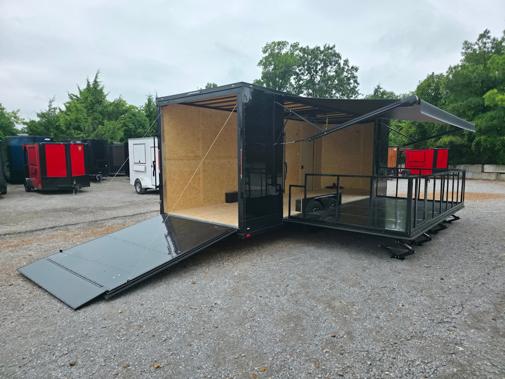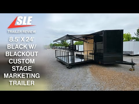 This 8.5' x 24' custom stage and marketing showcase trailer features a 16' hoist-supported stage with black ATP-wrapped railing, steps, and stabilizing jacks. Its sleek semi-screwless black exterior with blackout trim, 18' awning, and wood-finished interior create a high-end, professional presence at any event. With dual 7,000 lb axles, mag wheels, and a convertible rear ramp platform, it’s built for versatility, style, and smooth performance on the road.