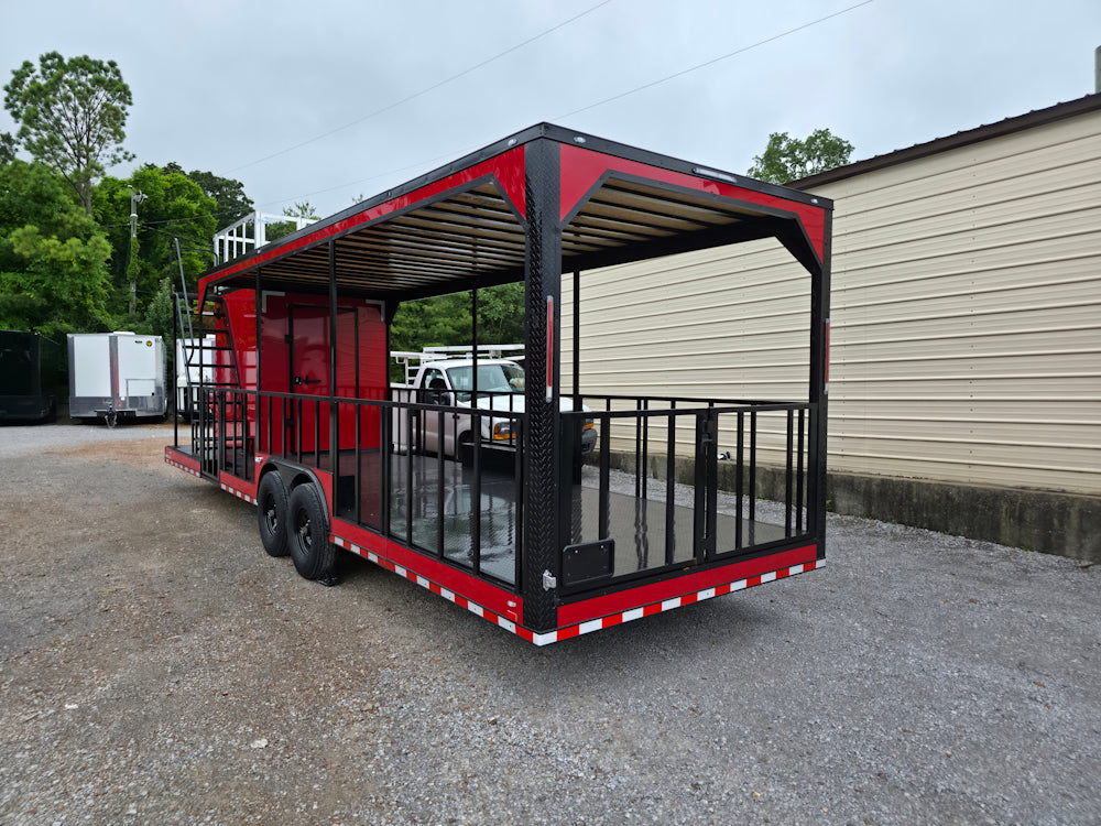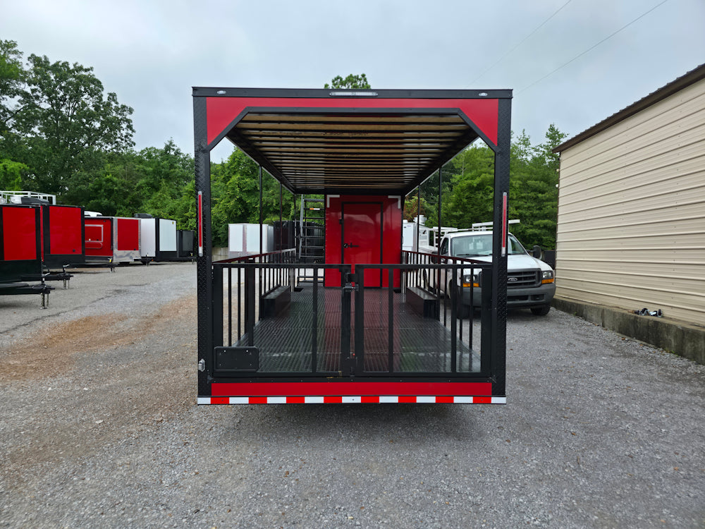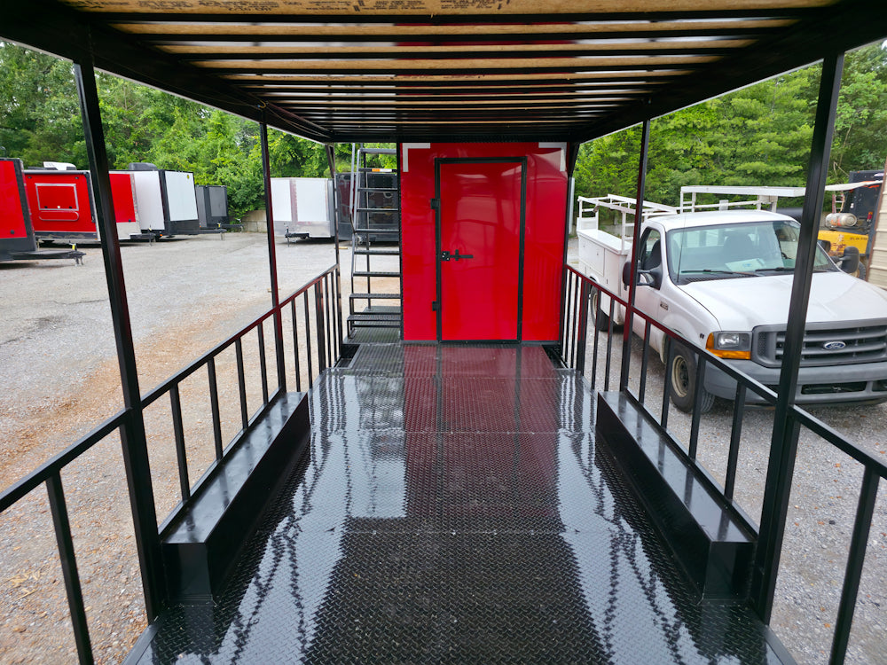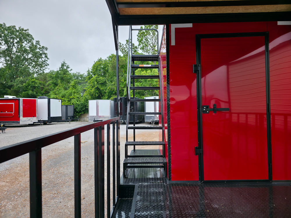 • Covered rear deck: 23' covered open area with 36" side rails, 36" side entry gate, and barn-door-style rear railing for safety and workflow efficiency