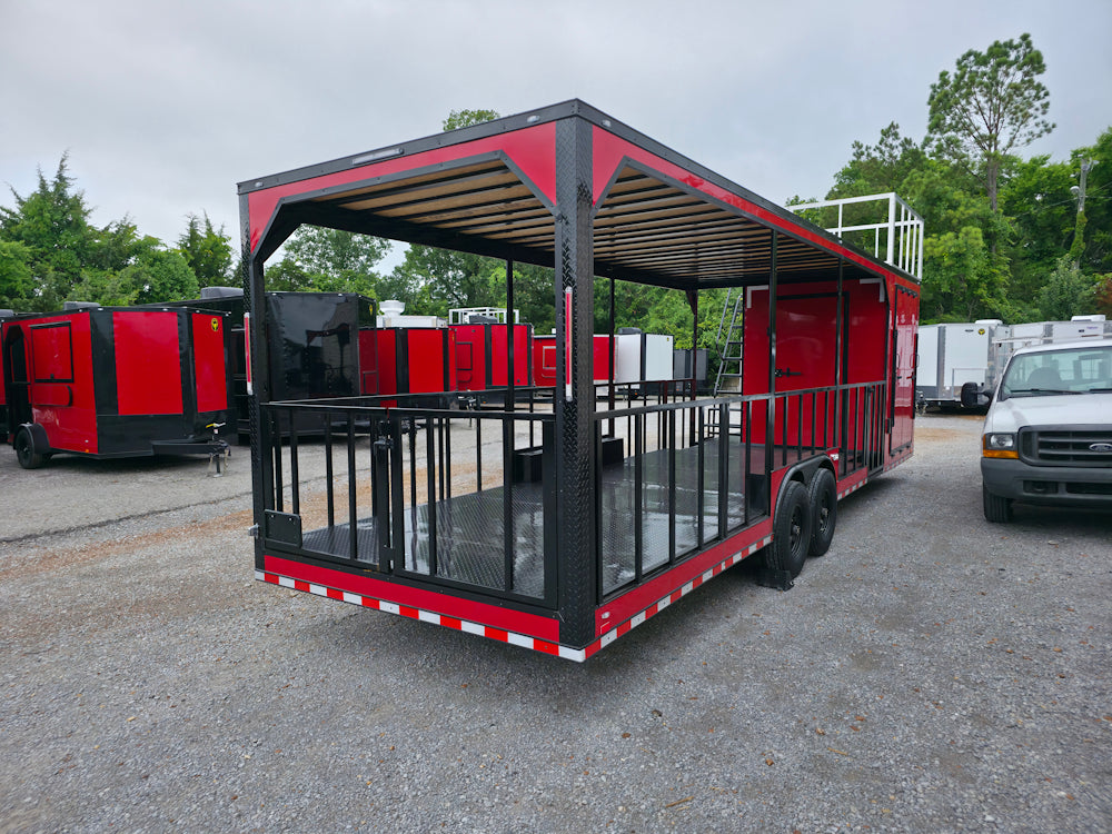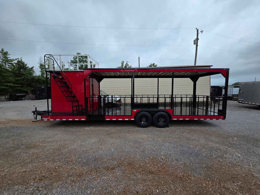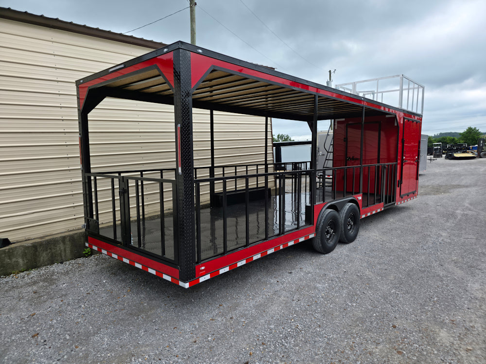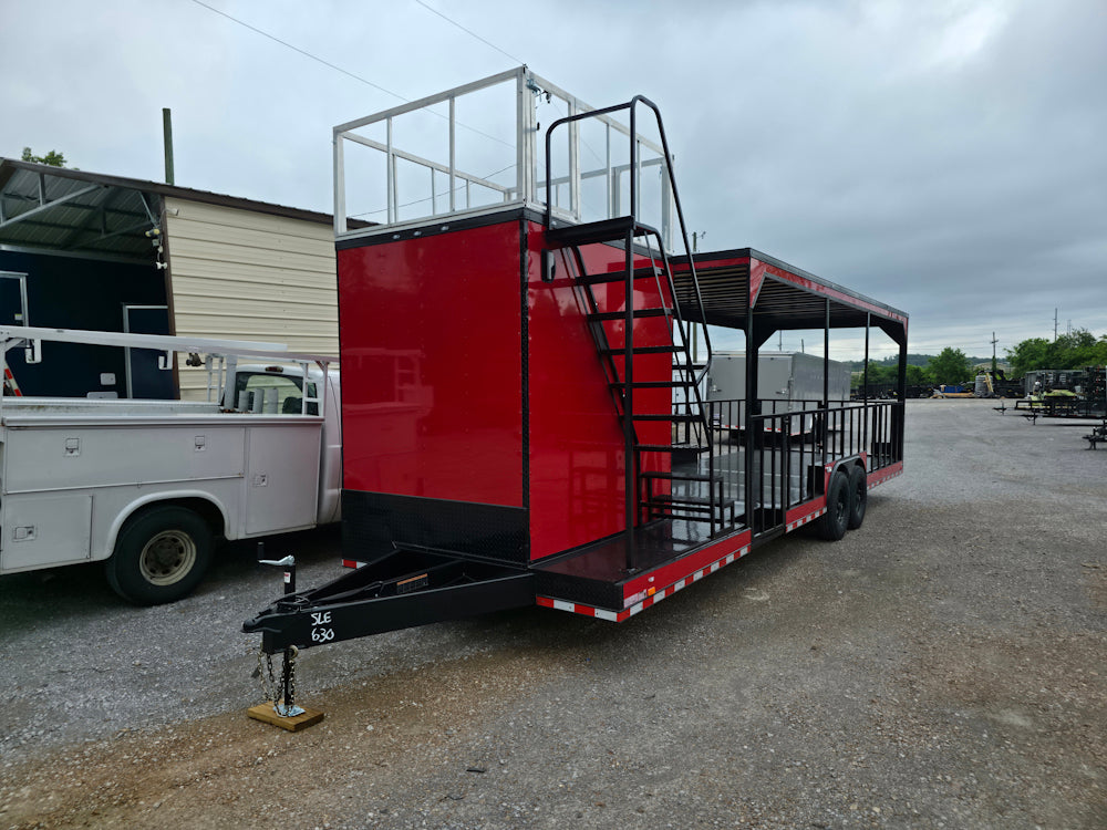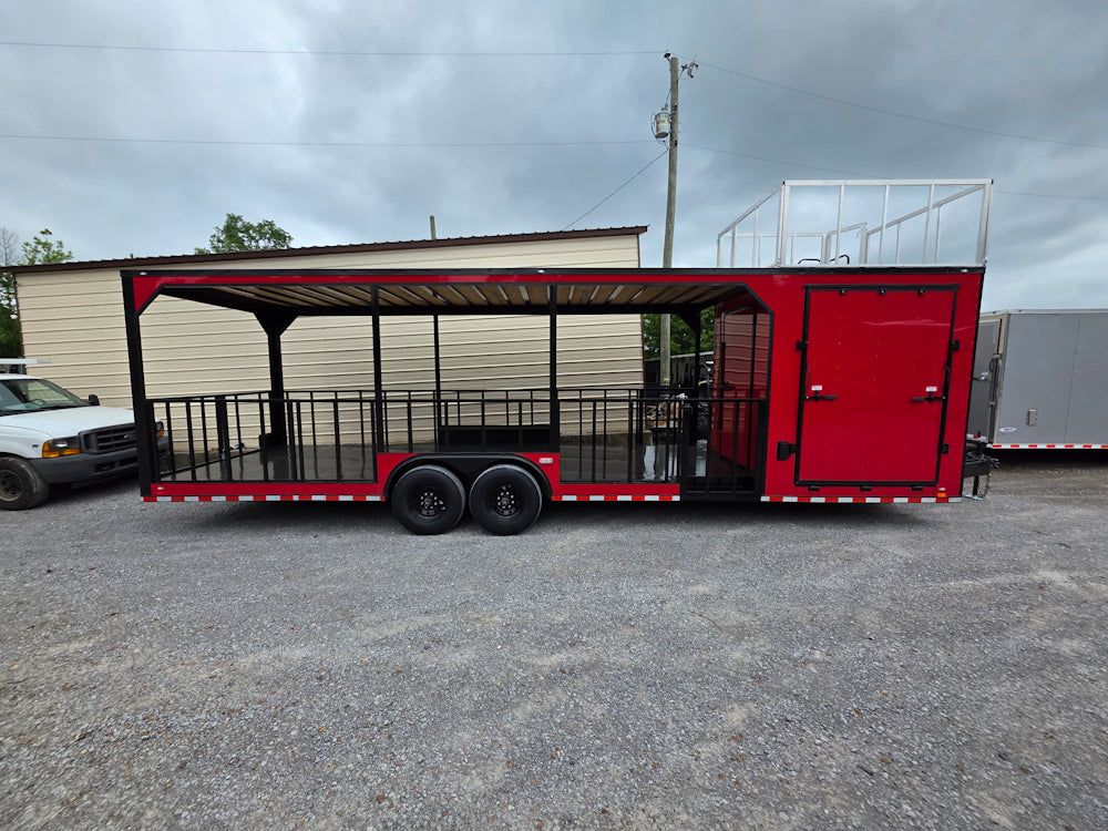 • Covered rear deck: 23' covered open area with 36" side rails, 36" side entry gate, and barn-door-style rear railing for safety and workflow efficiency
