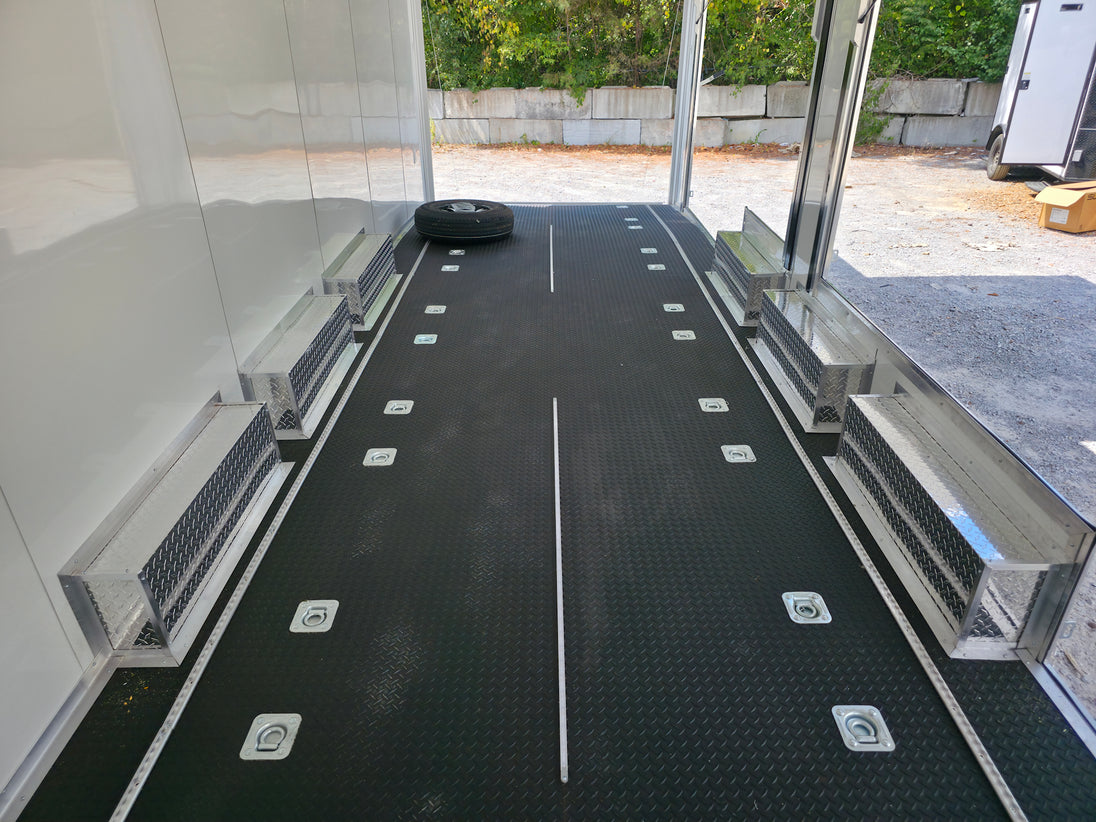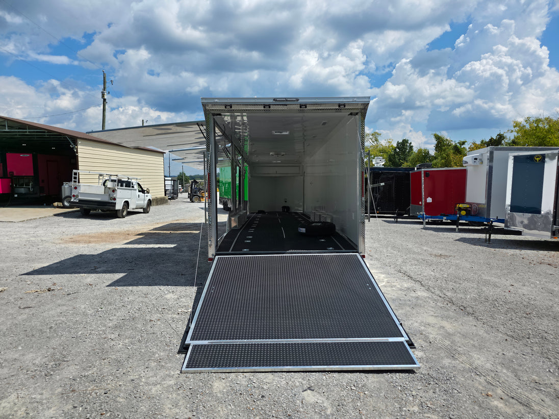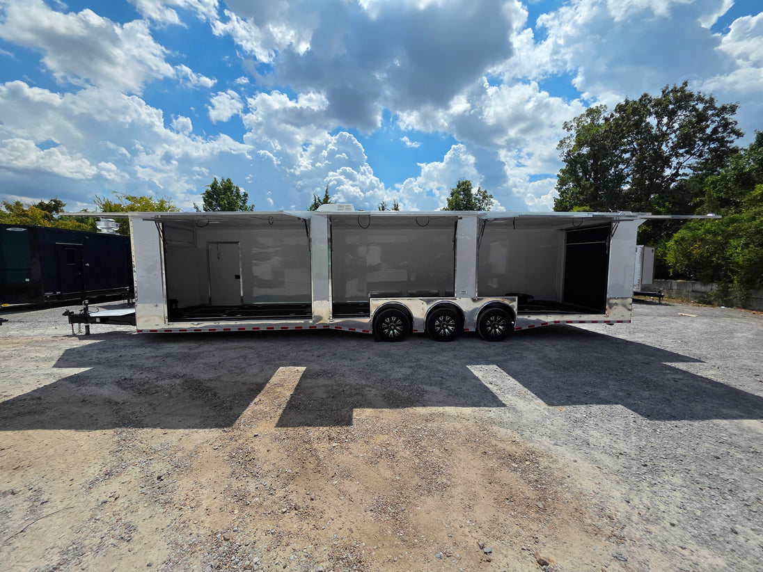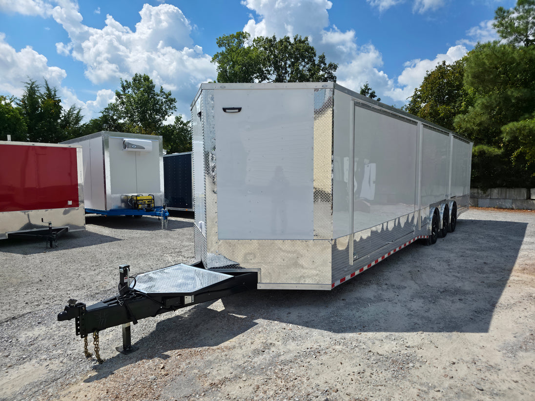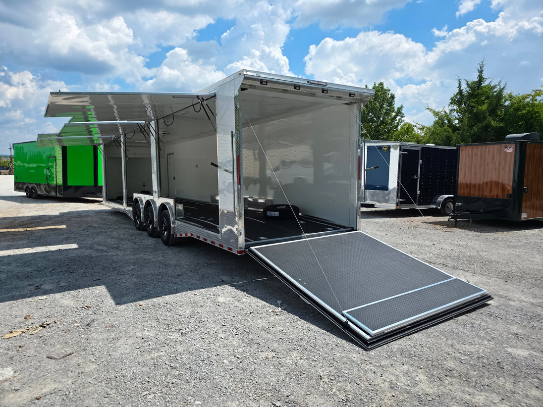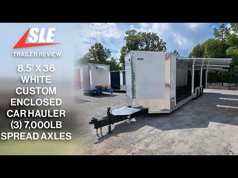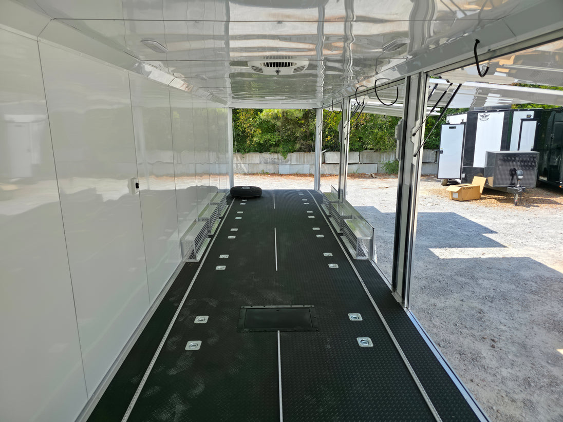 This 8.5' x 36' custom car hauler is built for serious hauling, storage, and performance with triple 7,000 lb spread axles and a spacious 7.5' interior height. Packed with premium features like a rear spoiler, recessed 5,500 lb winch, extensive lighting, it’s designed to handle any job in comfort and style. Durable finishes, insulated walls, and smart storage solutions make this trailer a professional-grade choice for transporting vehicles or equipment with ease.