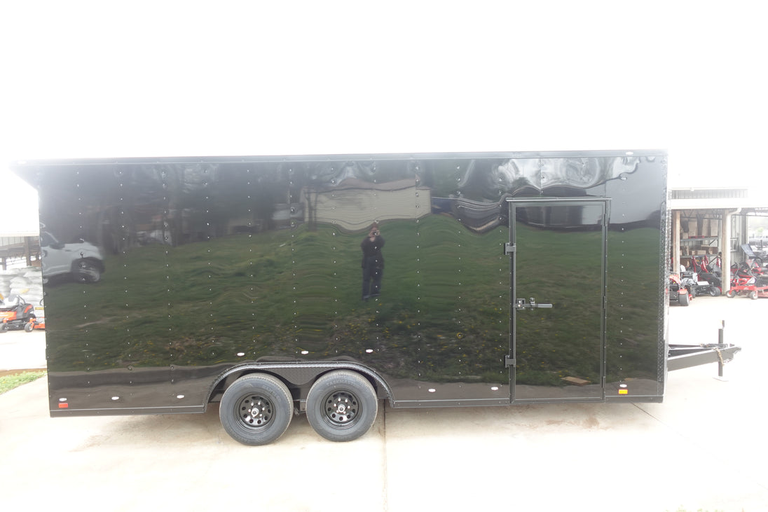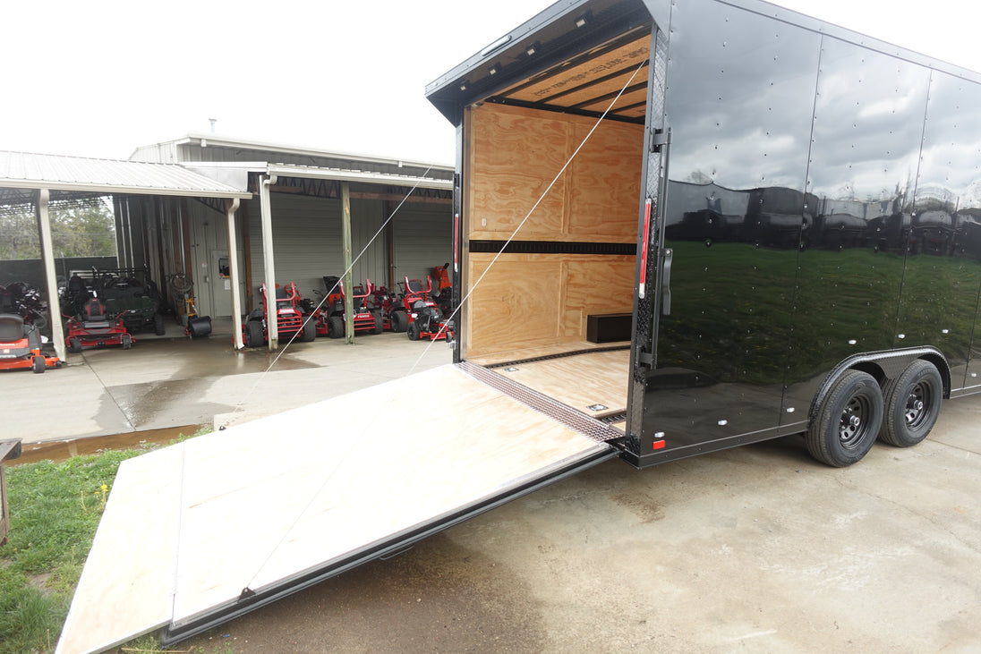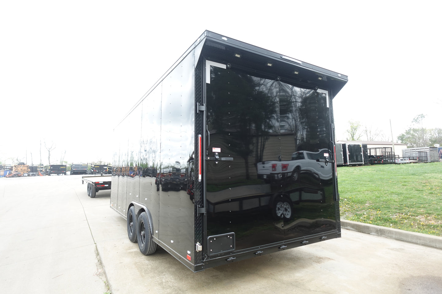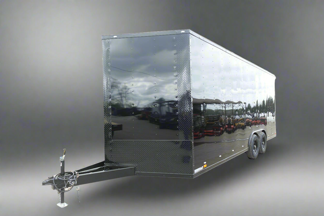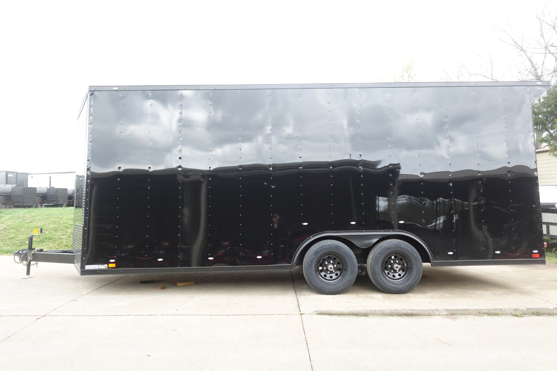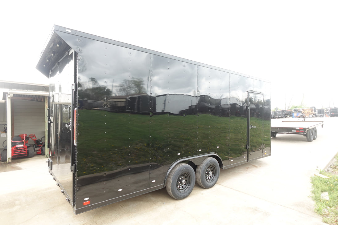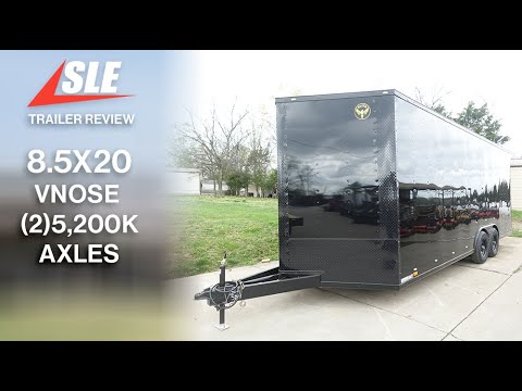 Turn heads with this 8.5x20 V-Nose enclosed trailer featuring a bold black exterior, blackout trim, and a 7'6" interior height for ample cargo space. Built for performance, it includes (2) 5,200lb axles with brakes, a spring-assisted rear ramp, E-track, and durable plywood flooring and walls. With sleek design and rugged construction, it's perfect for heavy-duty hauling with style and confidence.