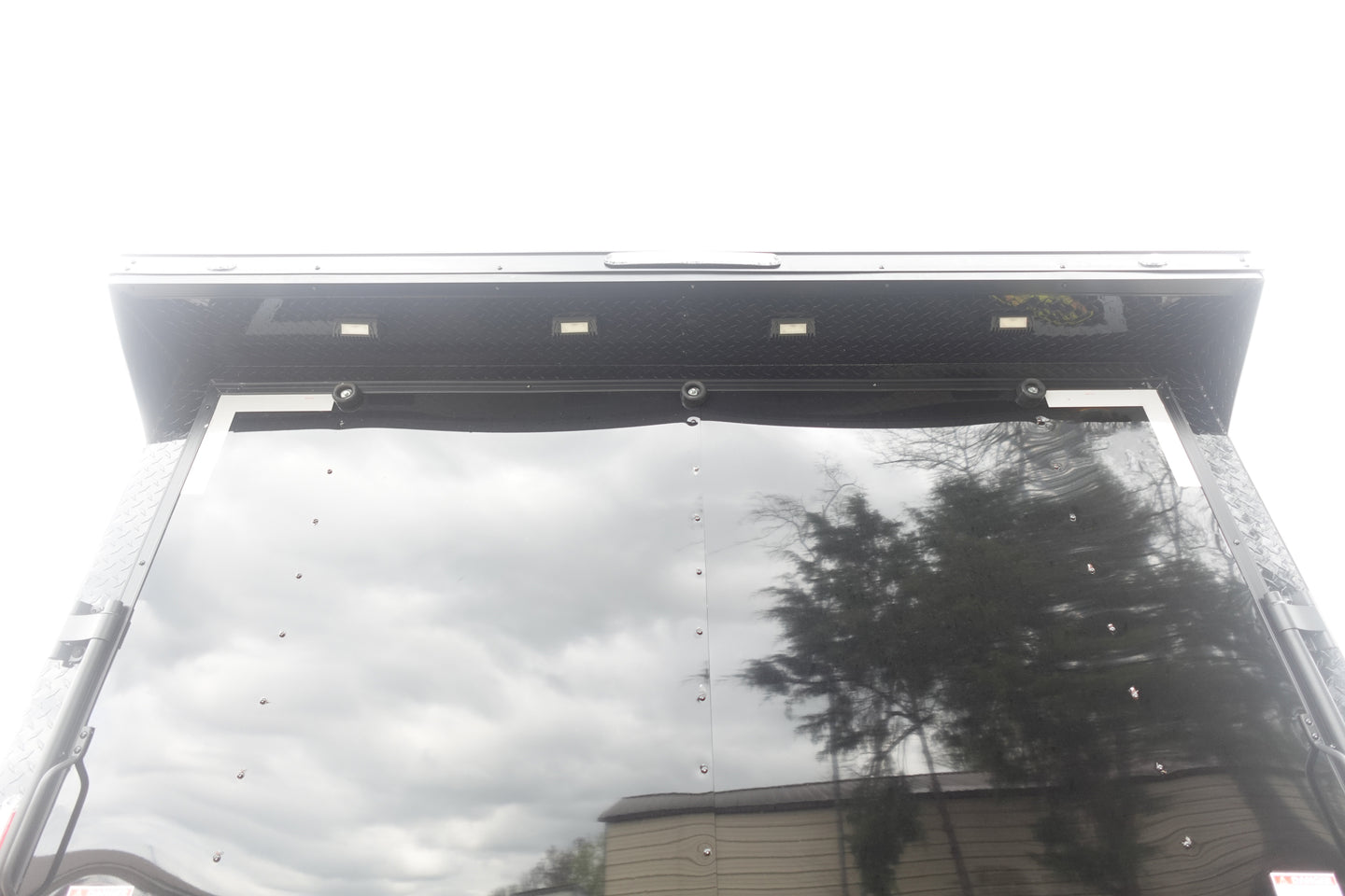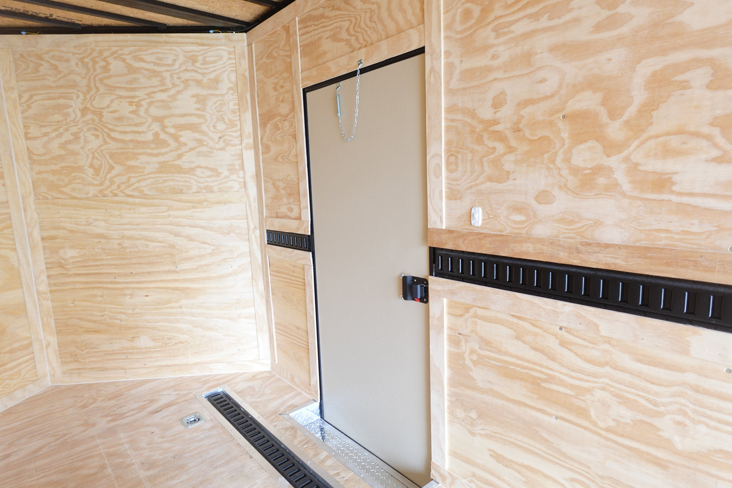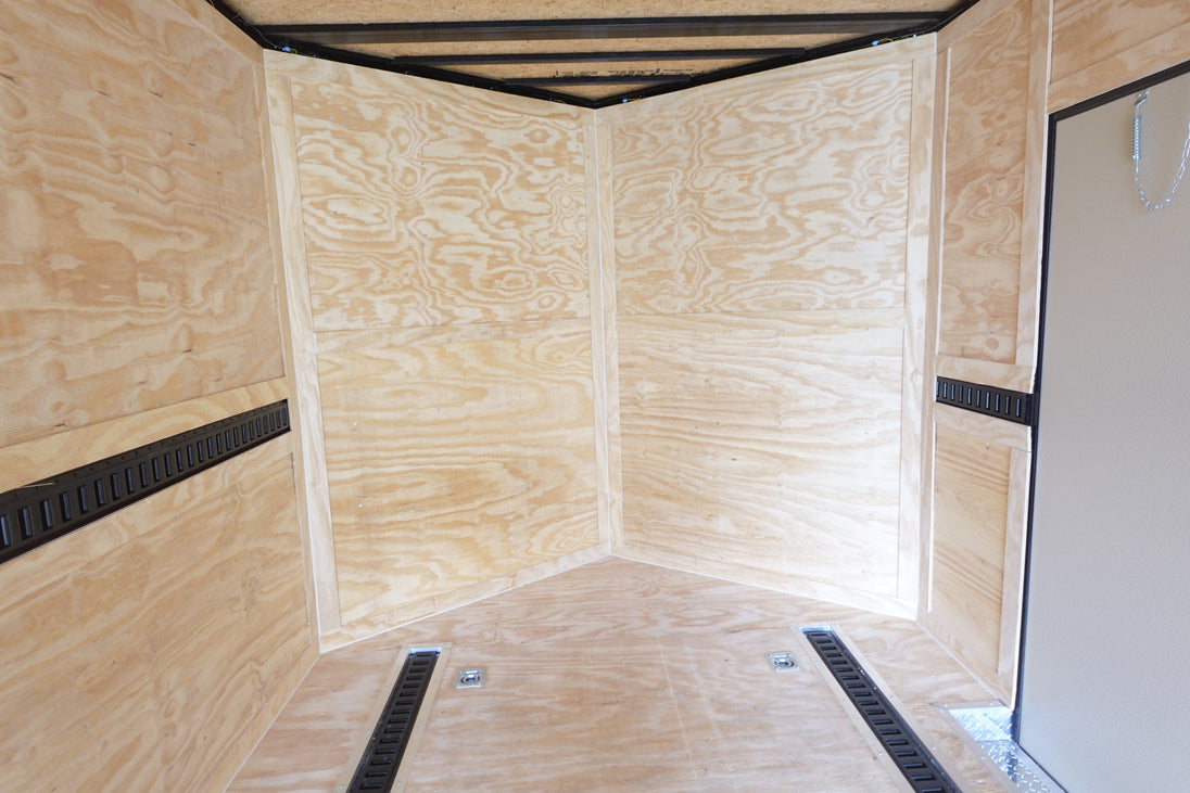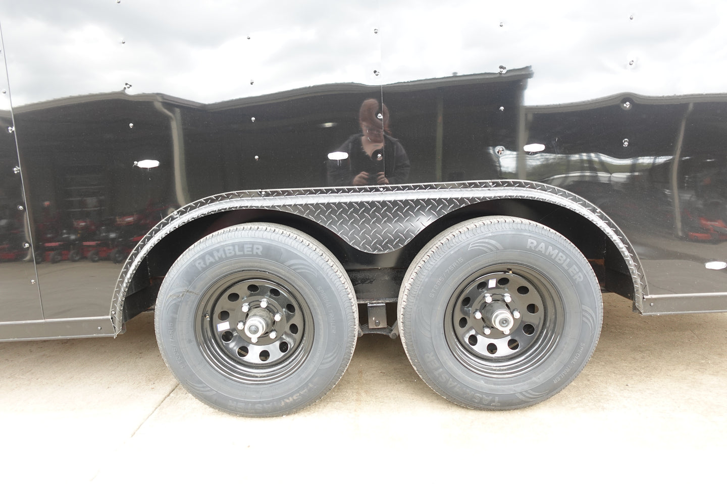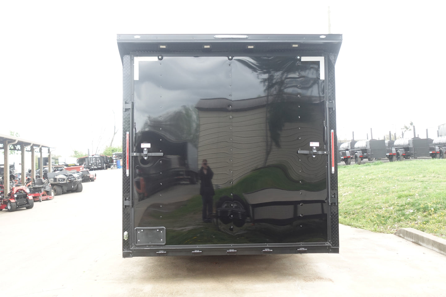 Turn heads with this 8.5x20 V-Nose enclosed trailer featuring a bold black exterior, blackout trim, and a 7'6" interior height for ample cargo space. Built for performance, it includes (2) 5,200lb axles with brakes, a spring-assisted rear ramp, E-track, and durable plywood flooring and walls. With sleek design and rugged construction, it's perfect for heavy-duty hauling with style and confidence.