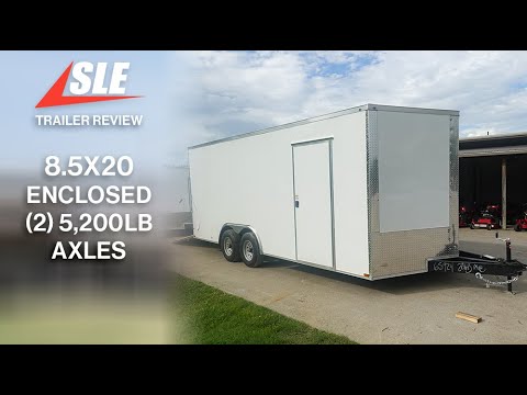 The 8.5x20 White Enclosed Trailer features dual 5,200 lb axles with brakes, a spring-assisted rear ramp, side entry door, 7' interior height, heavy-duty plywood flooring and walls, built-in air vents, D-ring tie-downs, interior dome light, LED drive lights, and a breakaway system for safe, versatile hauling.