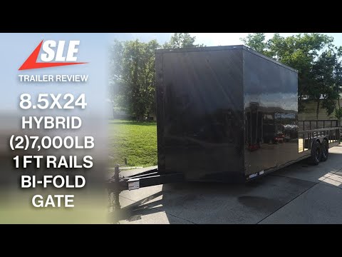 The 8.5-foot by 24-foot hybrid v-nose enclosed trailer is 16-feet of utility deck space and 8-feet of enclosed space with a black screwed exterior. This trailer comes with two greaseable 7,000lb axles.