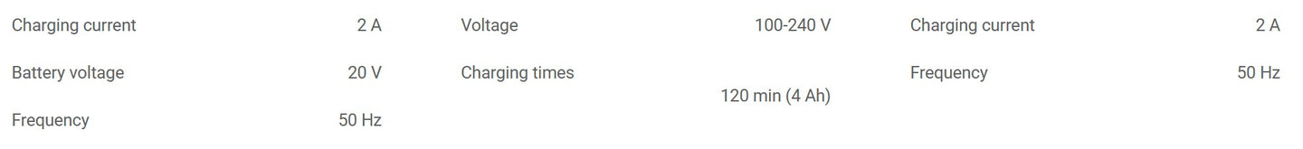 Charge Time: 60 min (2.0Ah) / 120 min (4.0Ah)