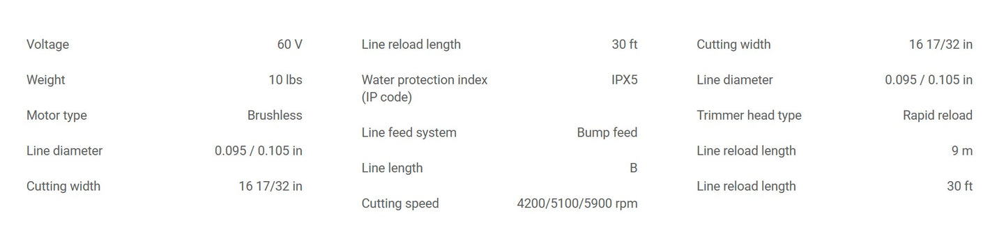 | HP/CC | Equivalent to a 35cc gas trimmer |