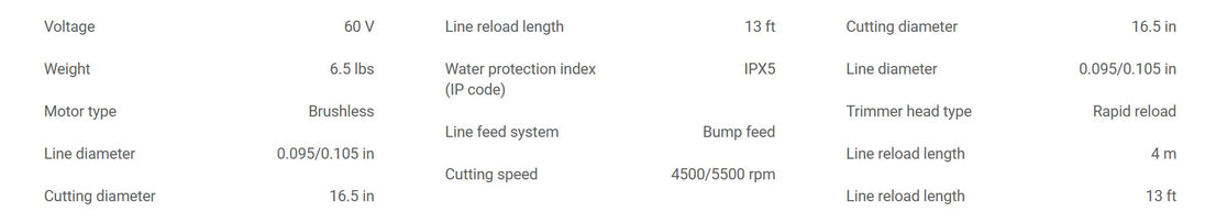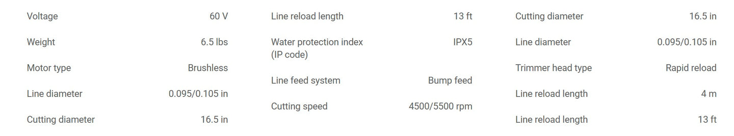 | Other | Battery: 60 V Line Diameter: 0.095/0.105 in Line Feed System: Bump Feed Line Reload Length: 13ft, 4m |