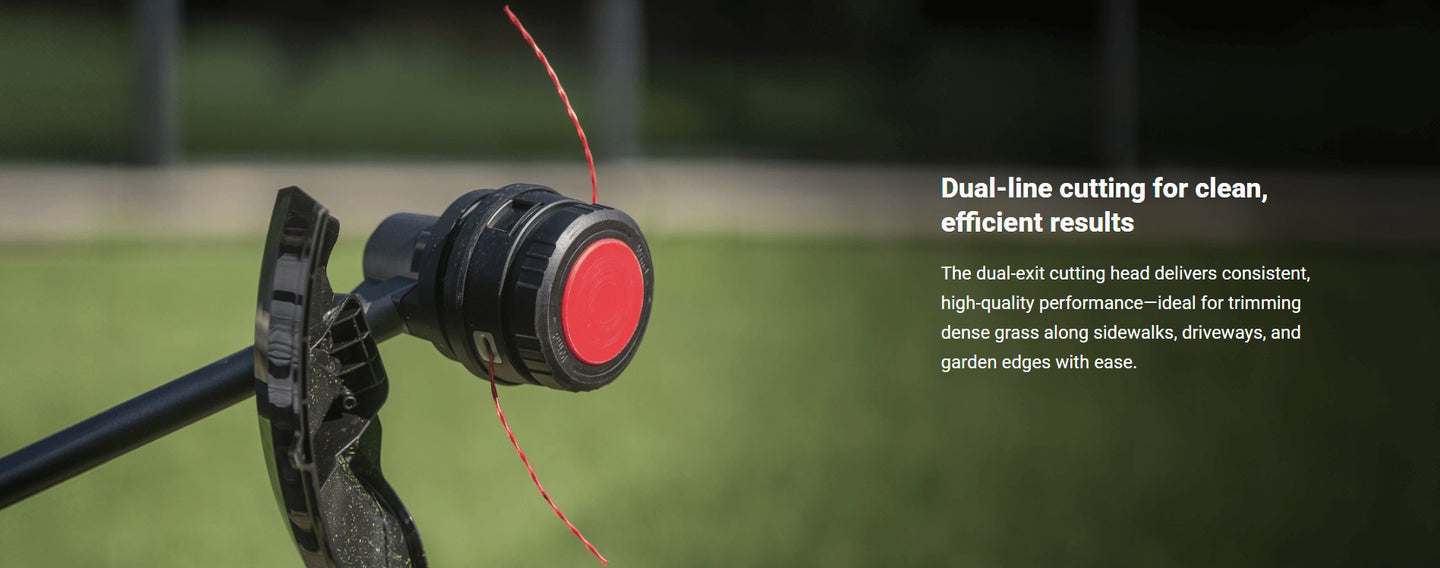 The wide 15" cutting swath paired with a durable .095” dual-exit line slices through grass fast, making fewer passes necessary for large or unruly areas.