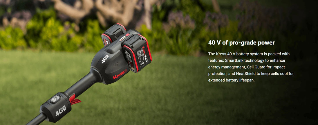 The Kress KG154 40V 15" string trimmer delivers 800W of cutting power without gas, cords, or fumes. With dual 4Ah batteries and a wide 15" cutting swath, it’s ideal for trimming and edging large areas efficiently. Features like ECO mode, a quick-load bump feed head, adjustable handle, and durable aluminum construction make it reliable and easy to use. Compatible with all 20V and 40V KrossPack batteries.