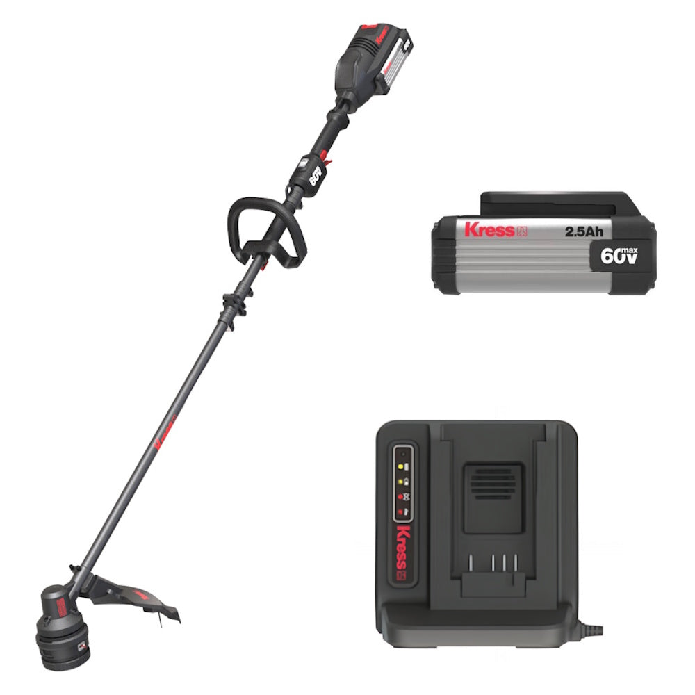 The Kress KG160 60V 16" Brushless Line Trimmer delivers gas-like power with zero emissions. It features a 0.95 kW motor, dual-line cutting, quick-load head, bump-feed system, and adjustable speed control. Built for pros, it includes an ergonomic handle, durable aluminum head, and comes with a 2.5Ah battery and 3A charger.